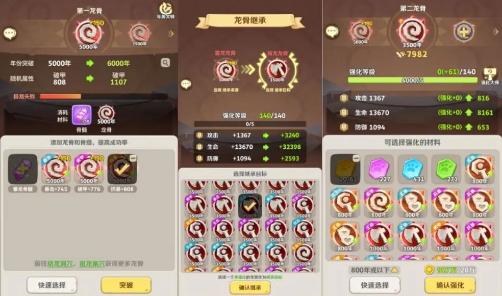 较为长线的养成玩法,玩家在后期可以通过消耗龙髓和龙骨,为5000年以上的龙骨进行龙骨突破,提高其龙骨年限,最高提升至一万年,并且解锁宠物技能极为珍贵的第五级效果,再次为宠物带来巨大的技能特性改变;建议在获取足够龙髓后再进行突破,避免突破失败导致资源浪费