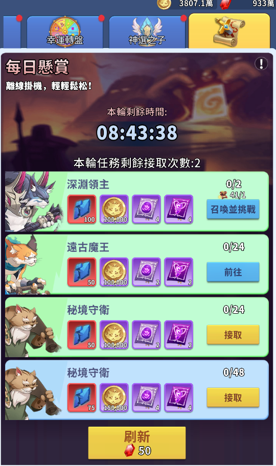 2、每日悬赏 -免费(记得刷新 ,品质越高 碎片越多 )