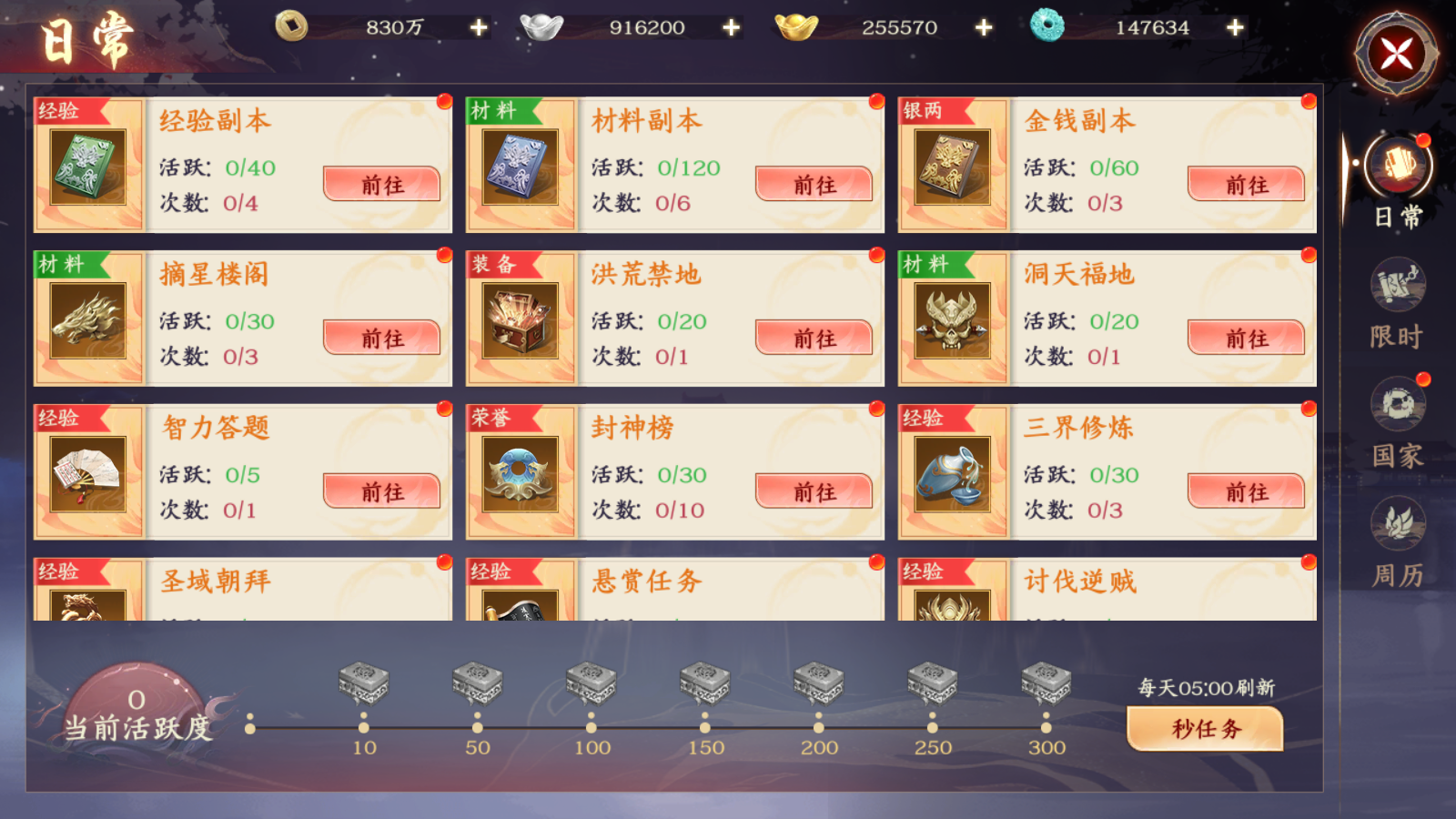 【主线任务】-【封神试炼】-【刺探+观星+讨伐】-【经验副本】-【修炼】-【押镖+粮草】