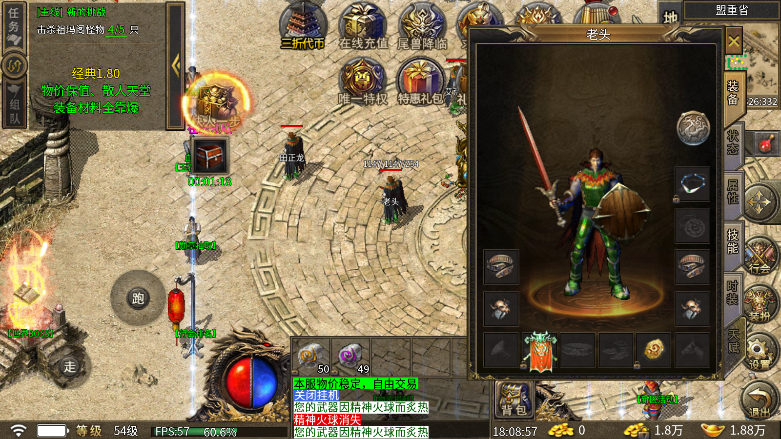 充值比例1元:10000游戏货币 ★开局福利:开局送运7武器,运3项链,职业技能书 ★在线奖励:在线5分钟送自动回收、仓库扩充 等 ★特殊首杀:特殊首杀神兽,送充值卡 ★自由交易:复古打金服,道具自由交易,开通世界求购功能 ★散人天堂:经典复古版本,物价保值,装备材料全靠爆 ★3折福利:永久内置3折福利 ★后缀说明:180复古传奇,游戏内开放拍卖场功能,玩家可自由交易。