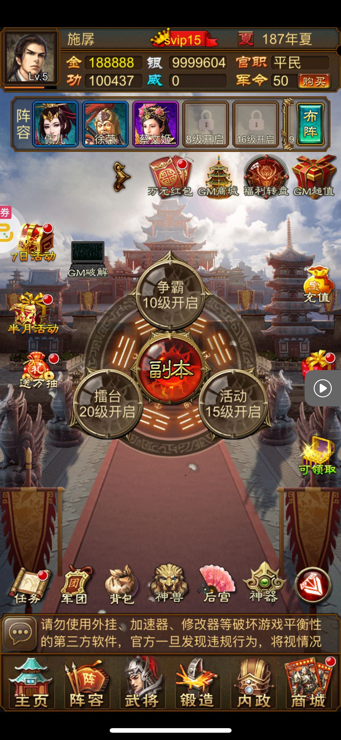 充值比例1元:2000元宝 ★上线福利:SVIP15,188888元宝,千万铜钱! ★官方正版三国卡牌,充值永享0.1折! ★上线即送SVIP15,188888元宝,千万铜钱! ★内置专属GM工具,闯关即可累积额度,直接兑换游戏内货币! ★GM商城全场1金币购买,层次越高,道具越豪华! ★升级即送20000元真充卡,体验真正的白嫖逆袭! ★每日登录免费领取数百次福利抽奖,海量道具免费抽! ★后缀说明:全场永享0.1折,创角即送全部红将!