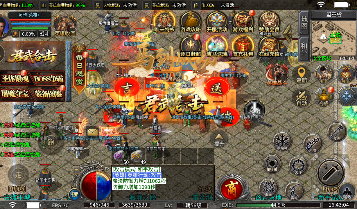 充值比例1元:10黄金 ★【起步好礼】自动拾取、自动回收、免费泡点 ★【免费赞助】打怪免费激活赞助会员 ★【吉马送瑞】寻宝转盘好礼抽抽抽 ★【还有更多】七日签到、在线奖励、等级奖励... ★【后缀说明】君武马年献瑞英雄合击版本