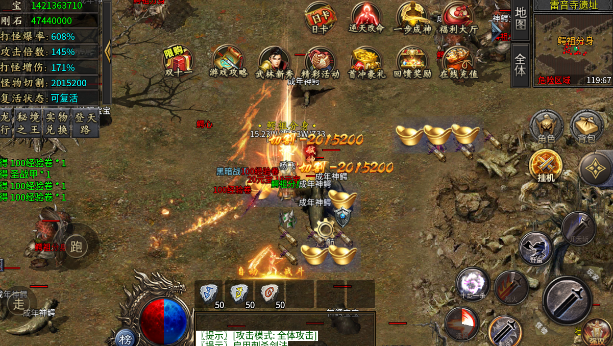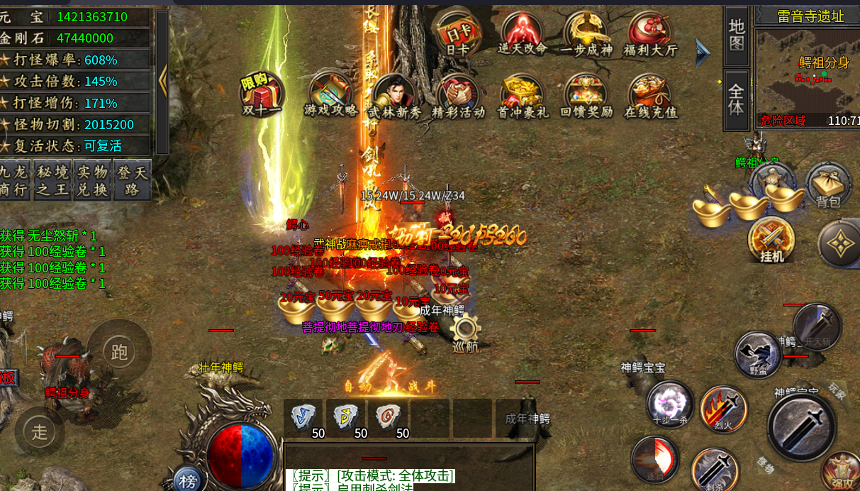 充值比例1元:1000金刚石 ★【上线即送】自动回收、全图传送、轮海秘境、囚牛图腾、真充红包! ★【充值返利】充值比例1:1000,实物兑换免费累充! ★【登天之路】全新特色登天路剧情任务! ★【秘境之王】击杀BOSS获得积分,高爆强力背包专属神器! ★【首爆奖励】打怪领首爆,货币全靠打,首爆奖励领不停! ★【跨服战场】兄弟激情,集结沙城,热血征战! ★【后缀说明】全新小刀专属剧情特色免费打累充专属沉默版本
