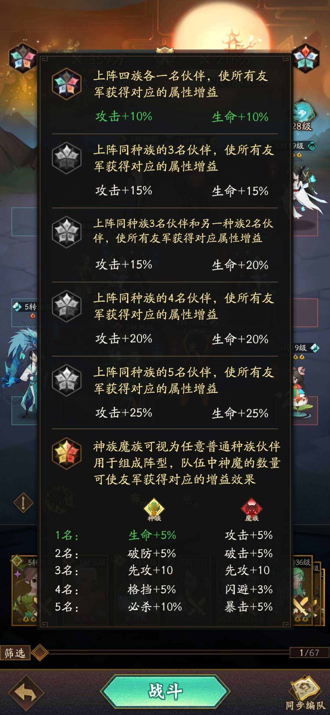 种族加成:当上阵的伙伴达到指定人数后会为全队增加额外的属性增益,神魔两族可等效任意普通种族,同时还有额外的上阵属性加成,可在主角的详情页面点击种族图标将主角的种族在神魔二族间切换。
