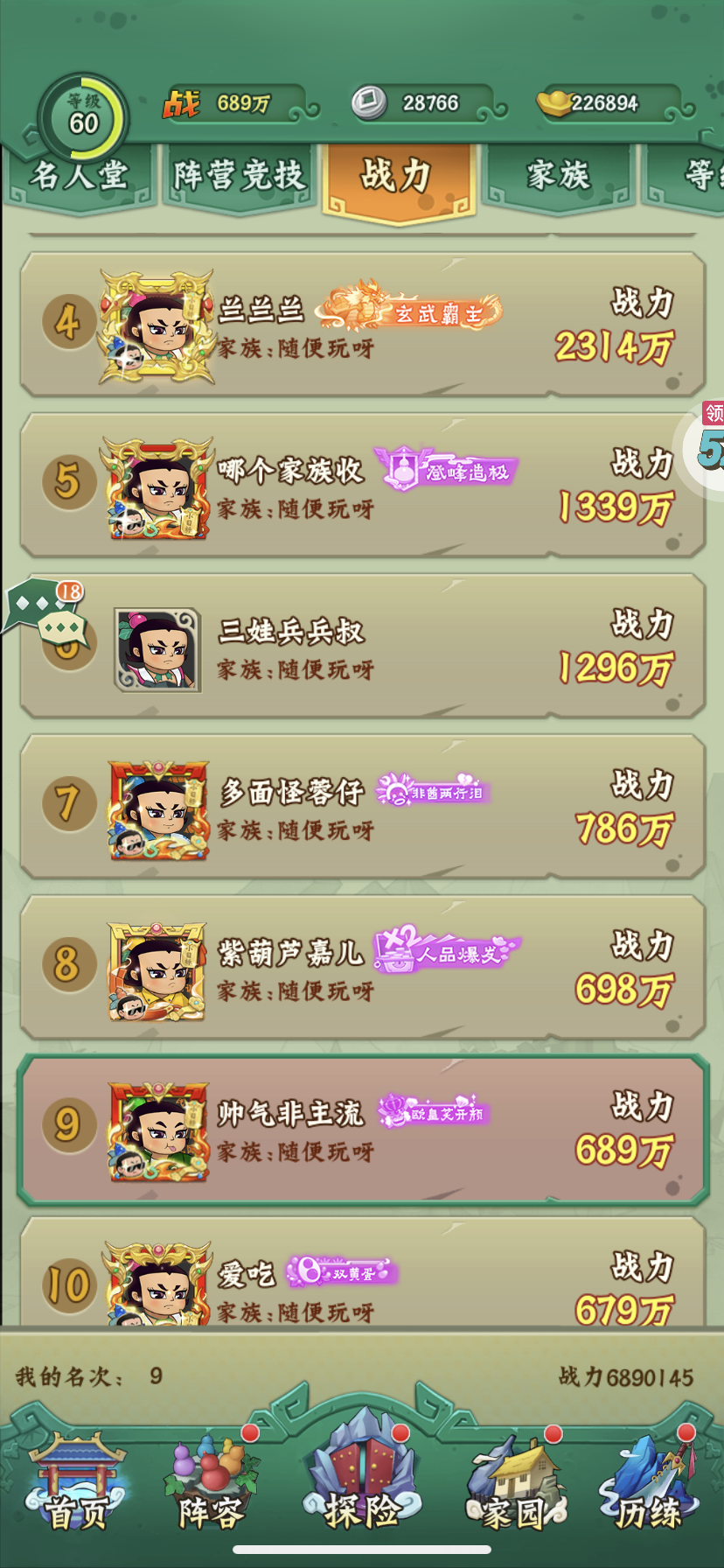 战力10亿,名人堂第三名,竞技场第二名