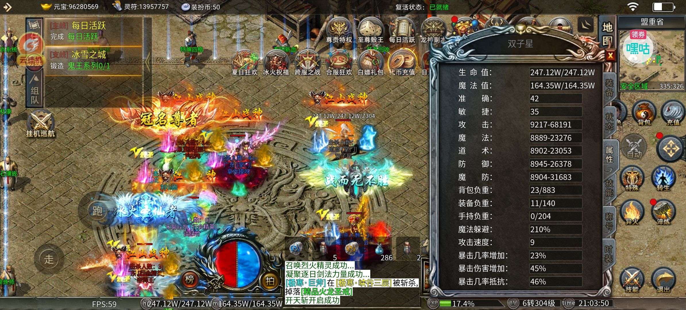 顶级装备,顶级时装,顶级生肖,代币还有2700多,属性好,称号多。小神魔满,大神魔9,随时可以满,基本称号都满。变身攻击141万