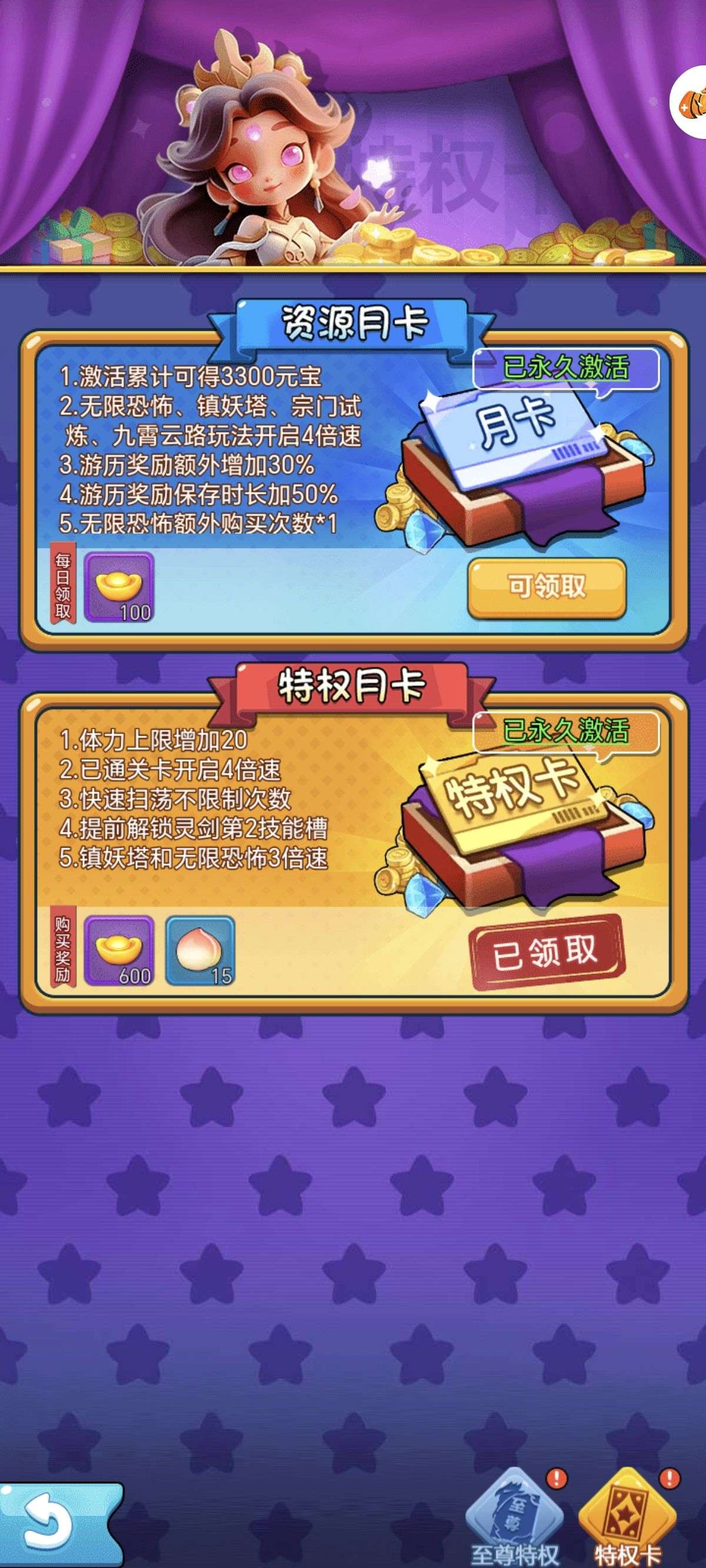 首充特权卡都开了,背包里还有时装自选和充值劵
