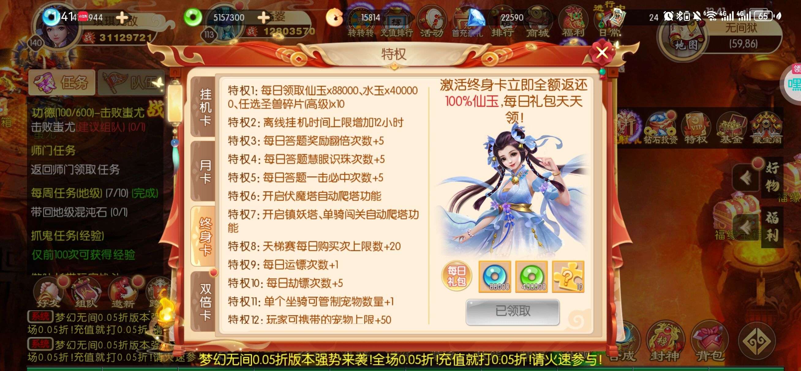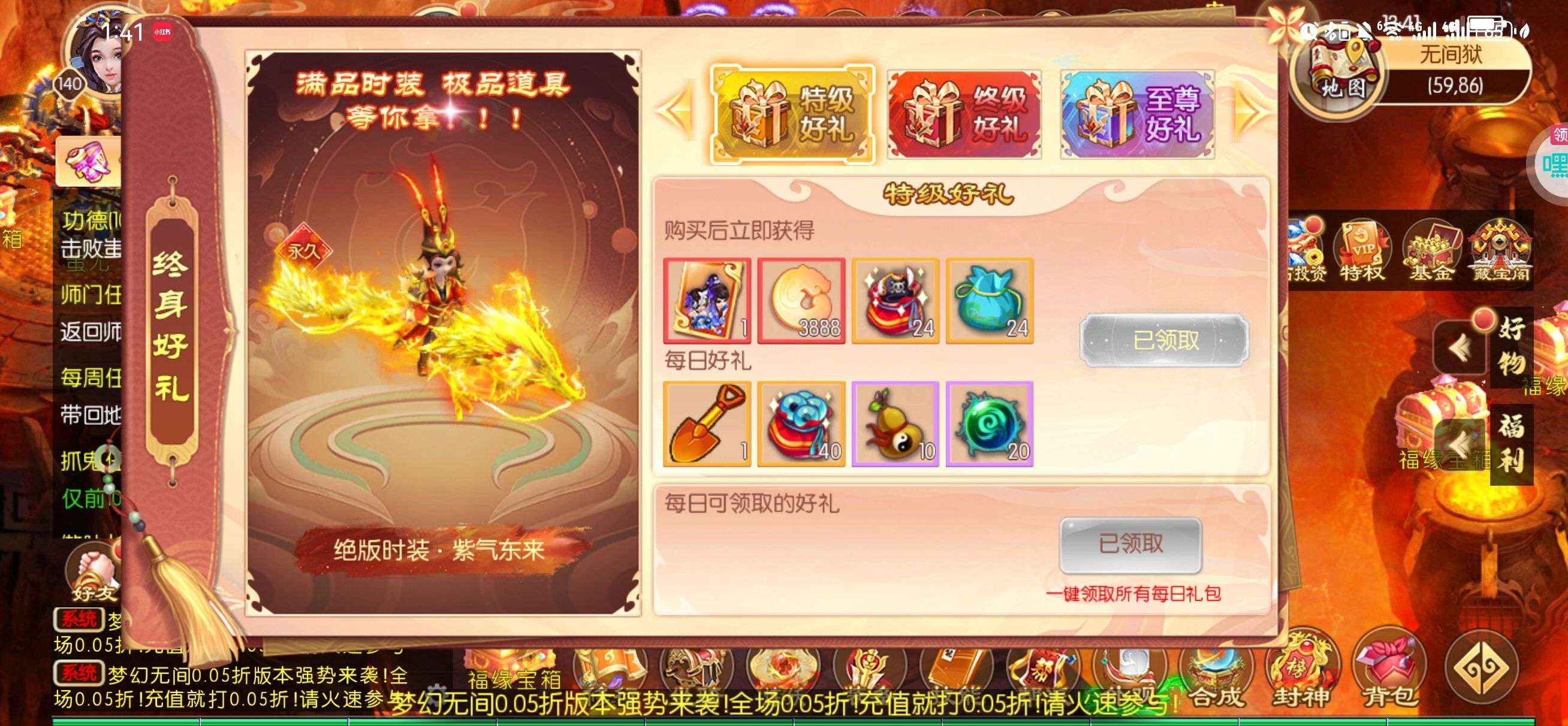 全套140级彩装,孟婆差五十块5觉,现在带3彩装,特权全买了,基金也全买了,终身买到特级,这个可以省你很多钱