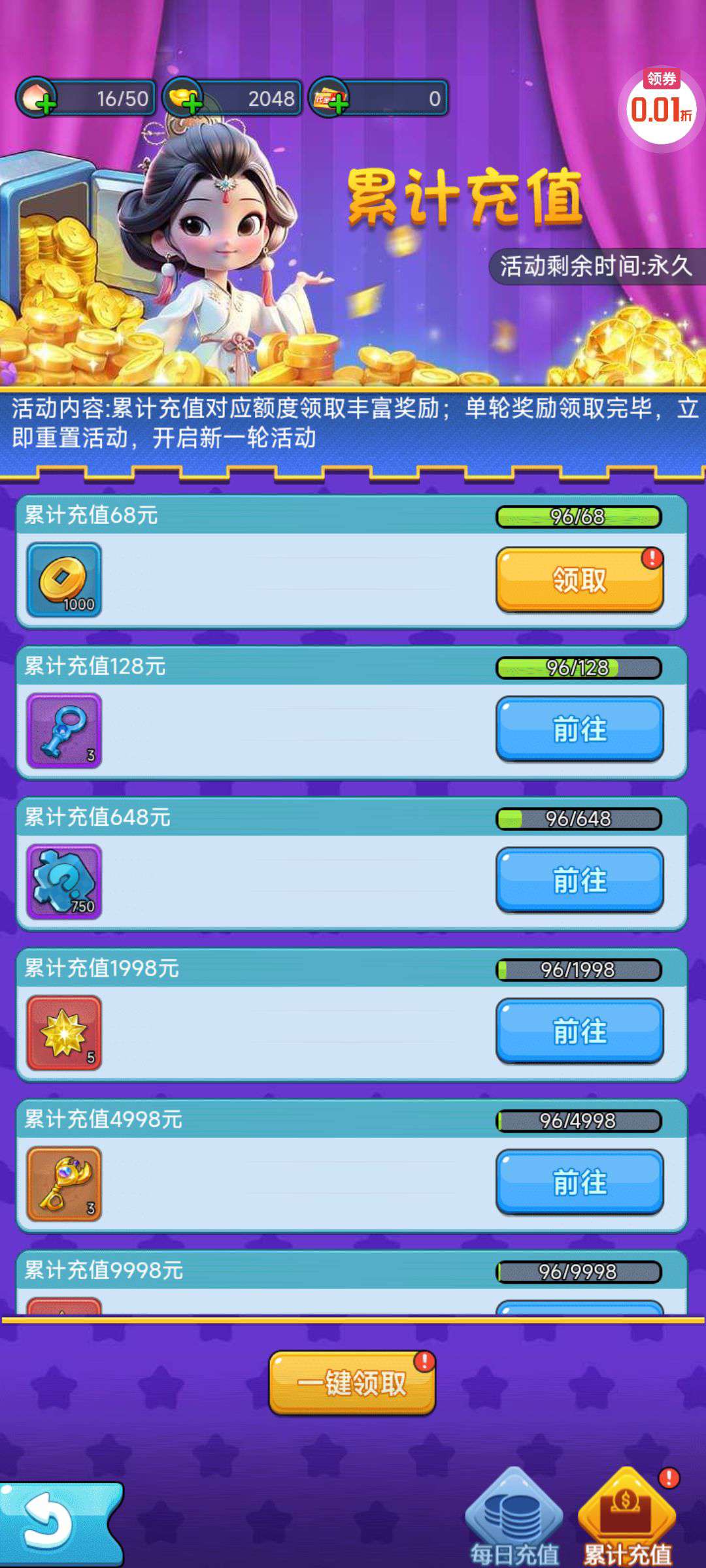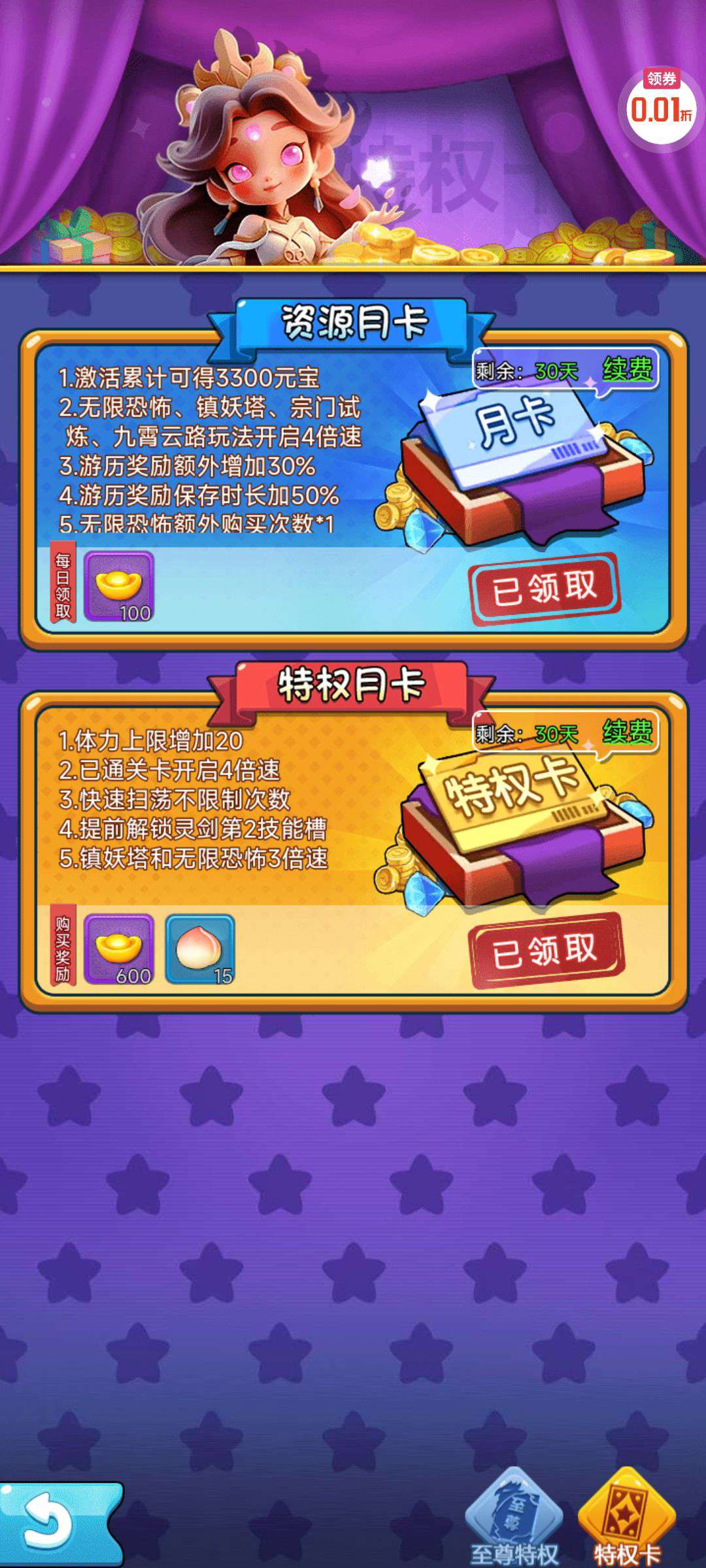首充特权卡都开了,背包里还有时装自选和充值劵