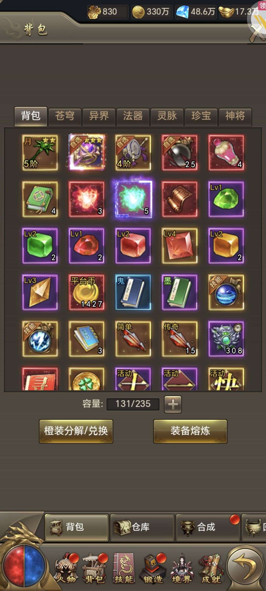 号里有一千多的平台币,材料有挺多没用。元宝,砖石有不少。4亿多的战力。