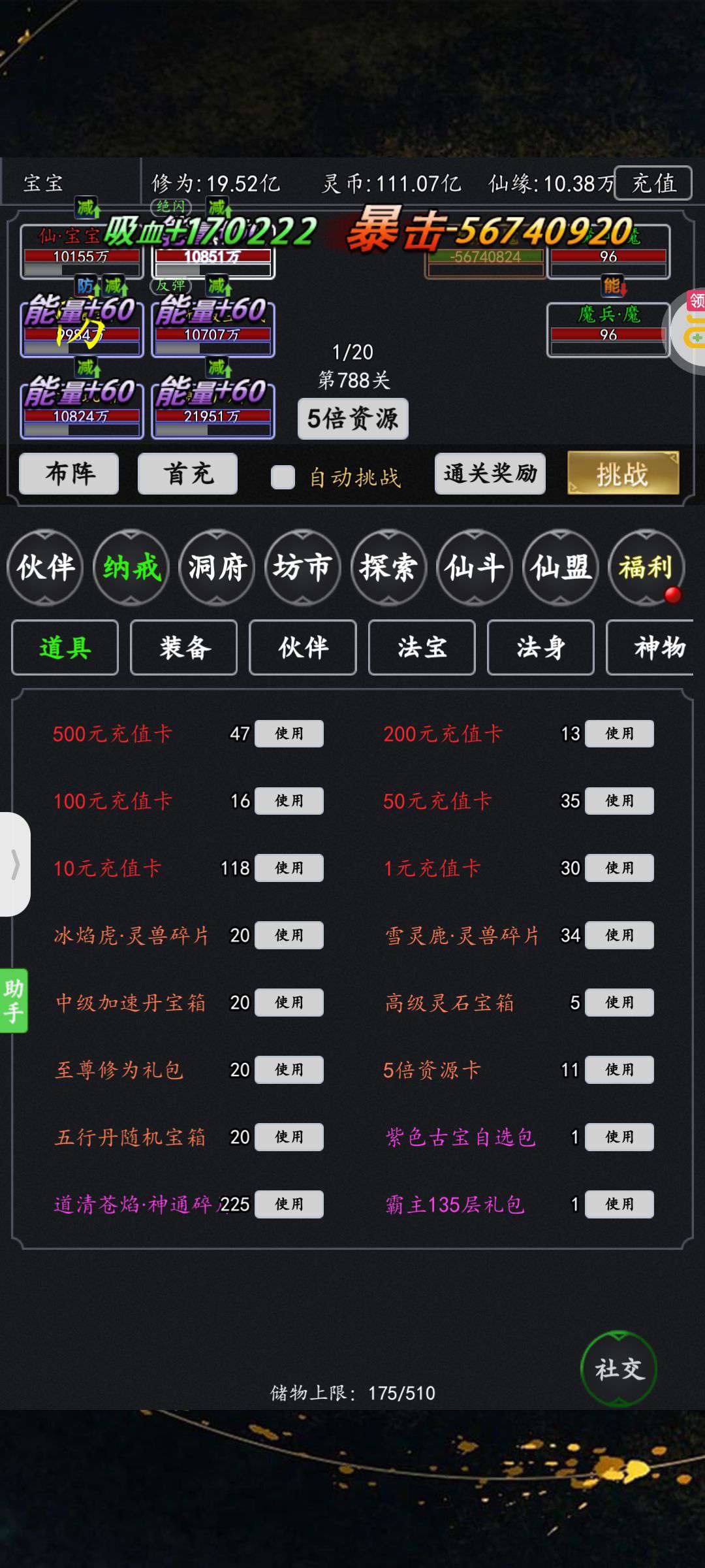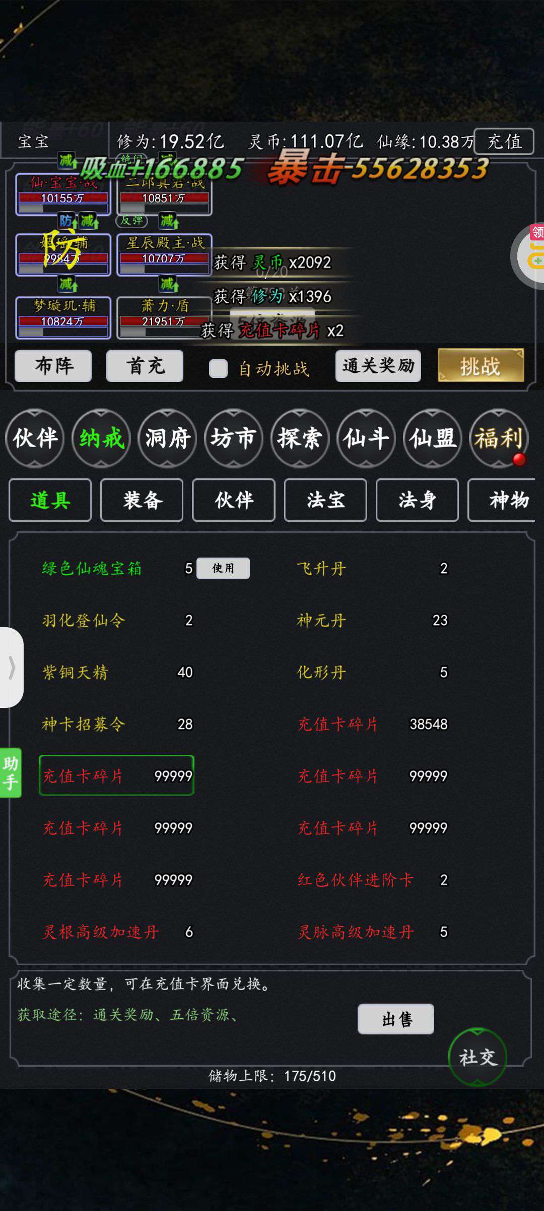 10万仙缘!47张500元充值卡!13张200元充值卡,其他充值卡也有。金色伙伴萧力,姬瑶,二郎真君,梦璇玑,星辰殿主,百草道人,火域公主,红萧力和舞蛇姬,750多天晶