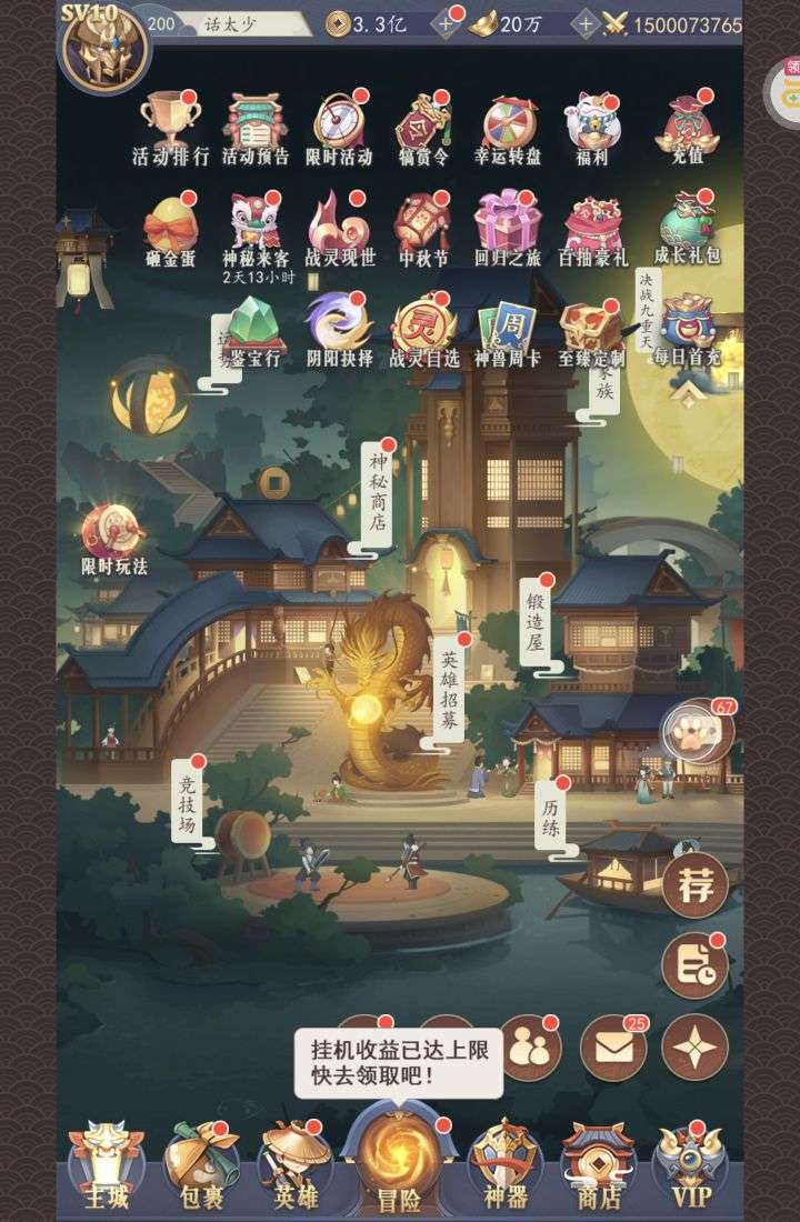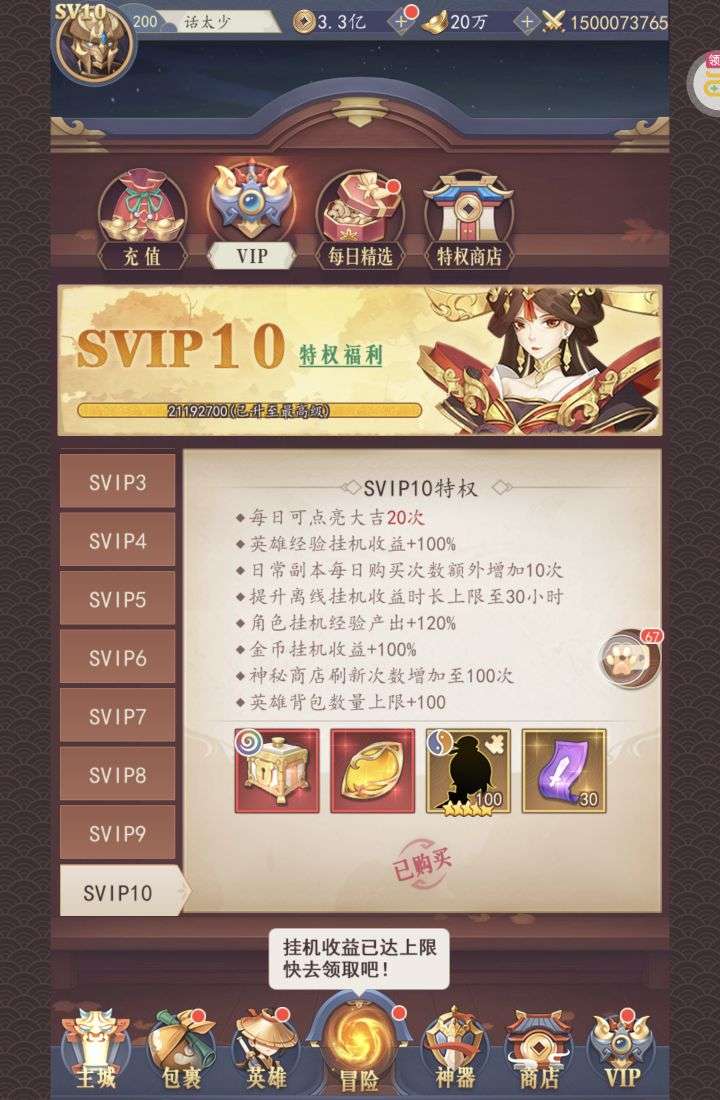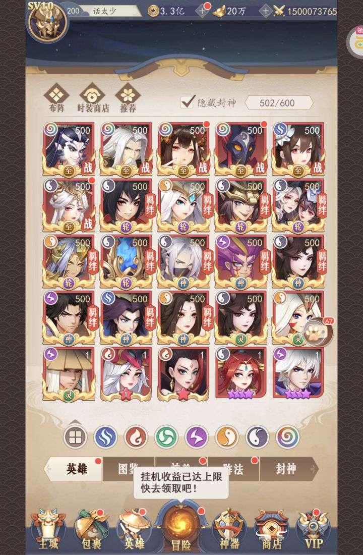 玩了几个月,SVIP10(最高级别),370级轮回境妲己,400级神魄境申公豹,400级神魄境姜子牙,390级神魄境魔妲己,360级灵动境妇好,355级灵动境孟婆