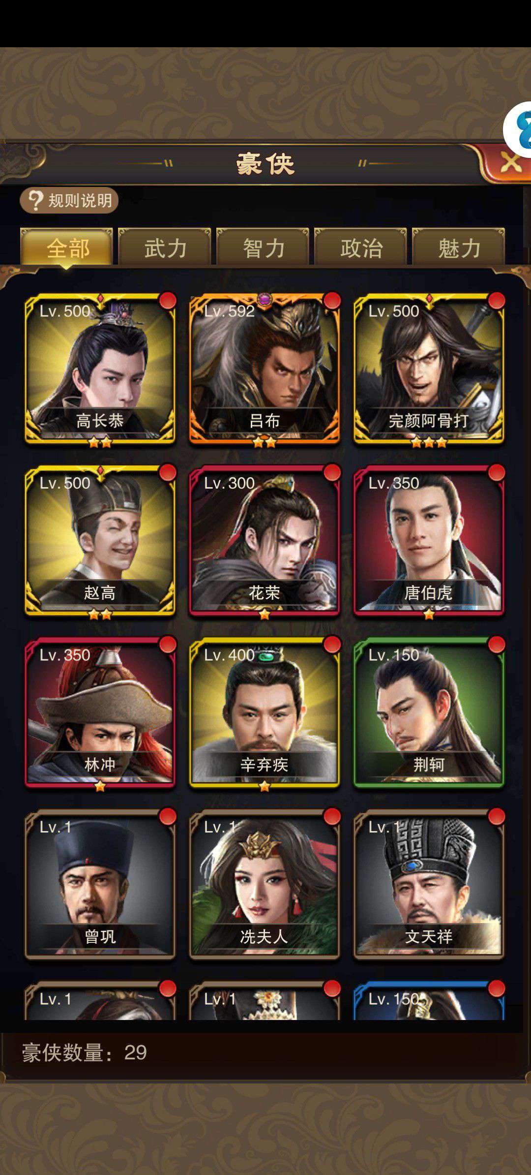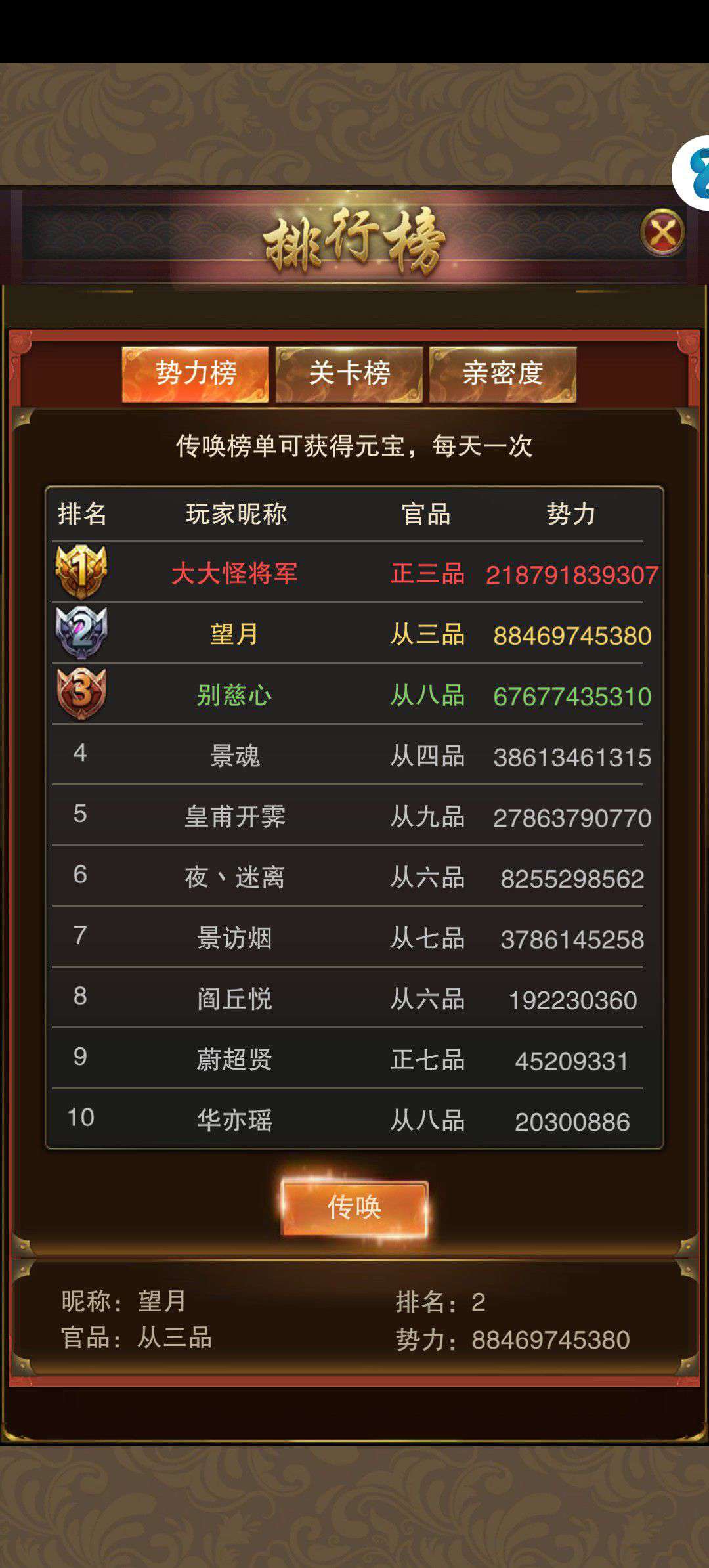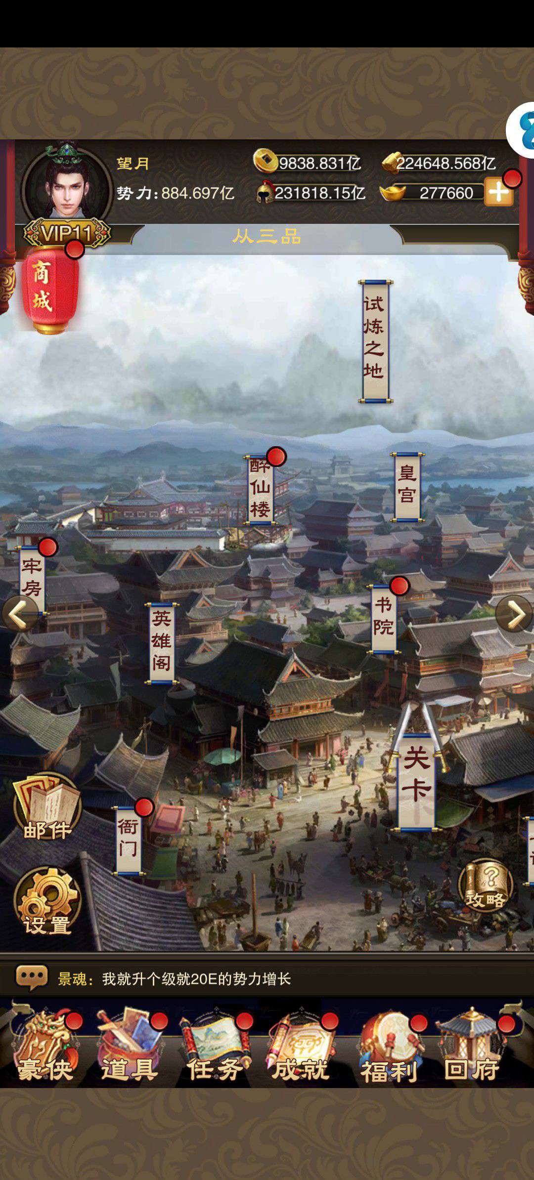 红颜50亿亲密跨服拿榜轻轻松松,账号vip15,门客目前加满3个,背包东西众多。