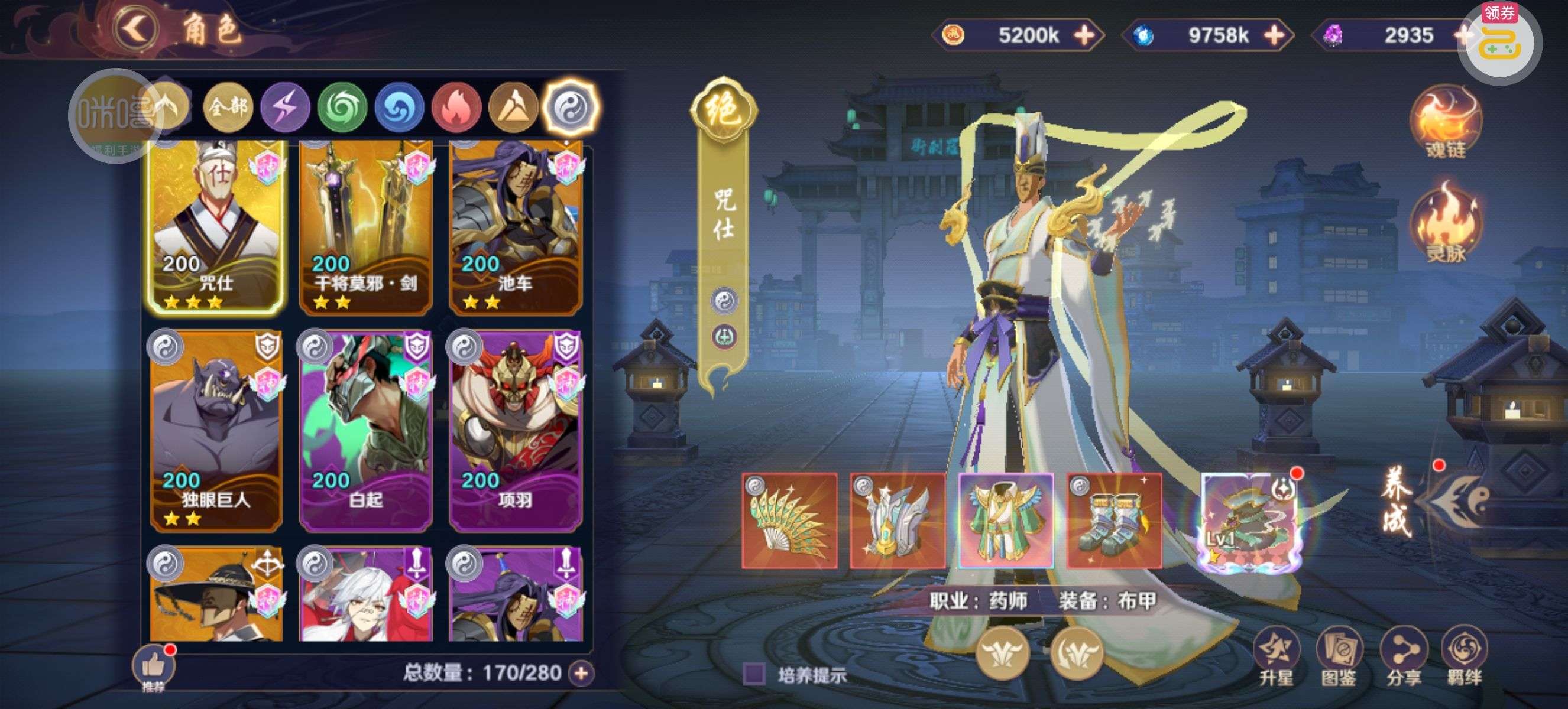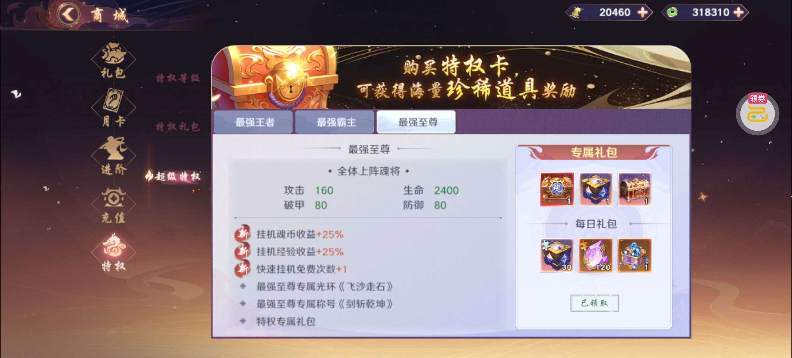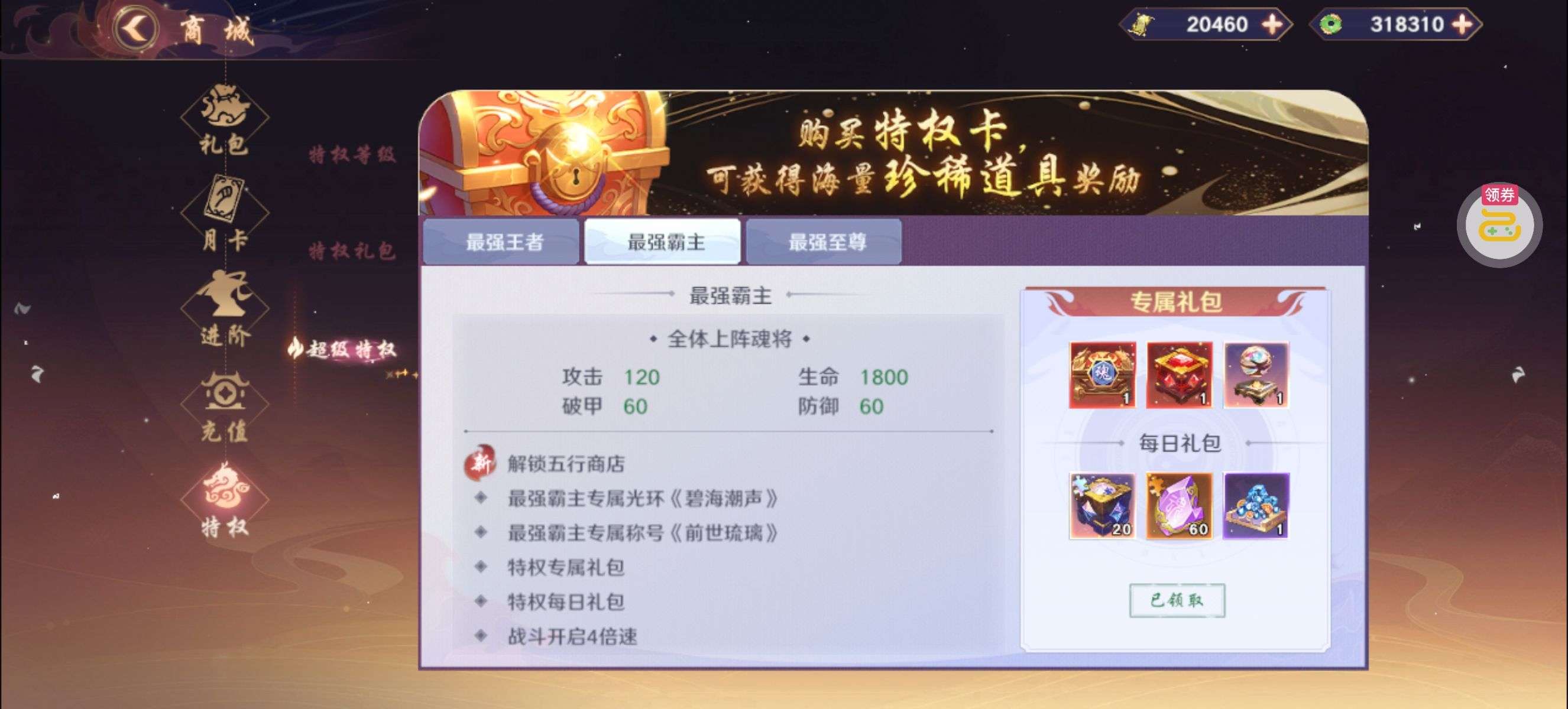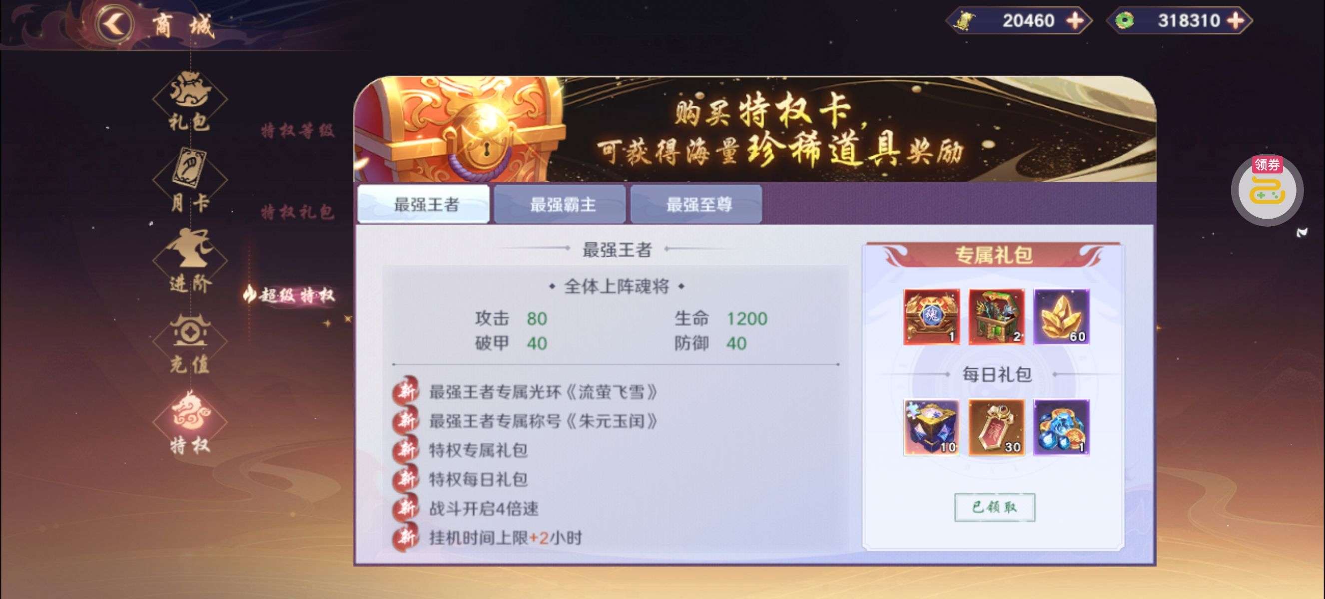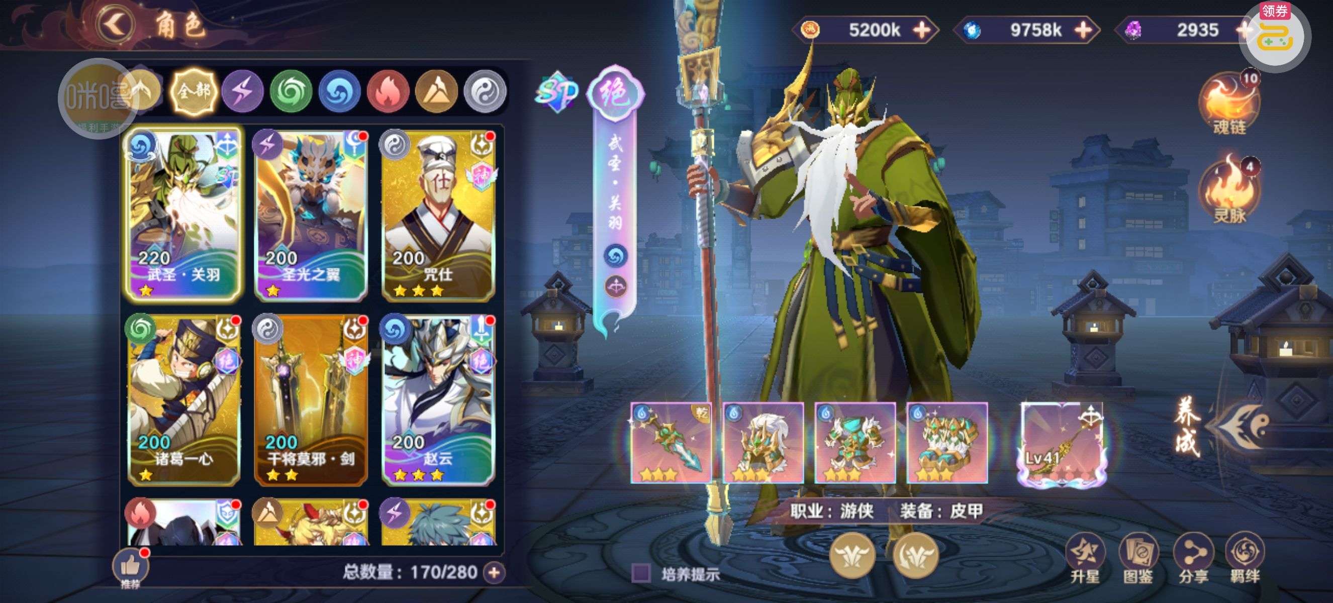 背包还有3个关羽本体,2万破晓币不是限时的一直没花,新区随活动弄了点神卡,主要氪金都在关羽身上,特权全开