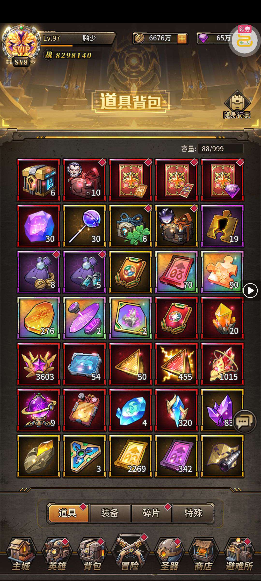 魂晶*888,魂师召唤券*10,武魂水晶*5(每个账号限领一次)