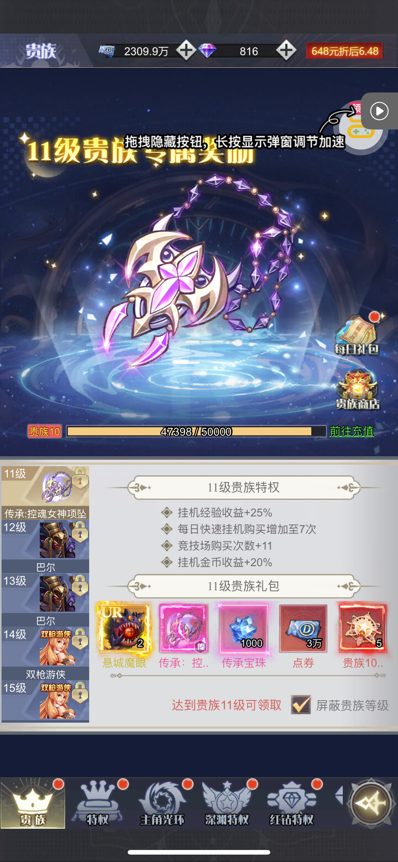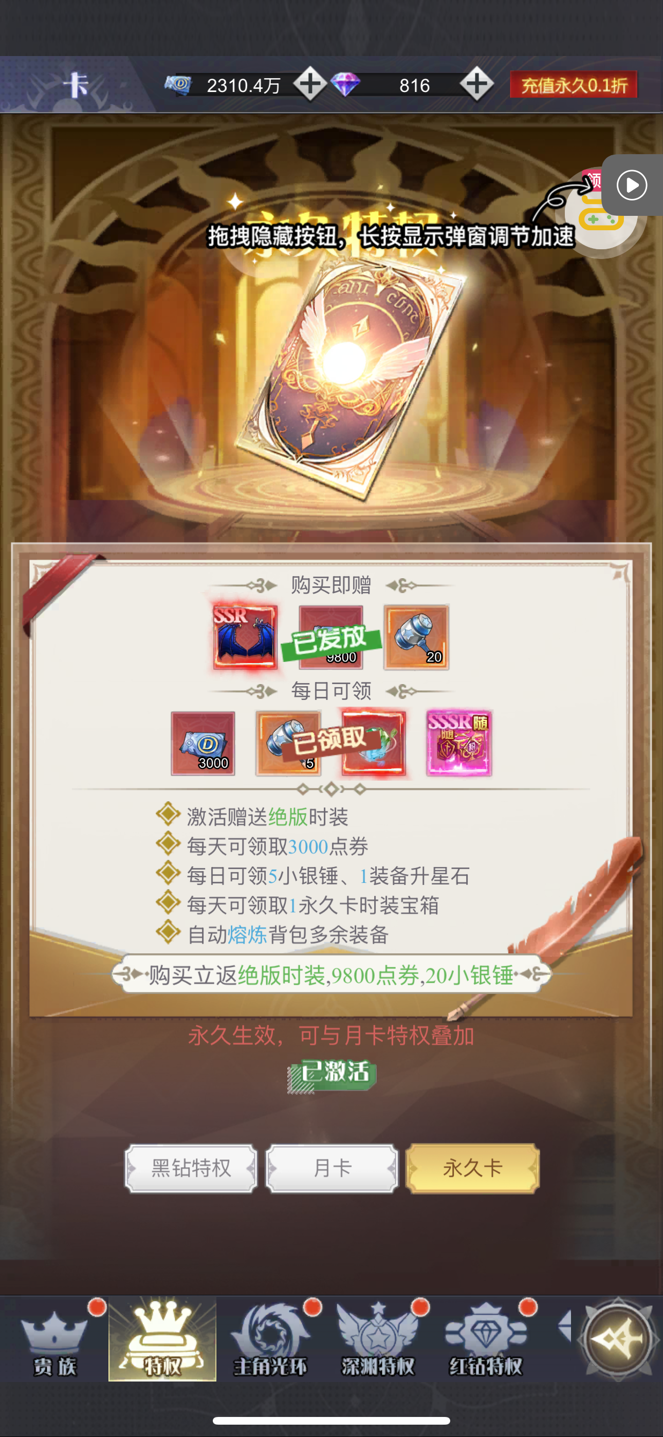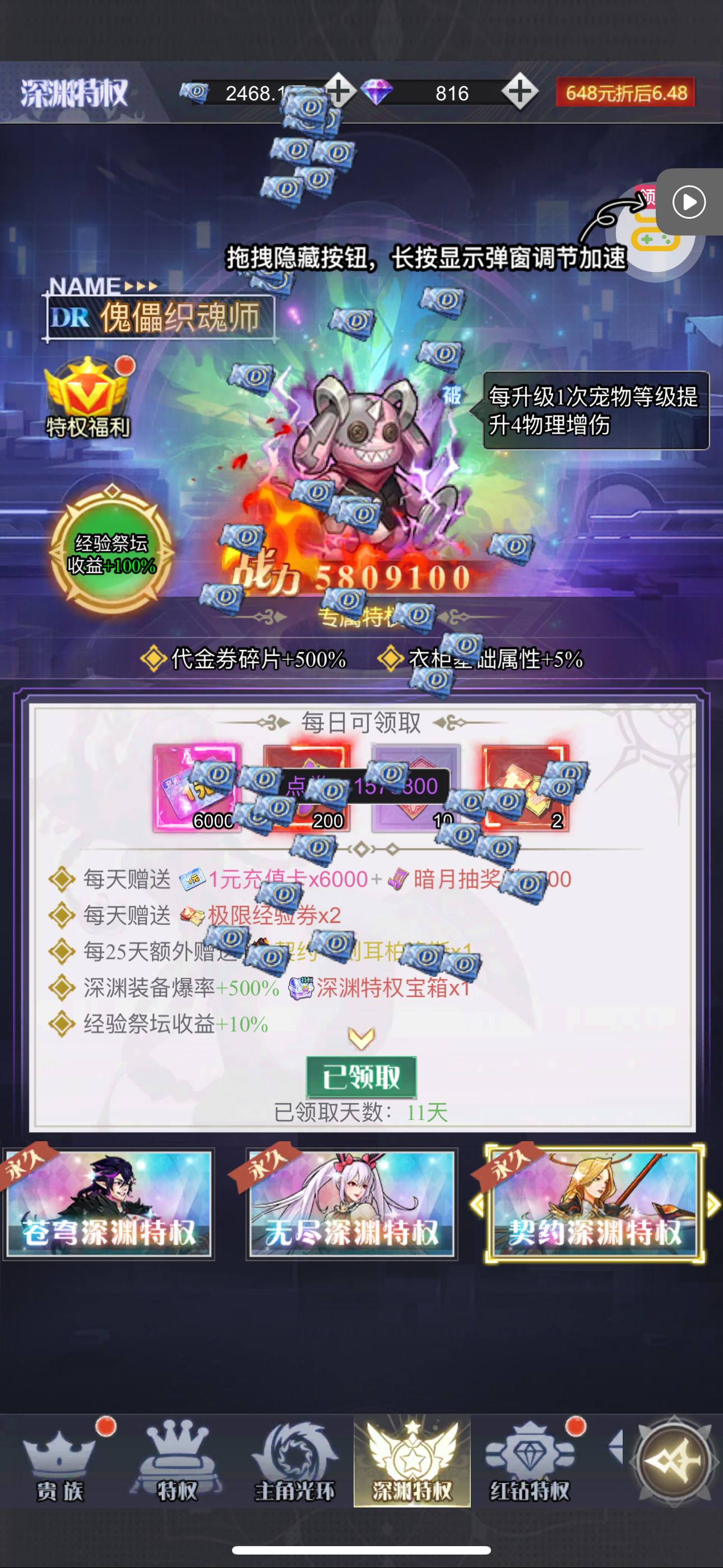 深渊契约,特权都开了,一键买断,贵族11,深渊特权全开。背包里东西多多。完了几天就没玩了