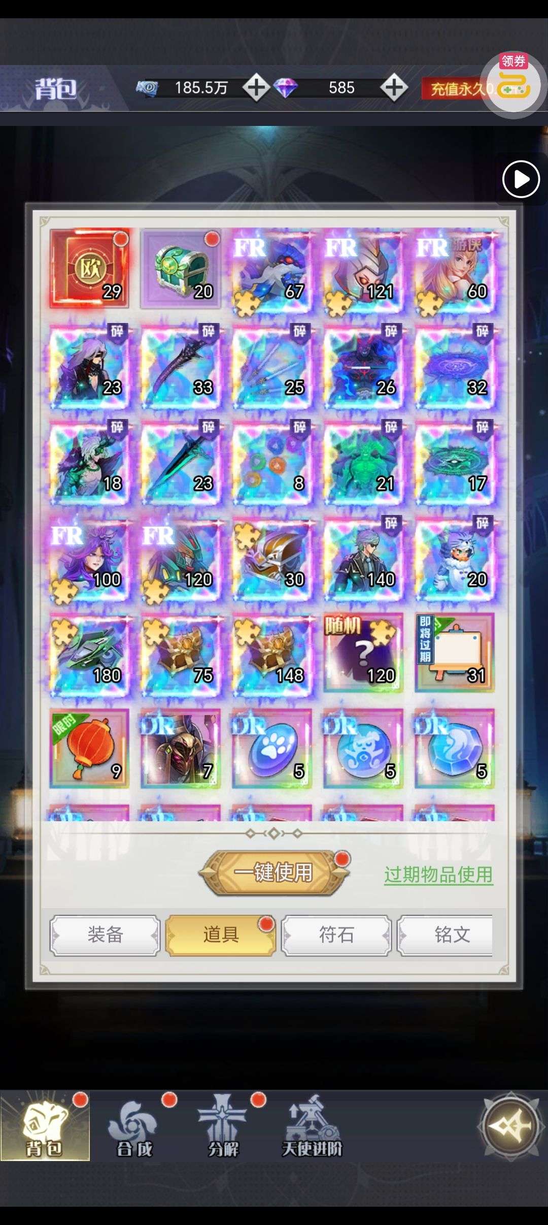 深渊契约,特权都开了,一键买断,贵族11,深渊特权全开。背包里东西多多。完了几天就没玩了
