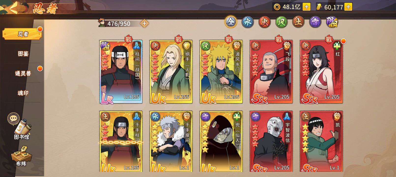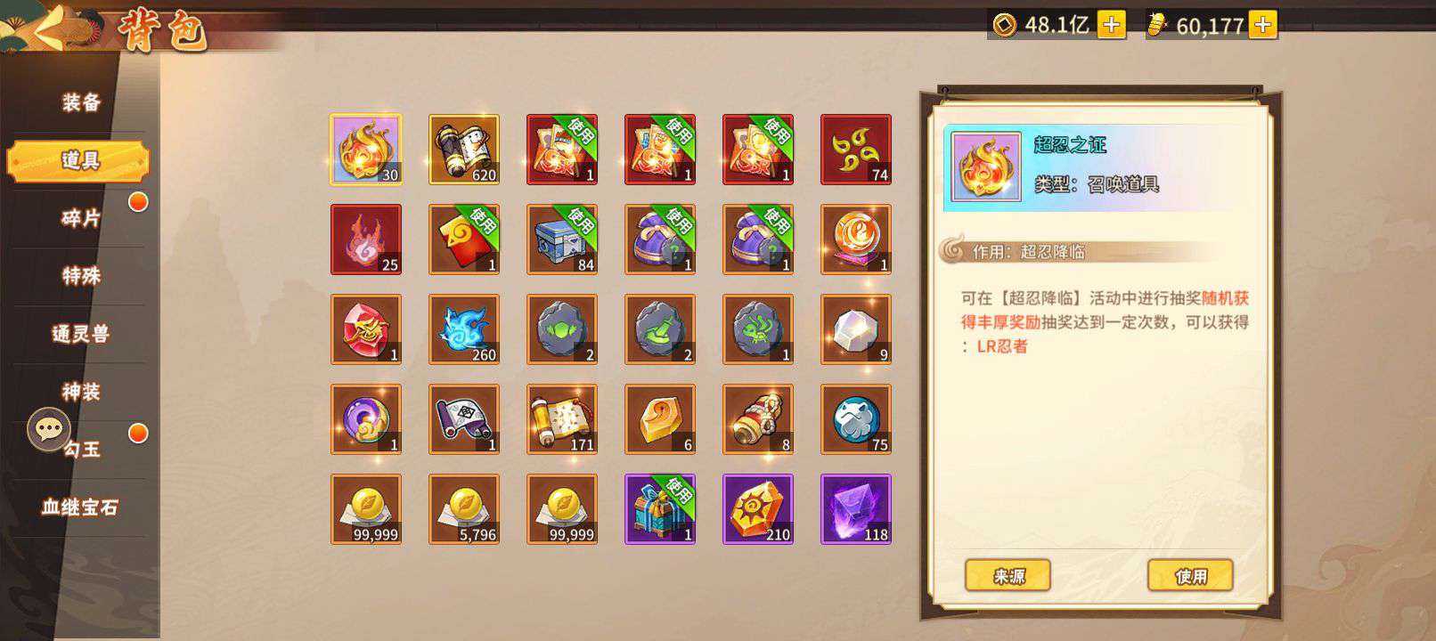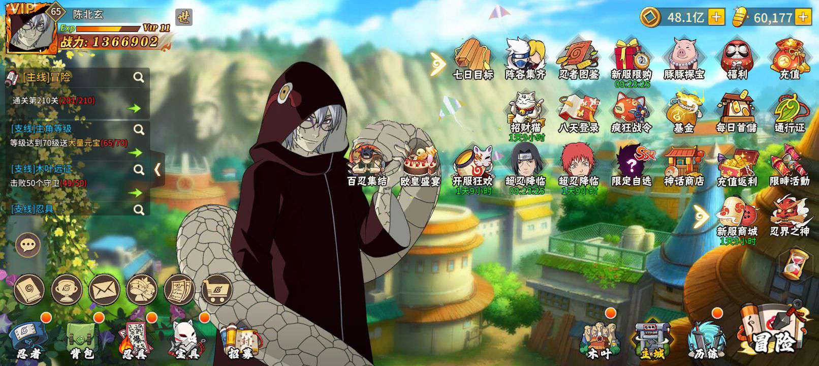 人物65级,战力高 ,装备齐全。好几个强力忍者,阵容成型了