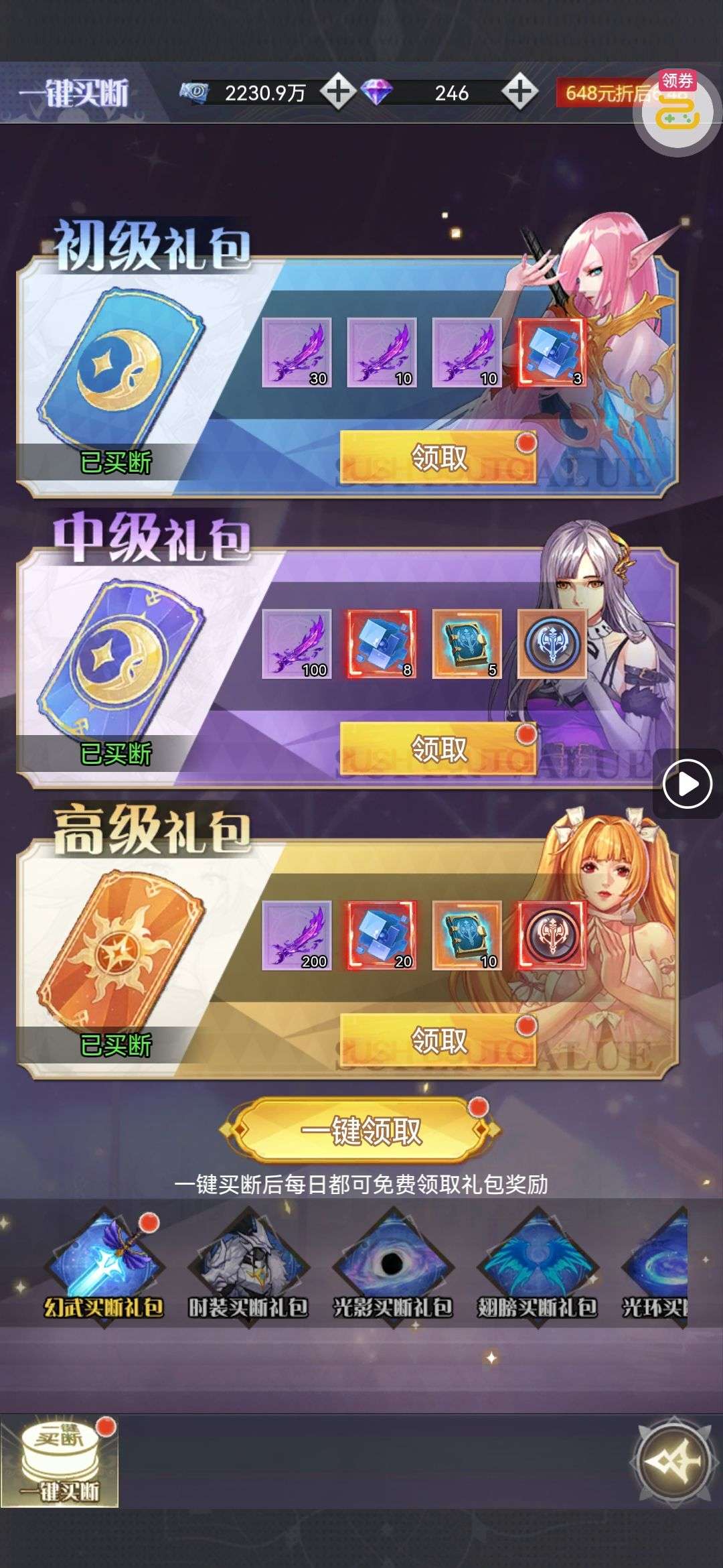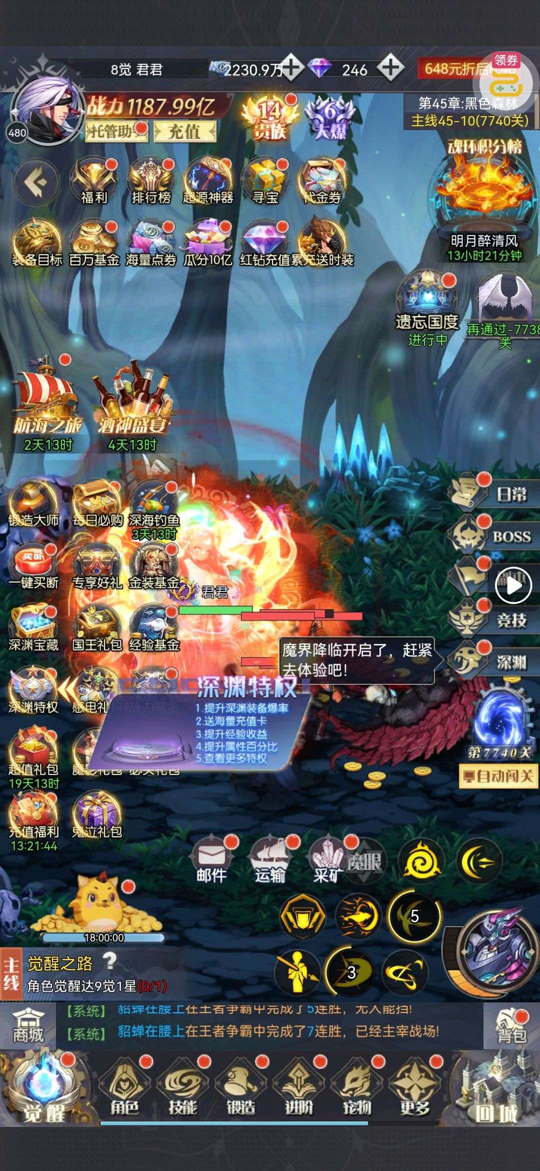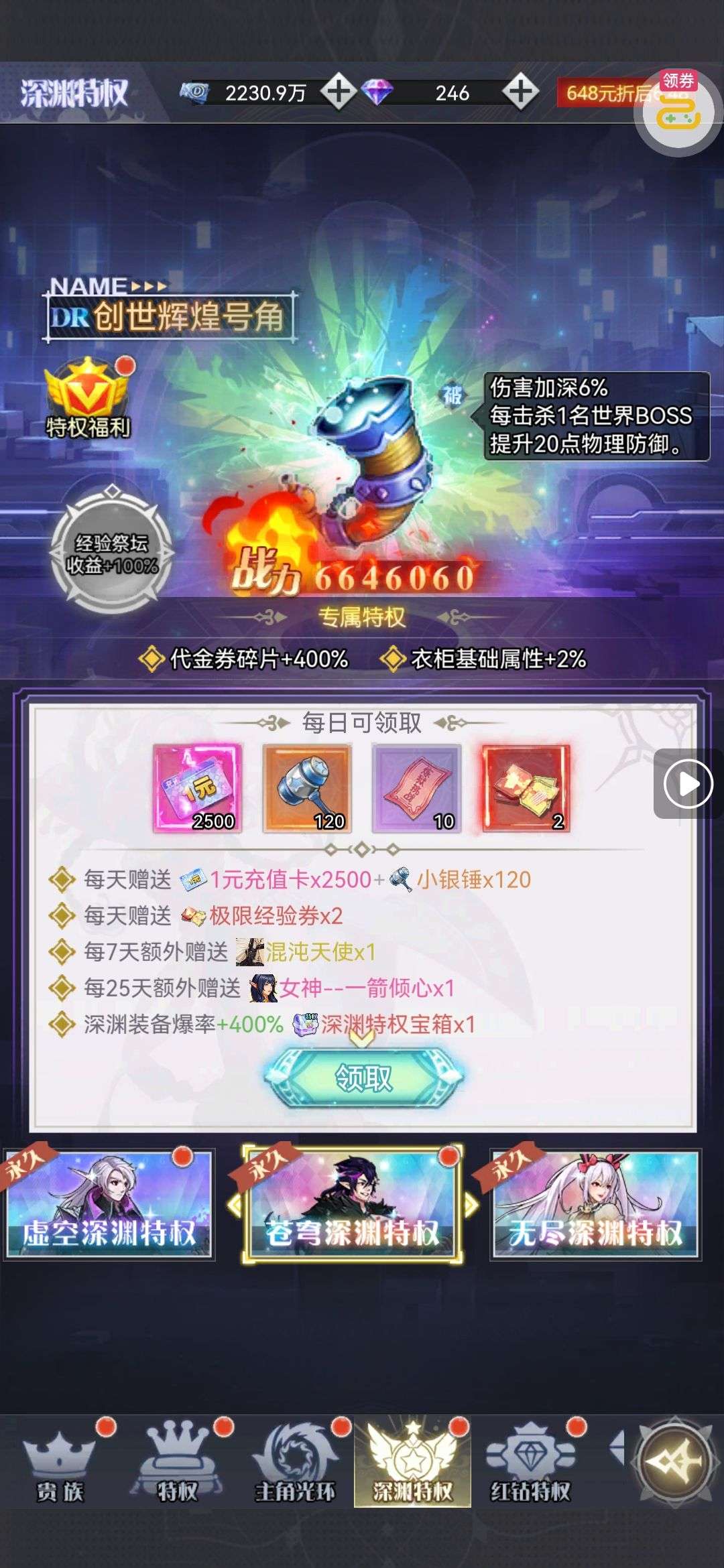 深渊契约,特权都开了,一键买断,贵族11,深渊特权全开。背包里东西多多。完了几天就没玩了