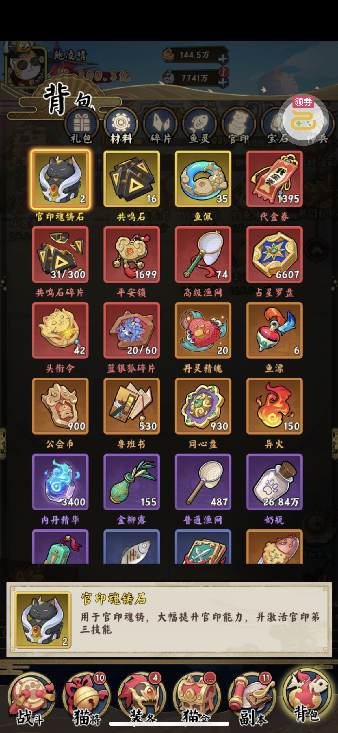 一堆圣晶石6小时*1、募魂令*10、暗淡原石*40(每个账号限领一次)