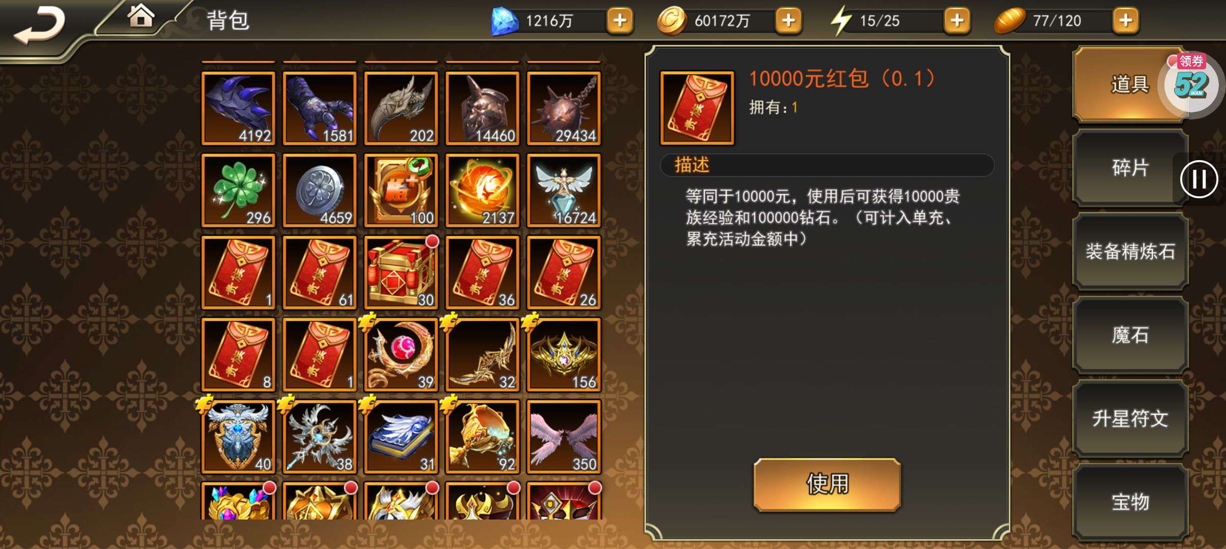 70多万亿战力,资源很丰富,钻石很多,红包很多,8耀金随便换随便玩,宝物全满,反正这价格买了肯定不后悔。光钻石和红包都不止这个价格了。