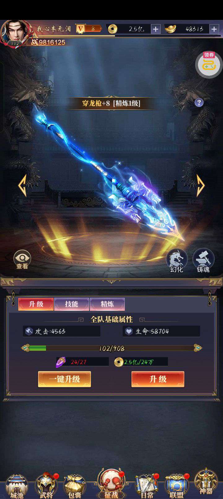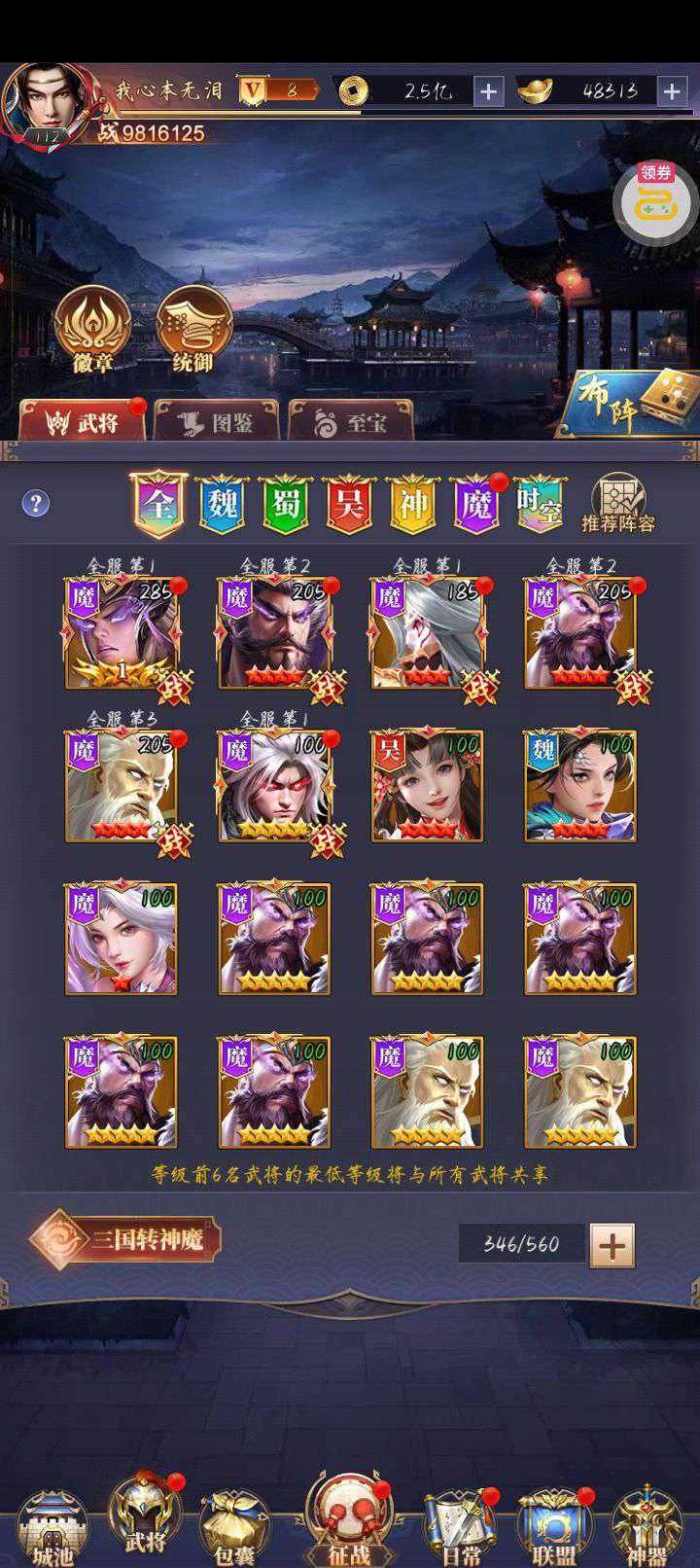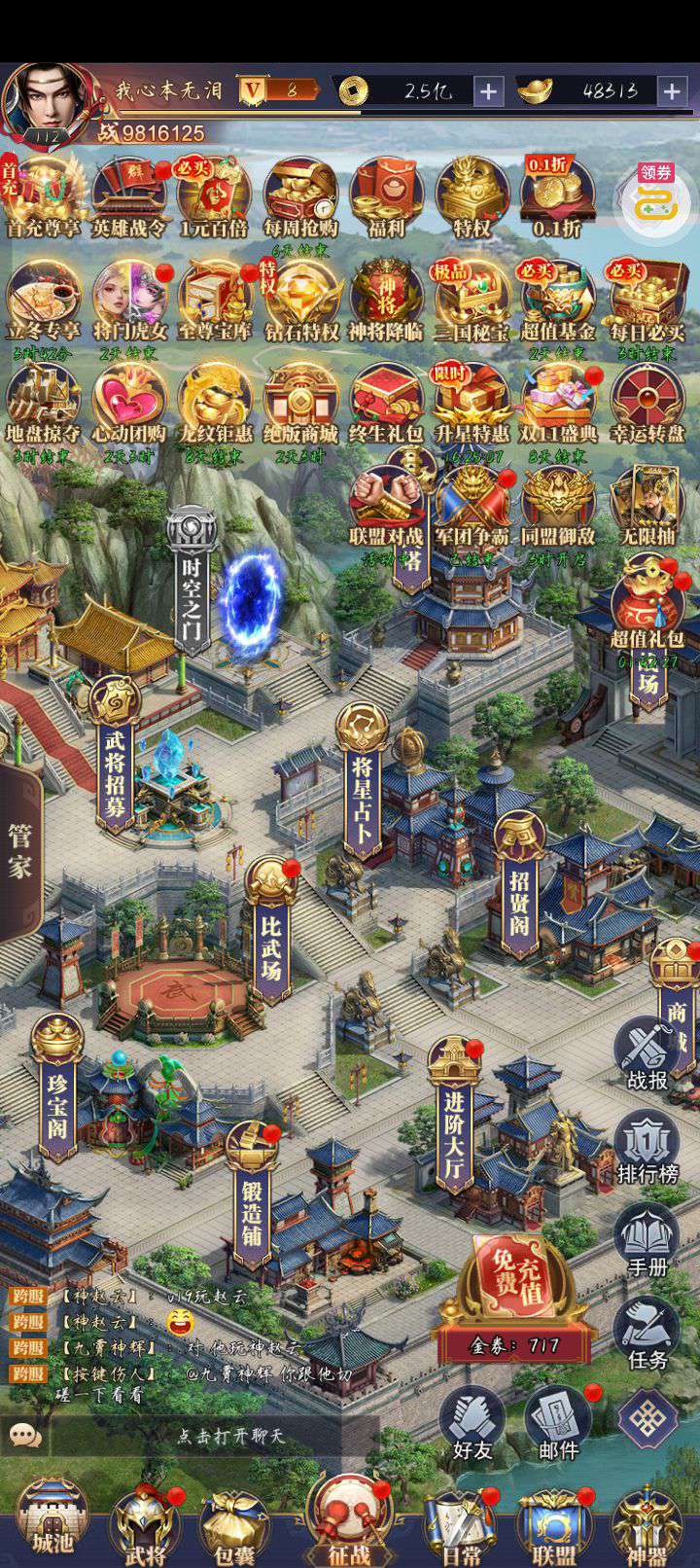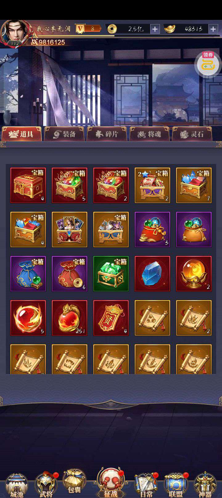 自己用心练的吴国号,至尊宝库和钻石特权已经全开,五级灵石,红色兽魂,四星饰品,五星红装,将星升红道具等每天都可以在宝库购买。爬塔和墨家战令也开了,快速征战特权也全开了,每天坐领各种高级资源,基本没走弯路,现在换游甩卖了