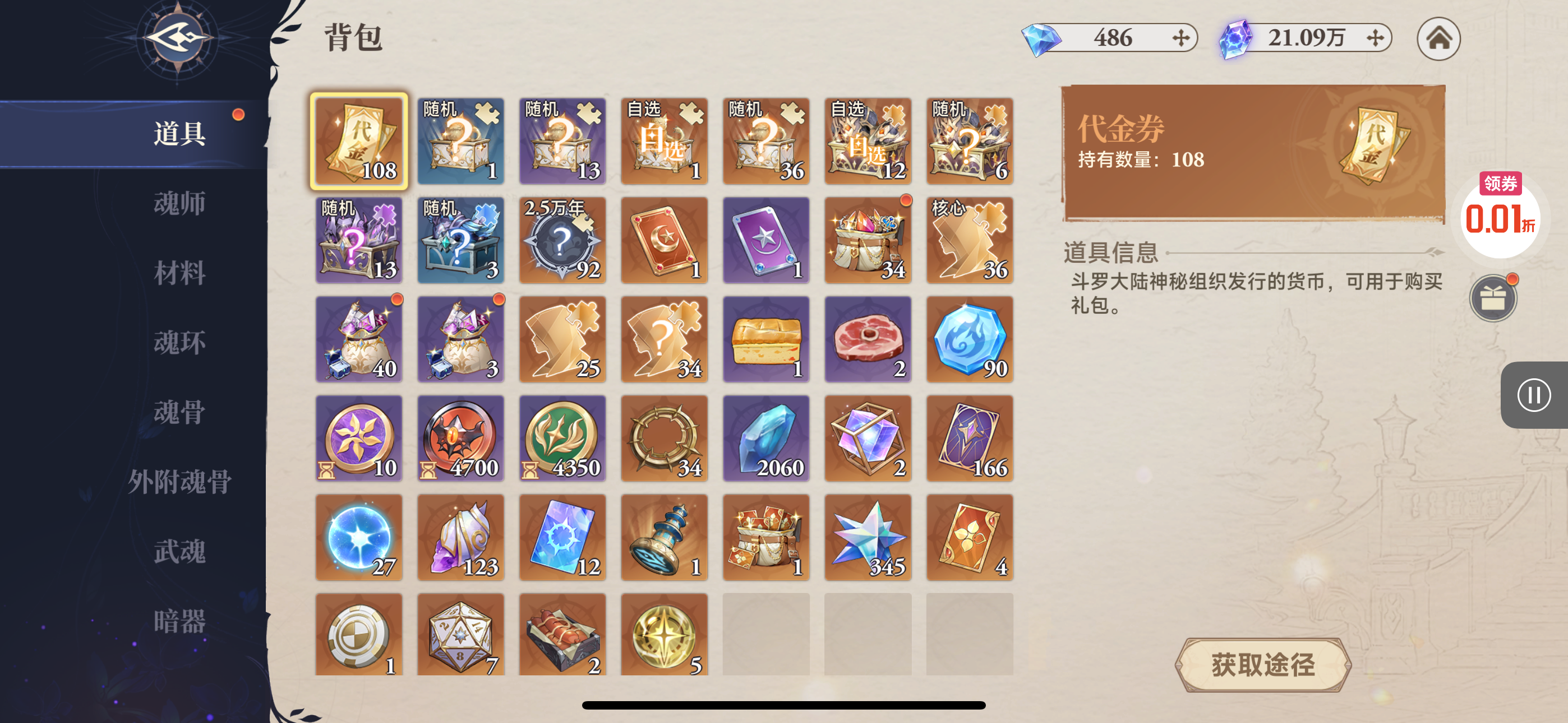 道具多,神话魂导器两套,神话外附魂骨,时空外附魂骨,百万年魂环,暗器都有。