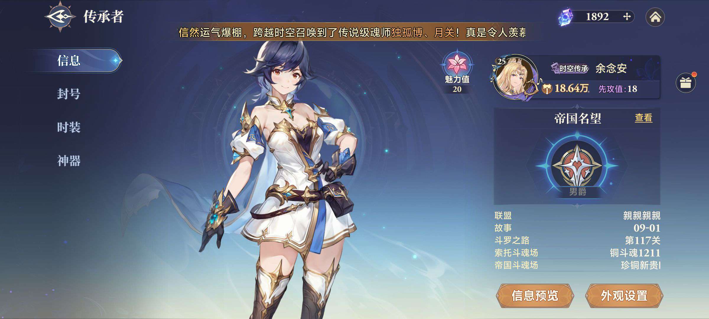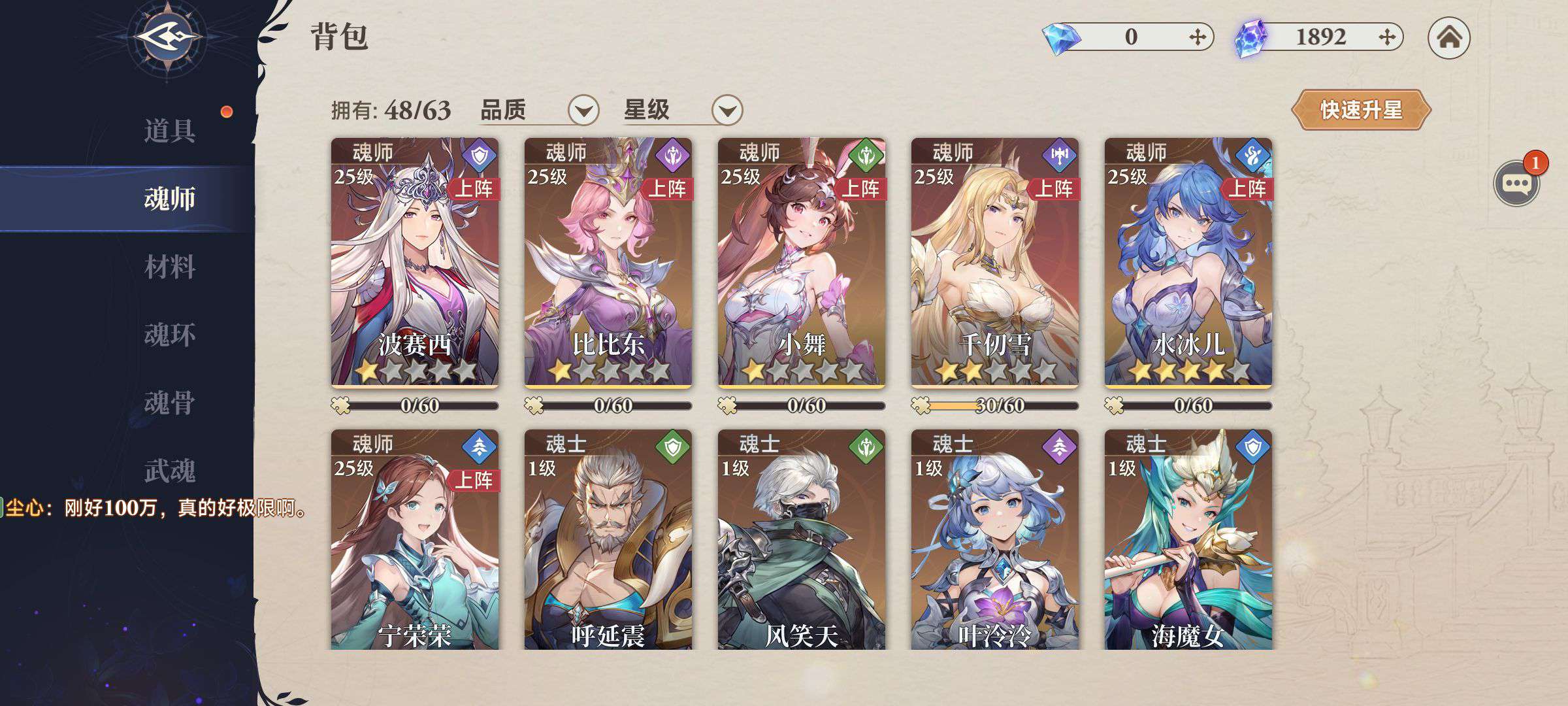 道具多,神话魂导器两套,神话外附魂骨,时空外附魂骨,百万年魂环,暗器都有。