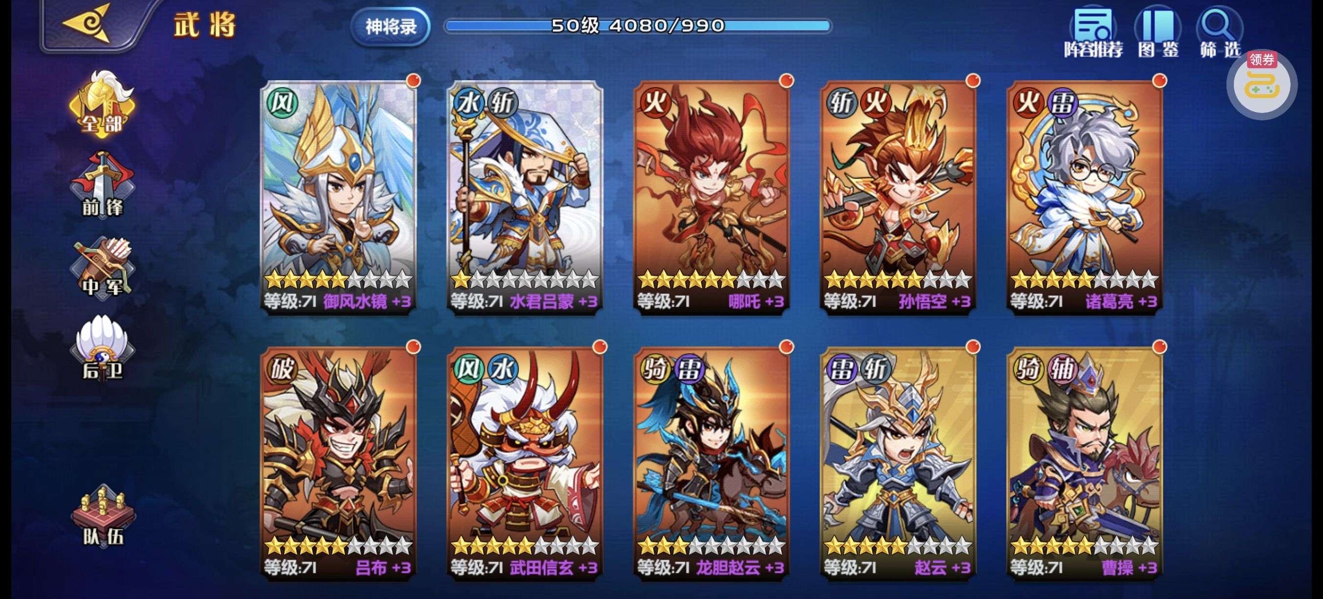 厉害的卡都有各种配置全部拉满,奇谋五个全满星满洗练,武器神兵各种满星满属性,输出卡十万多攻击增伤百分之二百多