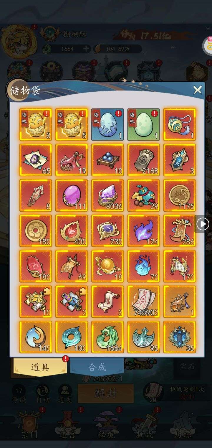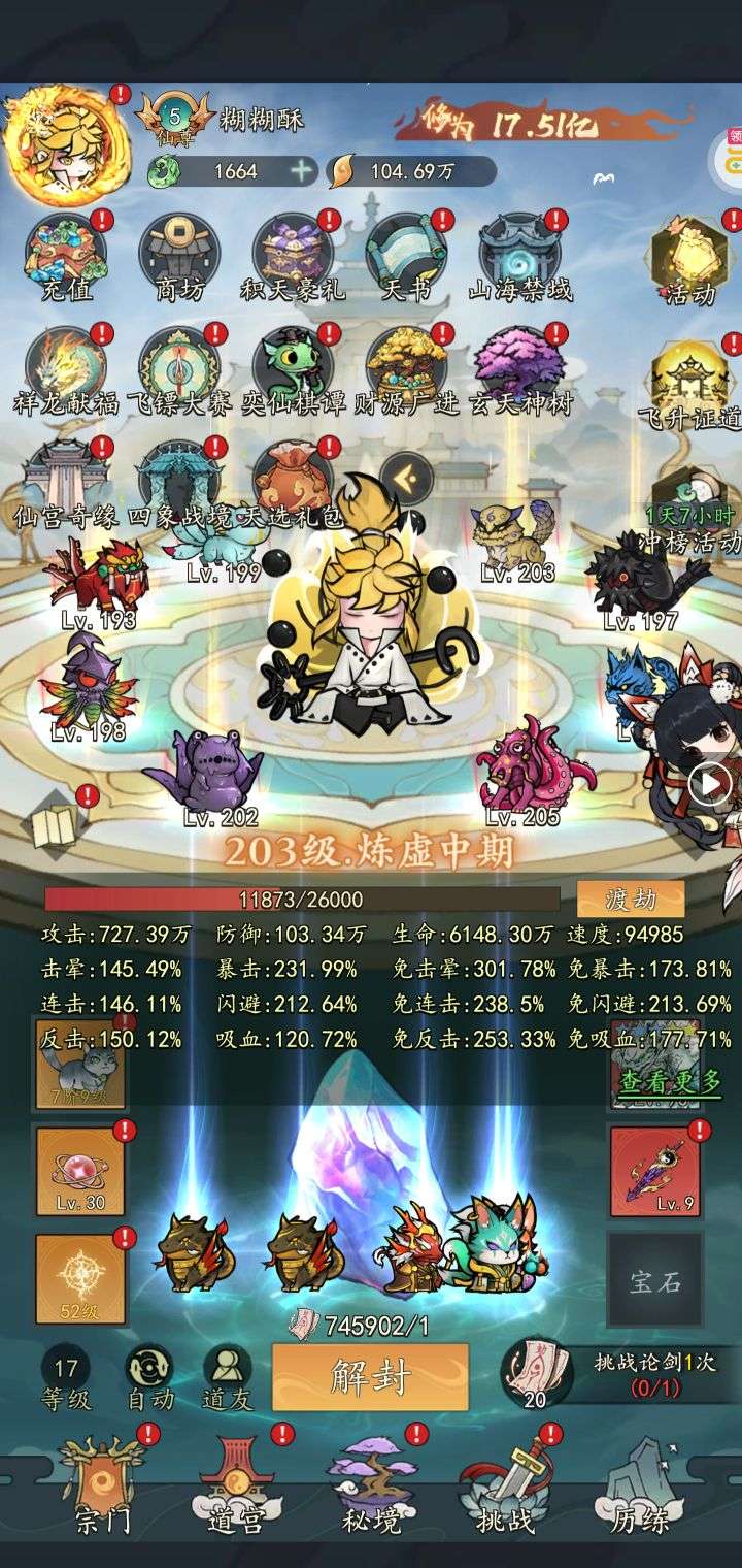仙尊2 修为127.47w 已有终身卡源石基金等物品 等级83元婴中期