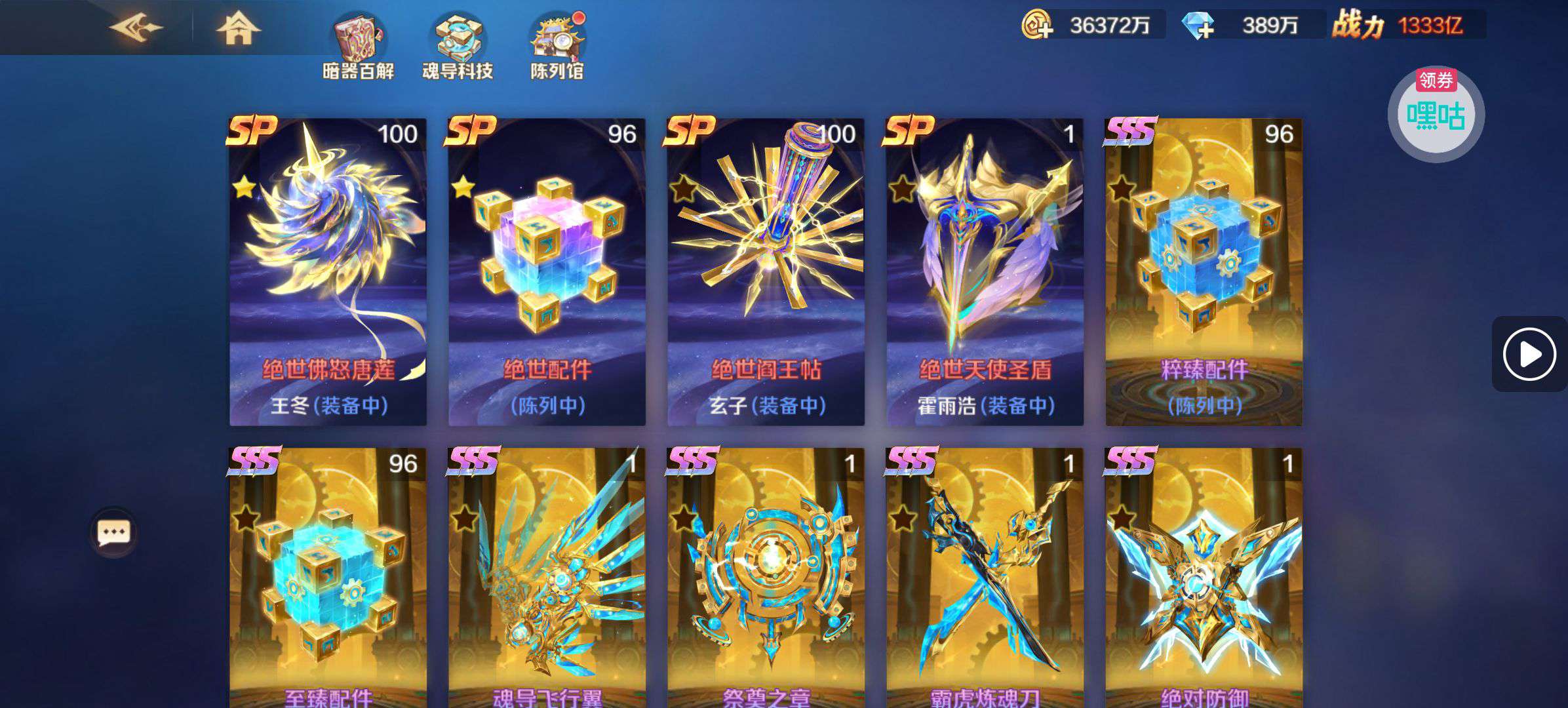 可以进行冠名的账号,装备非常齐全,新出的啥都氪了