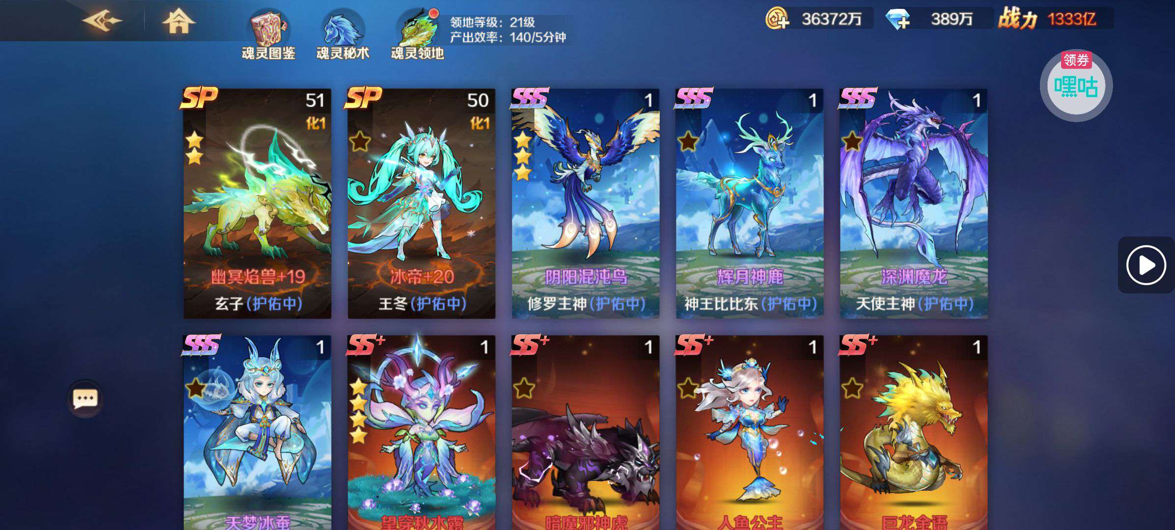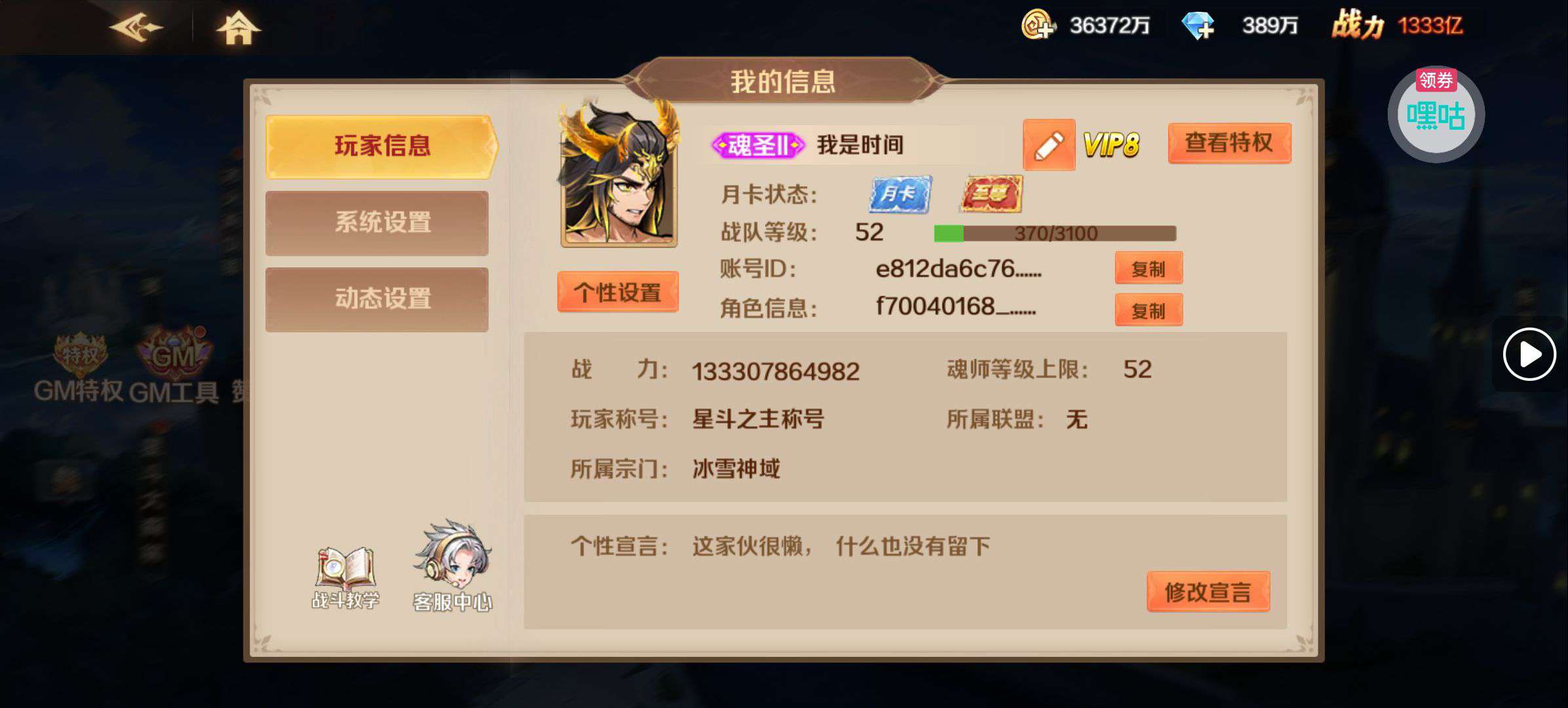 等级75.VIP13,战力300000亿。