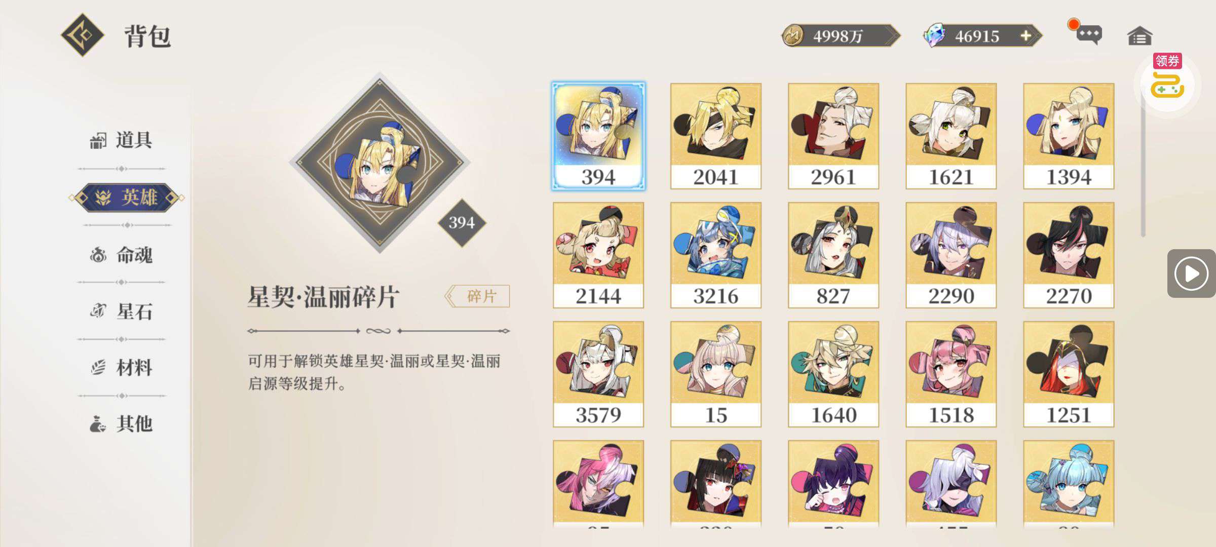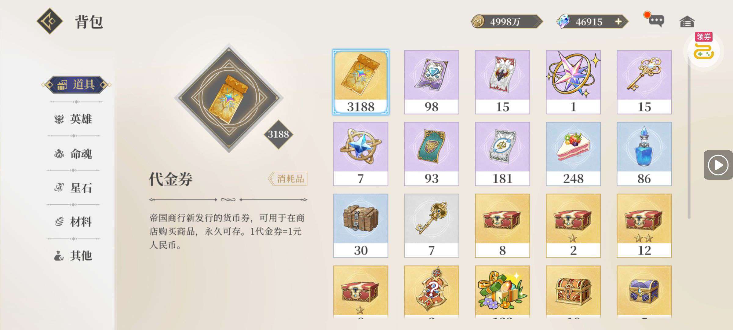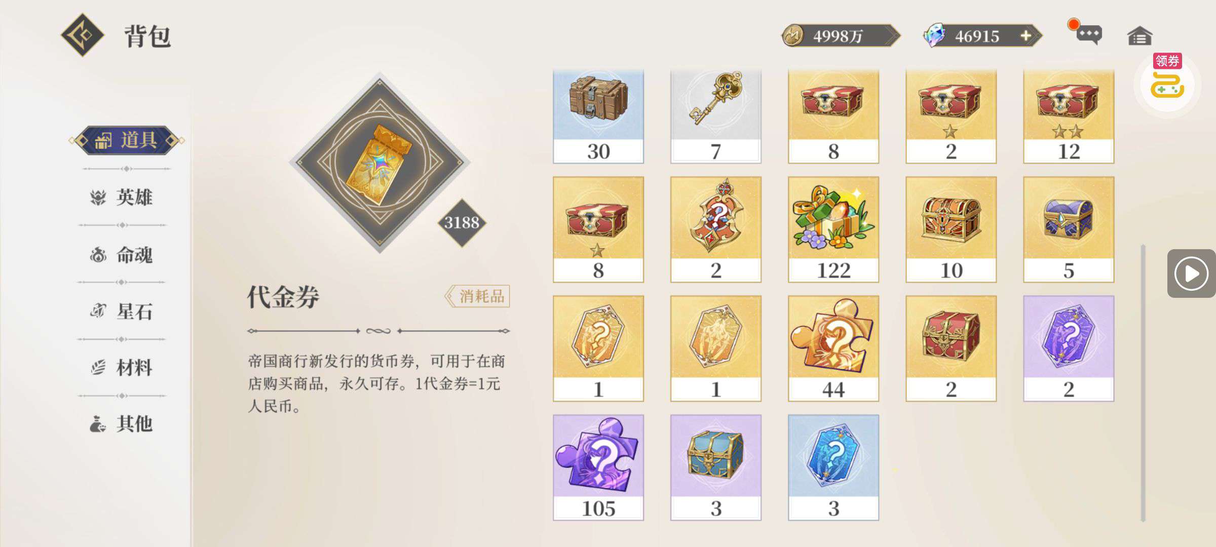 钻石*188,英灵祈愿券*10,金币*10000(每个账号限领一次)