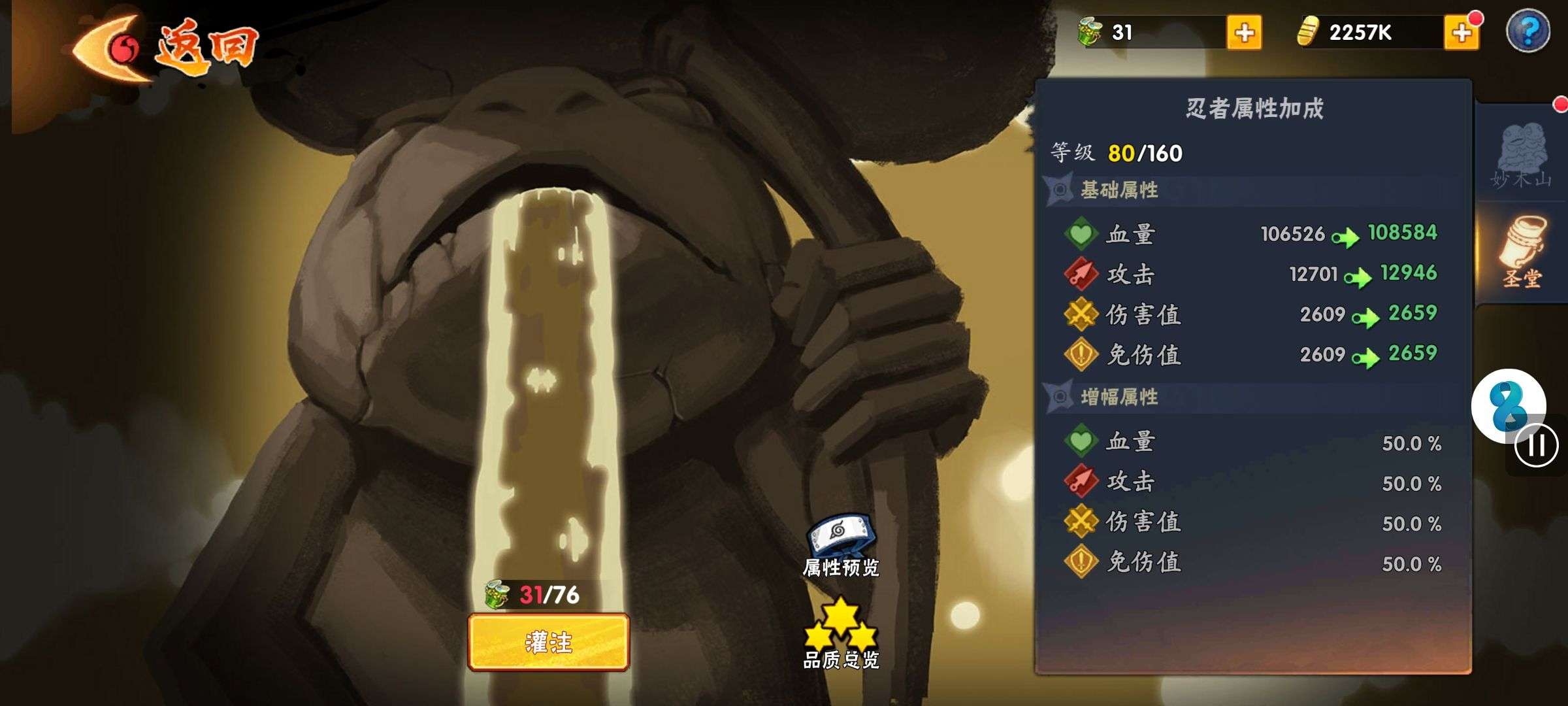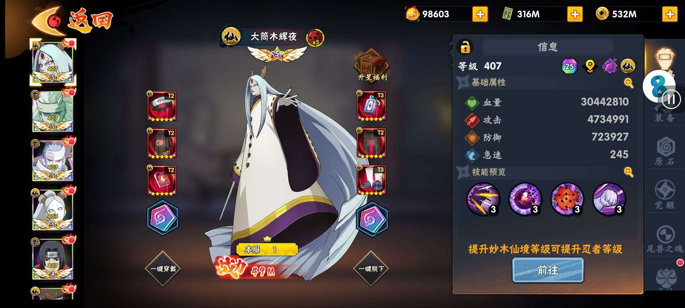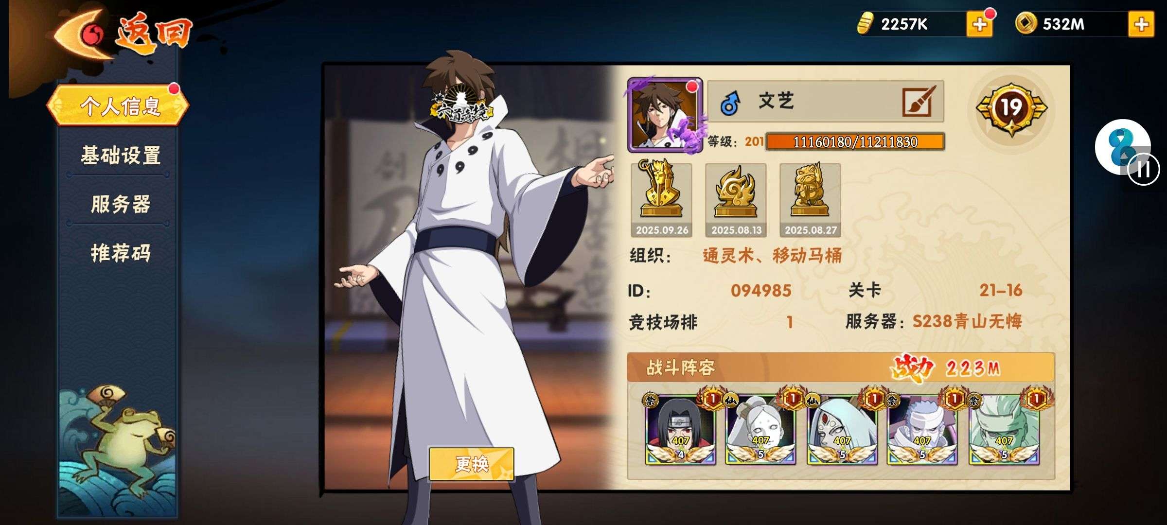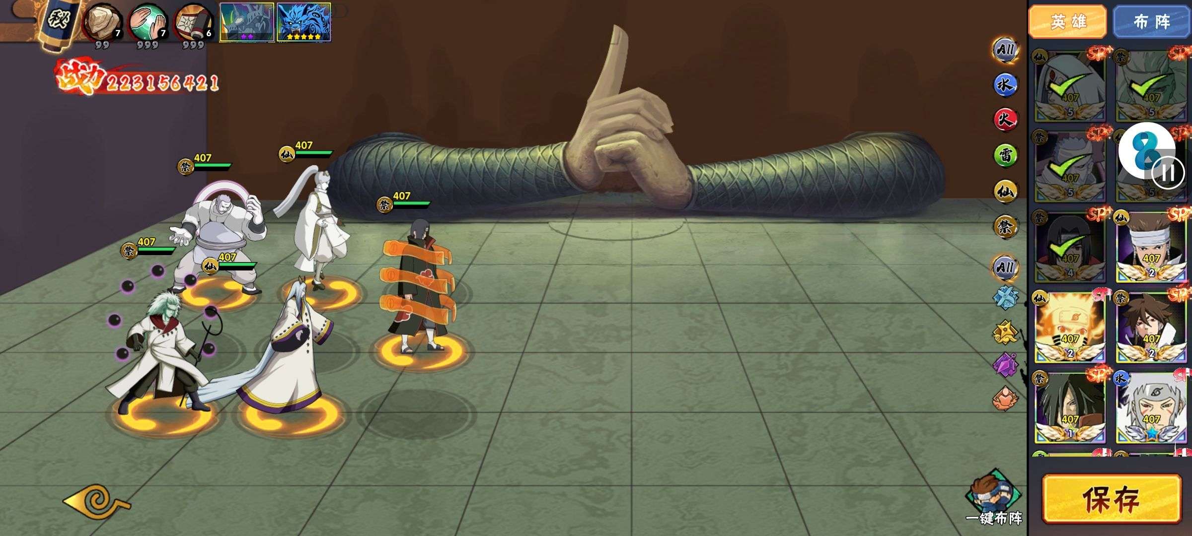 战力2.23亿+,禁术卷轴9.2千+,毕业阵容,养上阵的5个人物就行了。