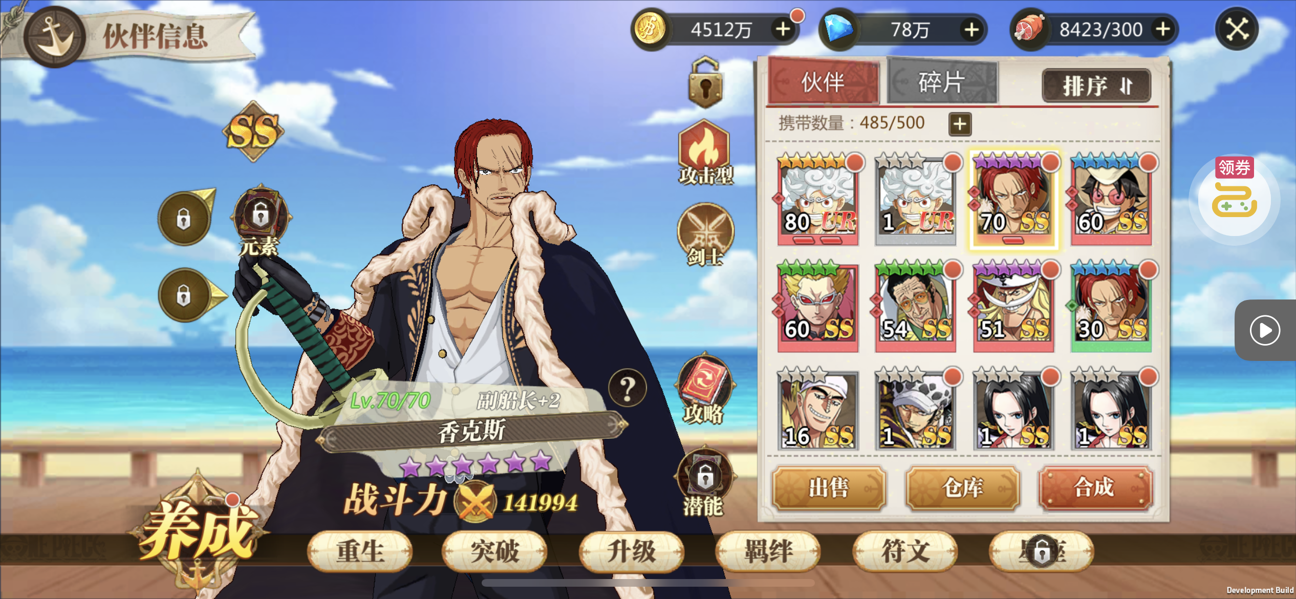 还有54000+贝利,11个ur草人,2个雷利本体,副本过到22章了,装备和阵容基本成型