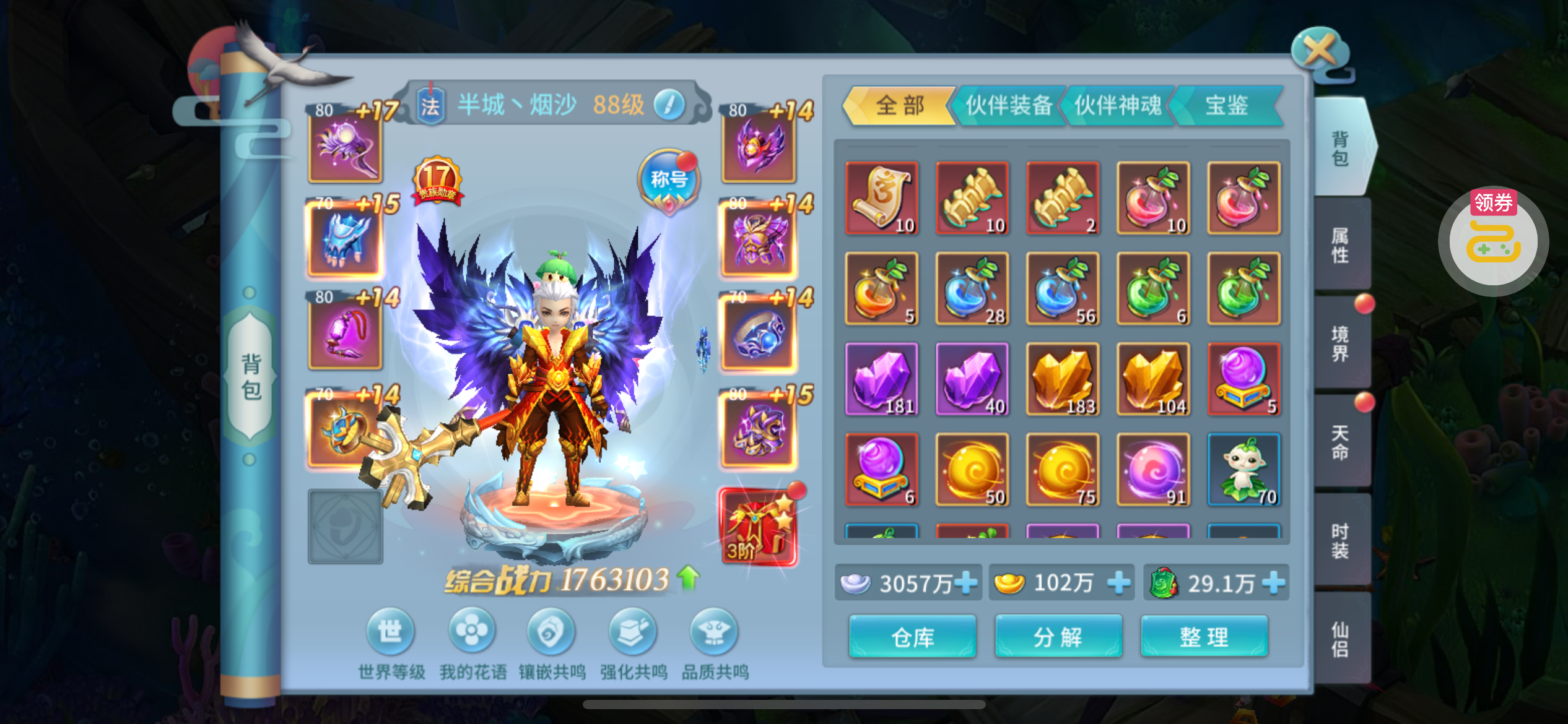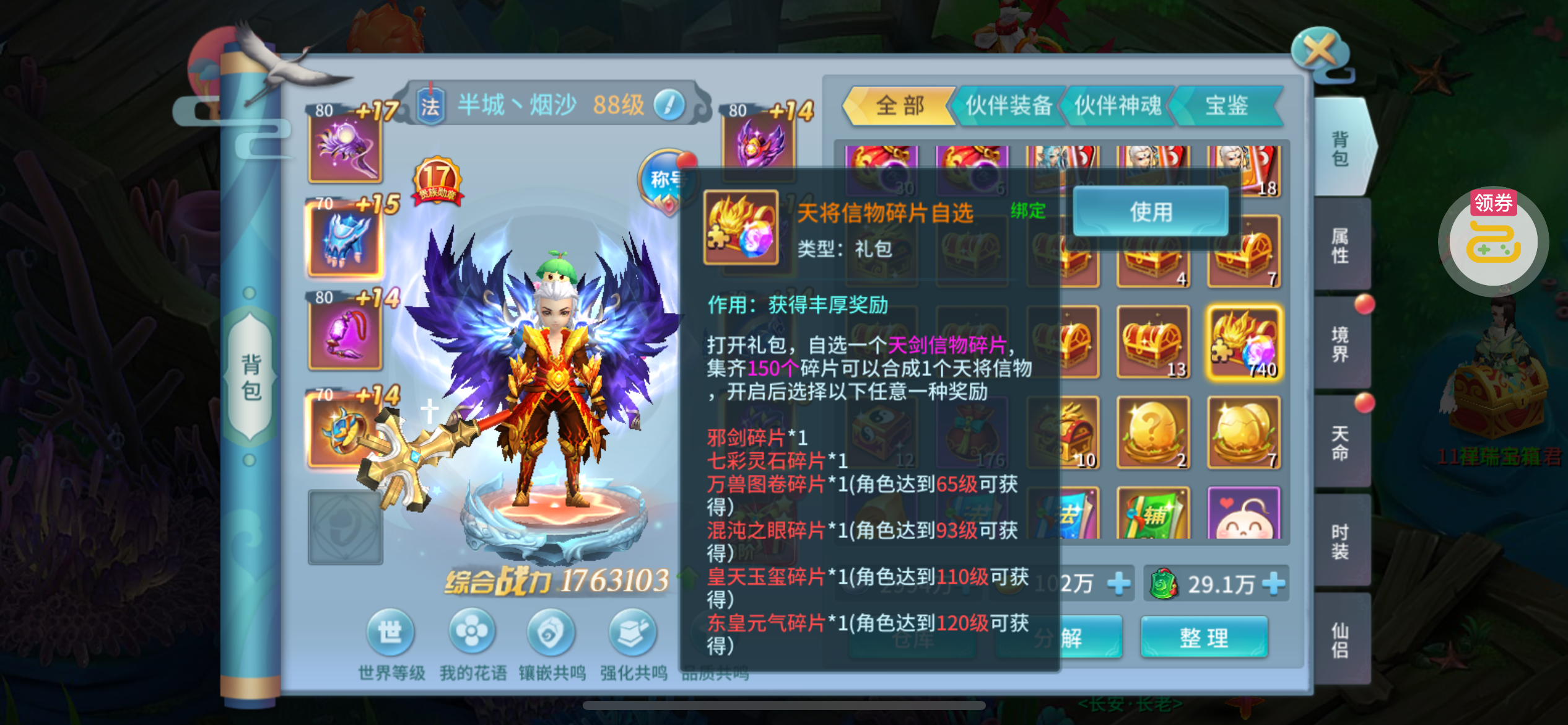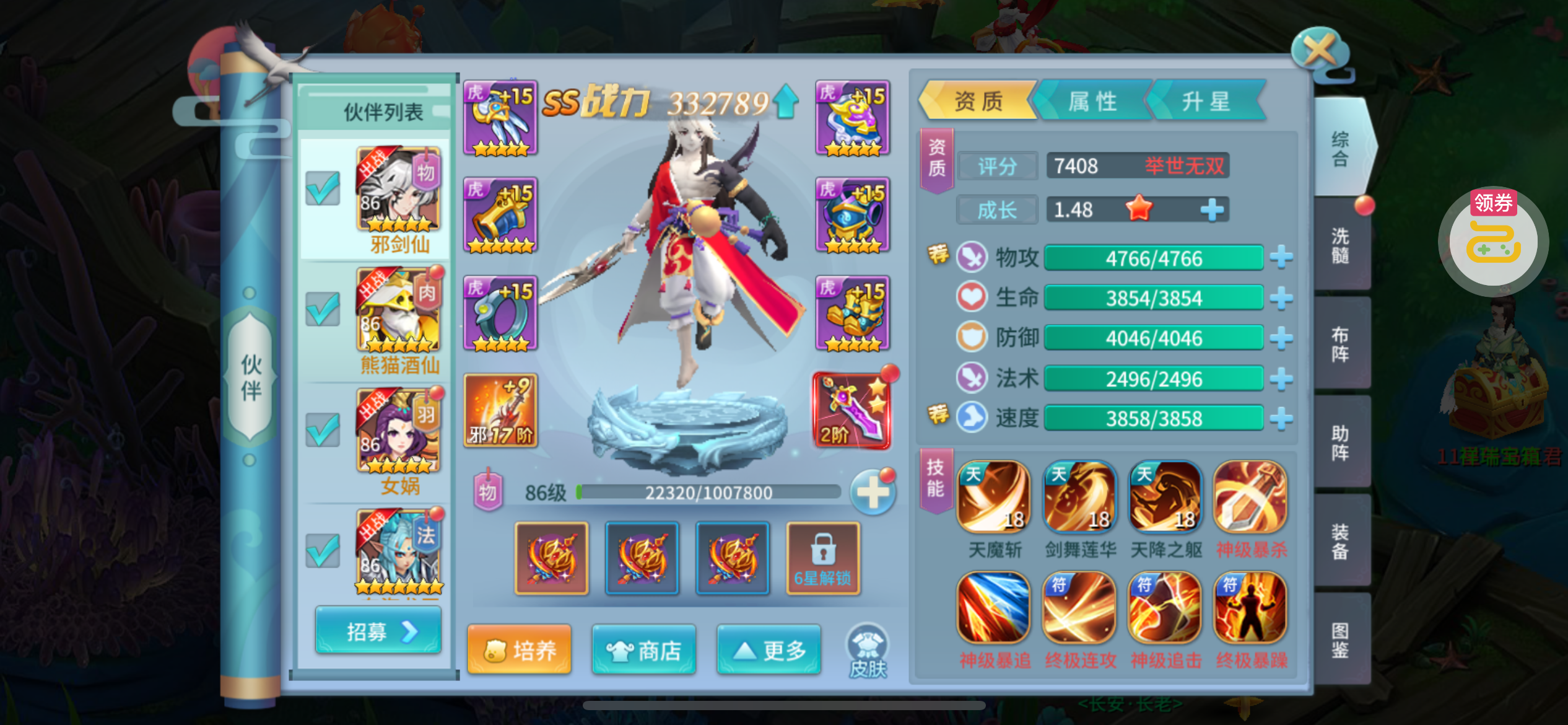 进游戏就能看到,好多东西都还没用,三个天将吃满了属性,第四个也快出来了