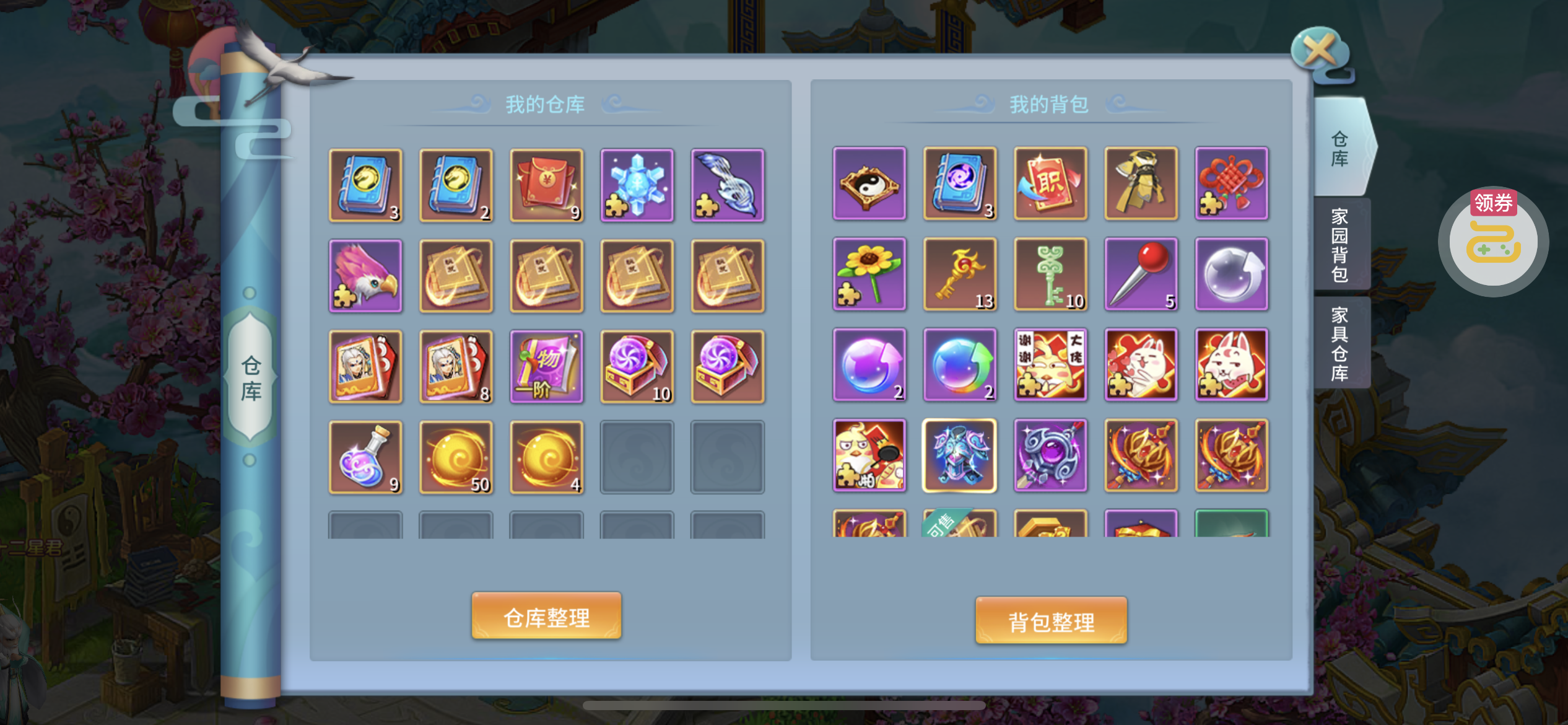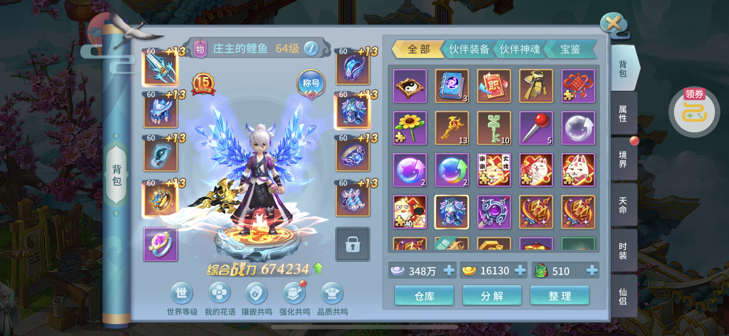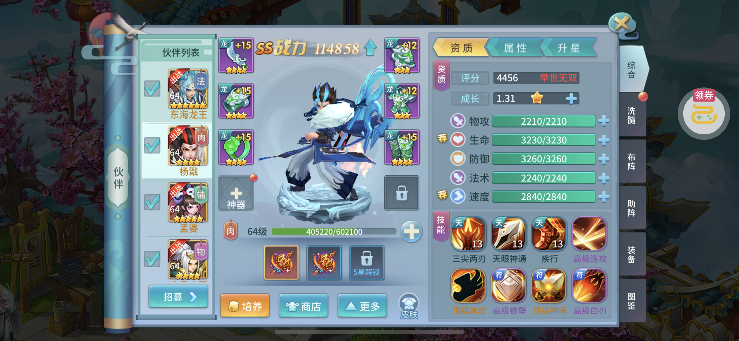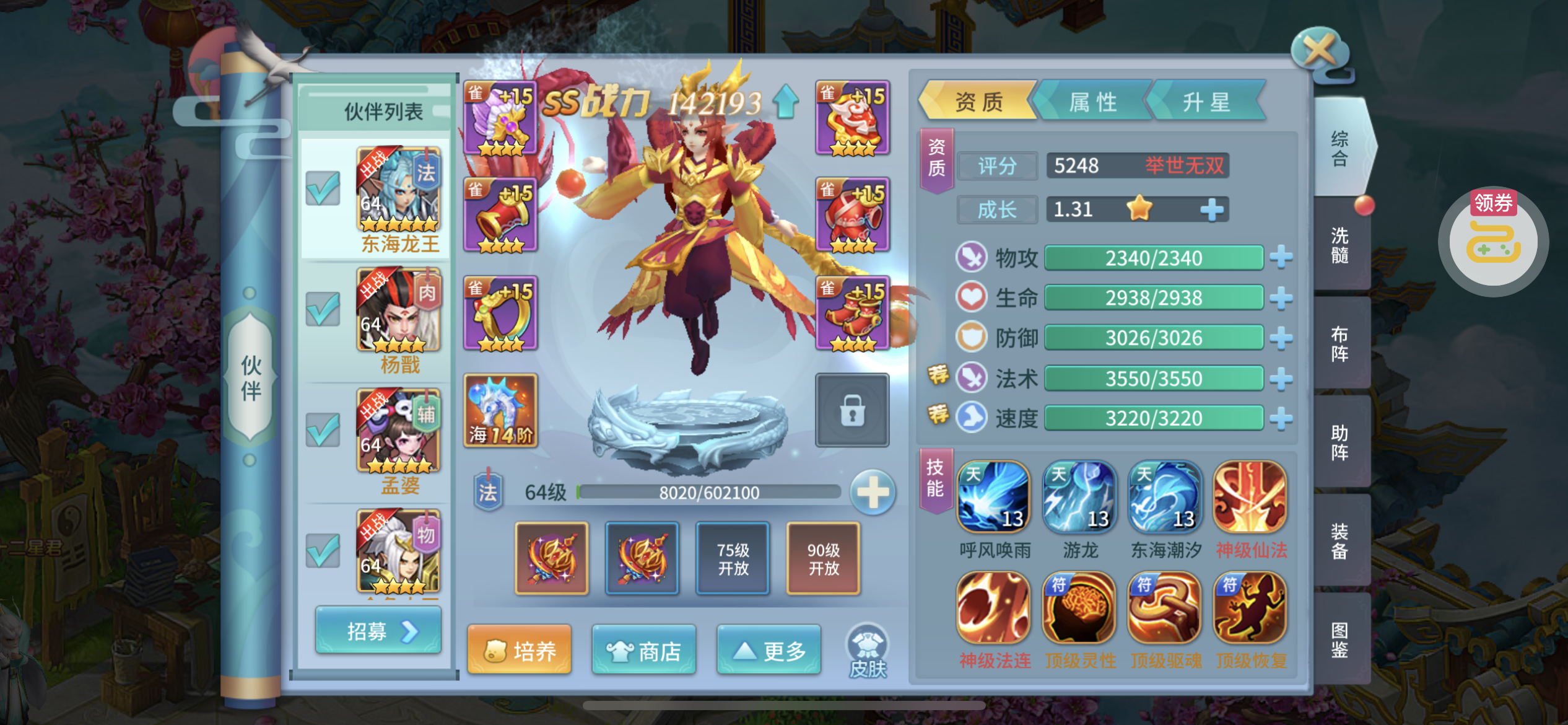 进游戏就能看到,好多东西都还没用,三个天将吃满了属性,第四个也快出来了