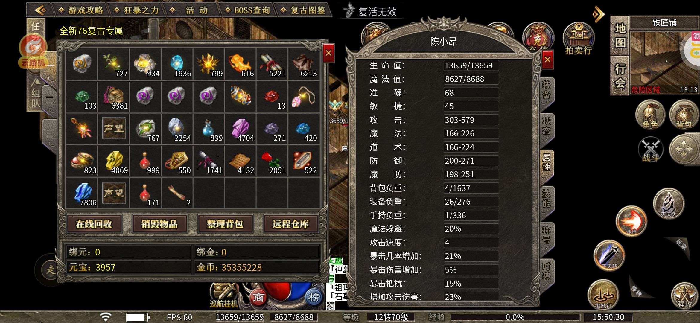 9级攻击宝石,仓库满材料,金币,元宝