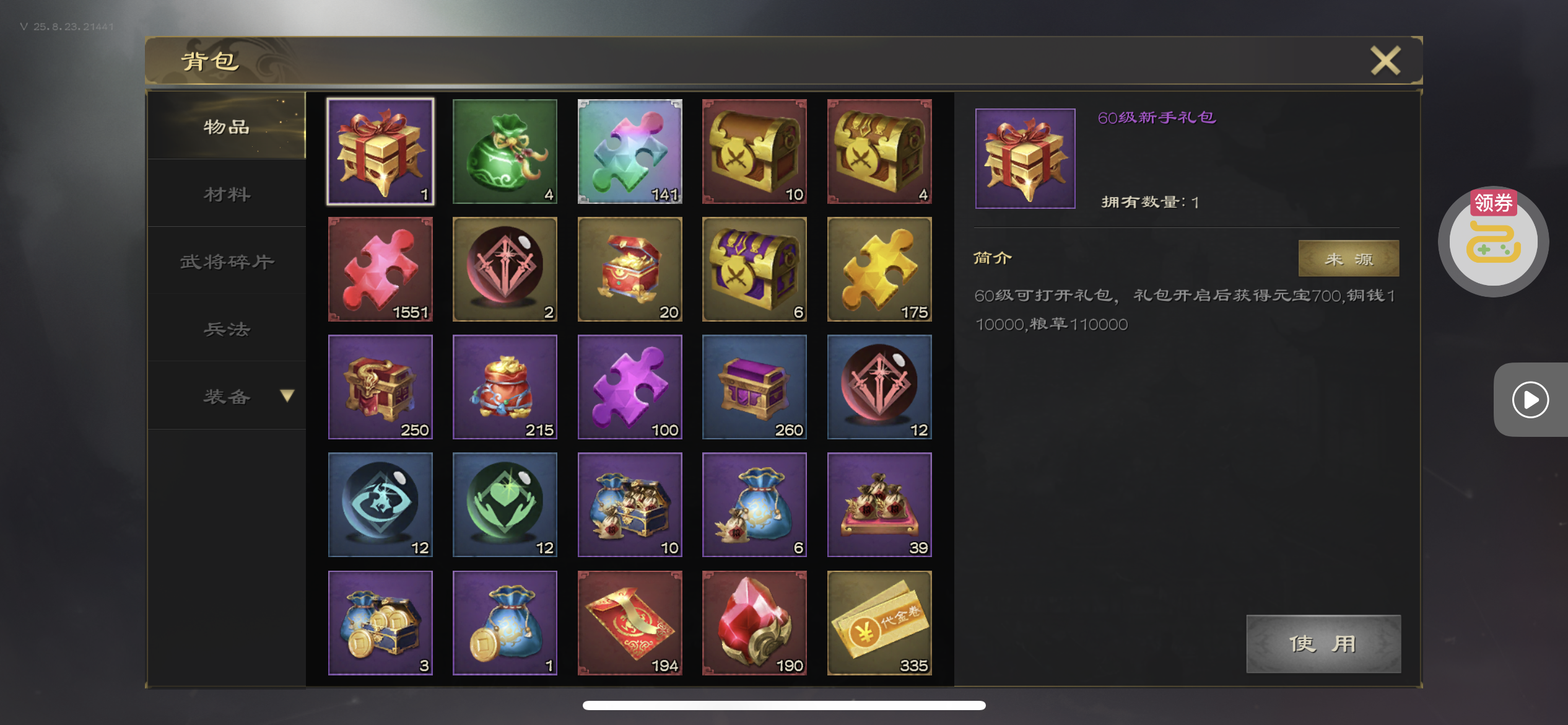 灵化符·骑*20、突破丹·骑*3、魂力丹*30、1.5倍经验药水*1(每个账号限领一次)