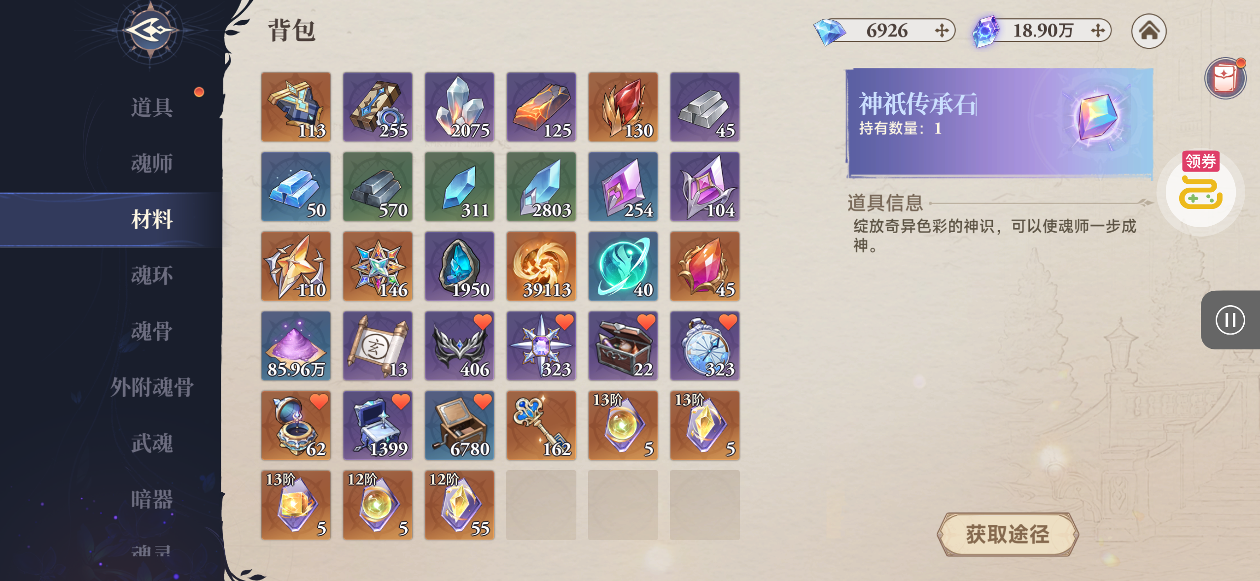 一堆圣晶石6小时*1、募魂令*10、暗淡原石*40(每个账号限领一次)