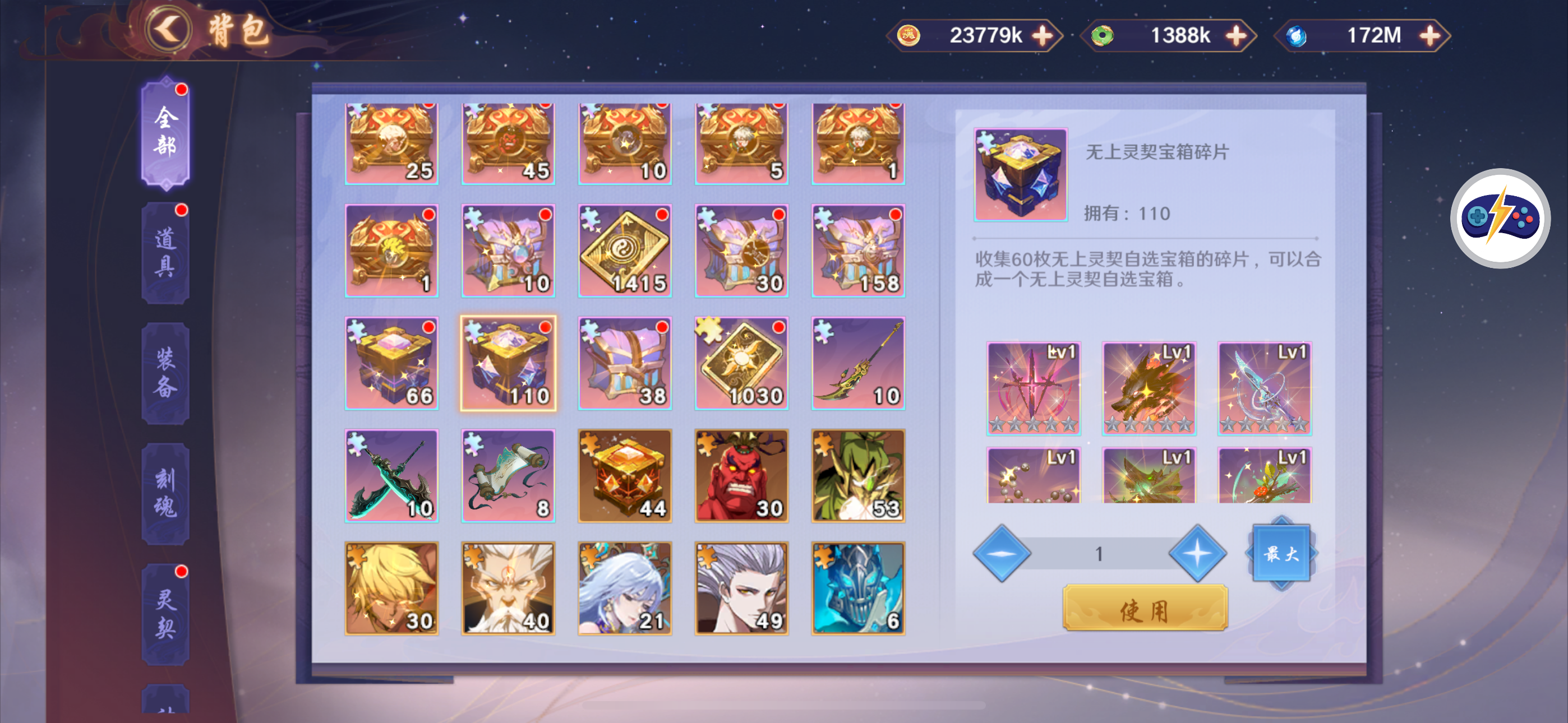 关于五星神器,满破镜,夏玲神器三星,其余彩,仓库一堆盒子和碎片,没时间玩了