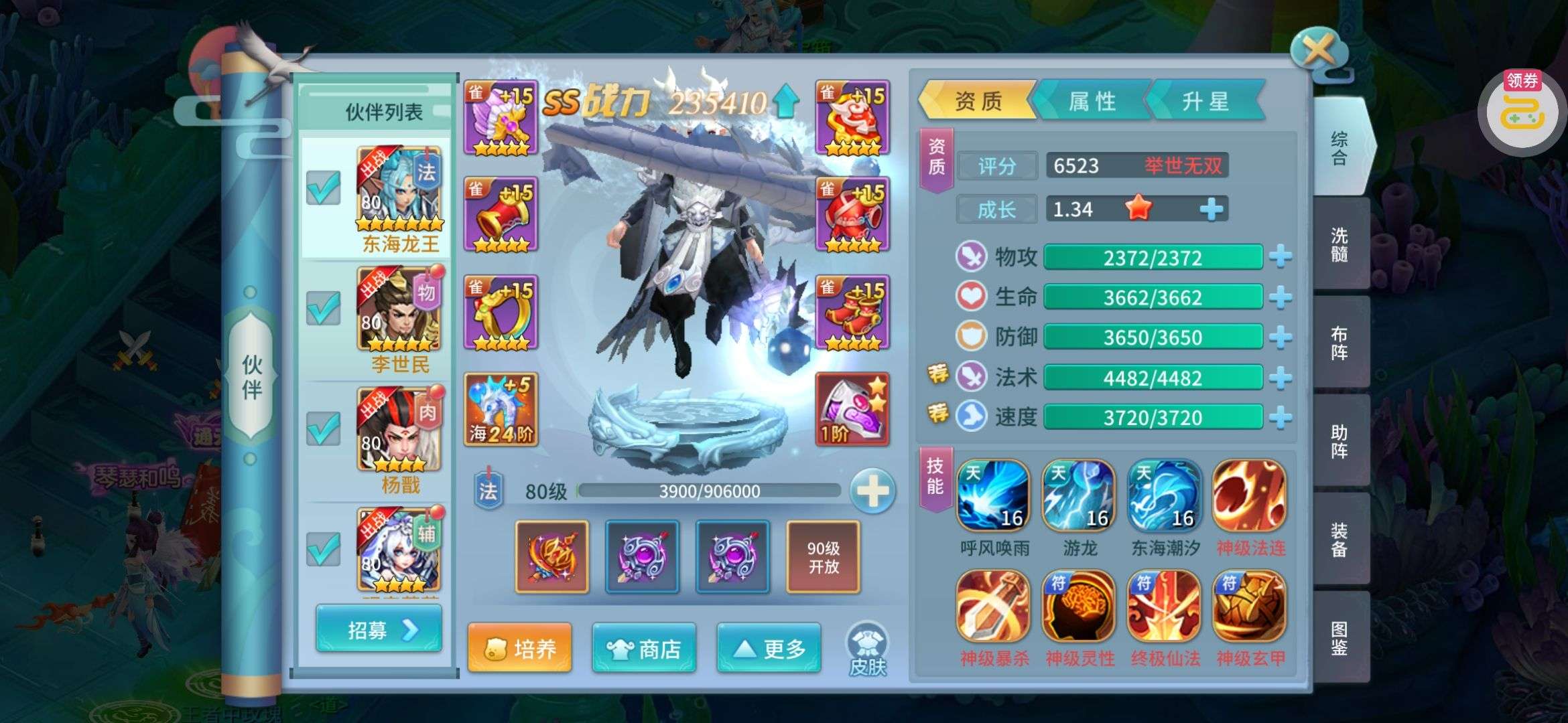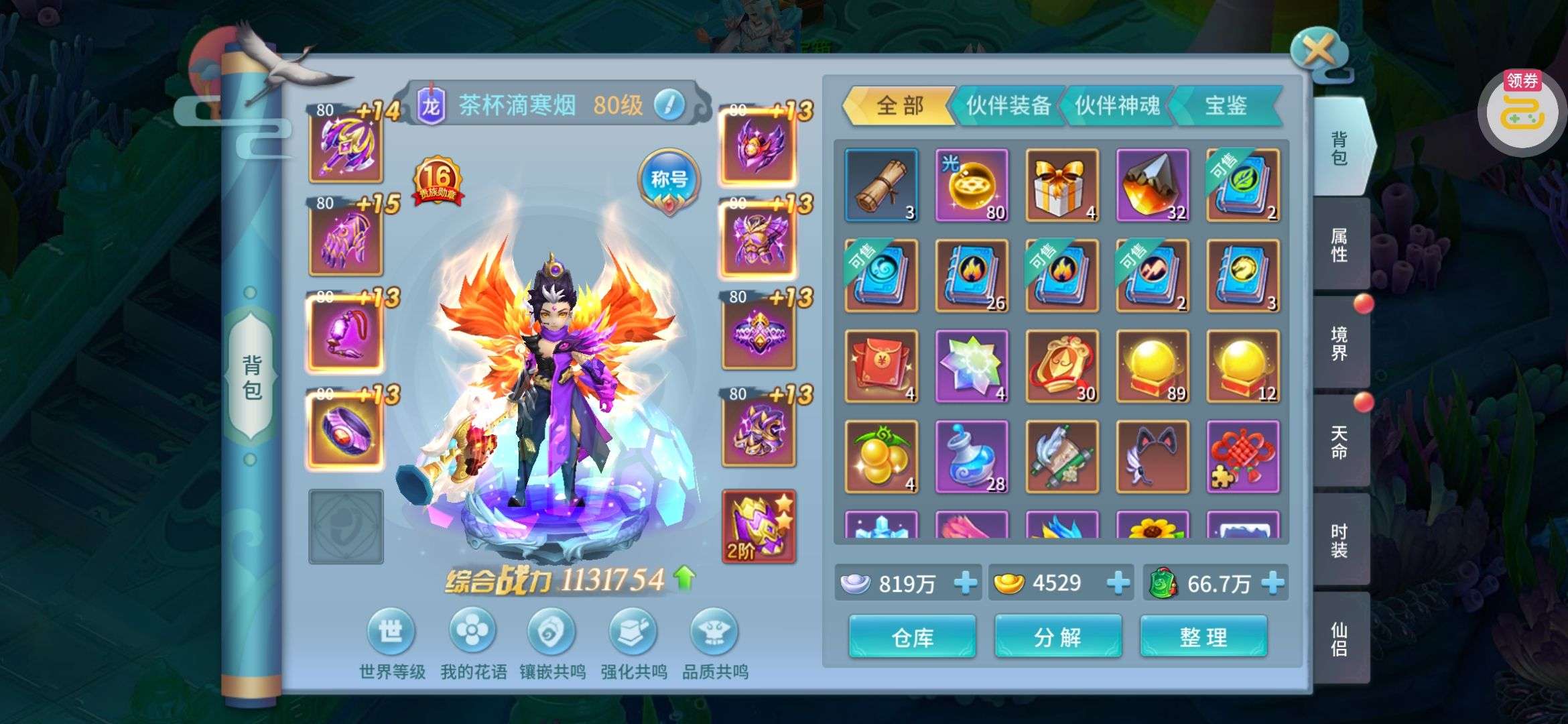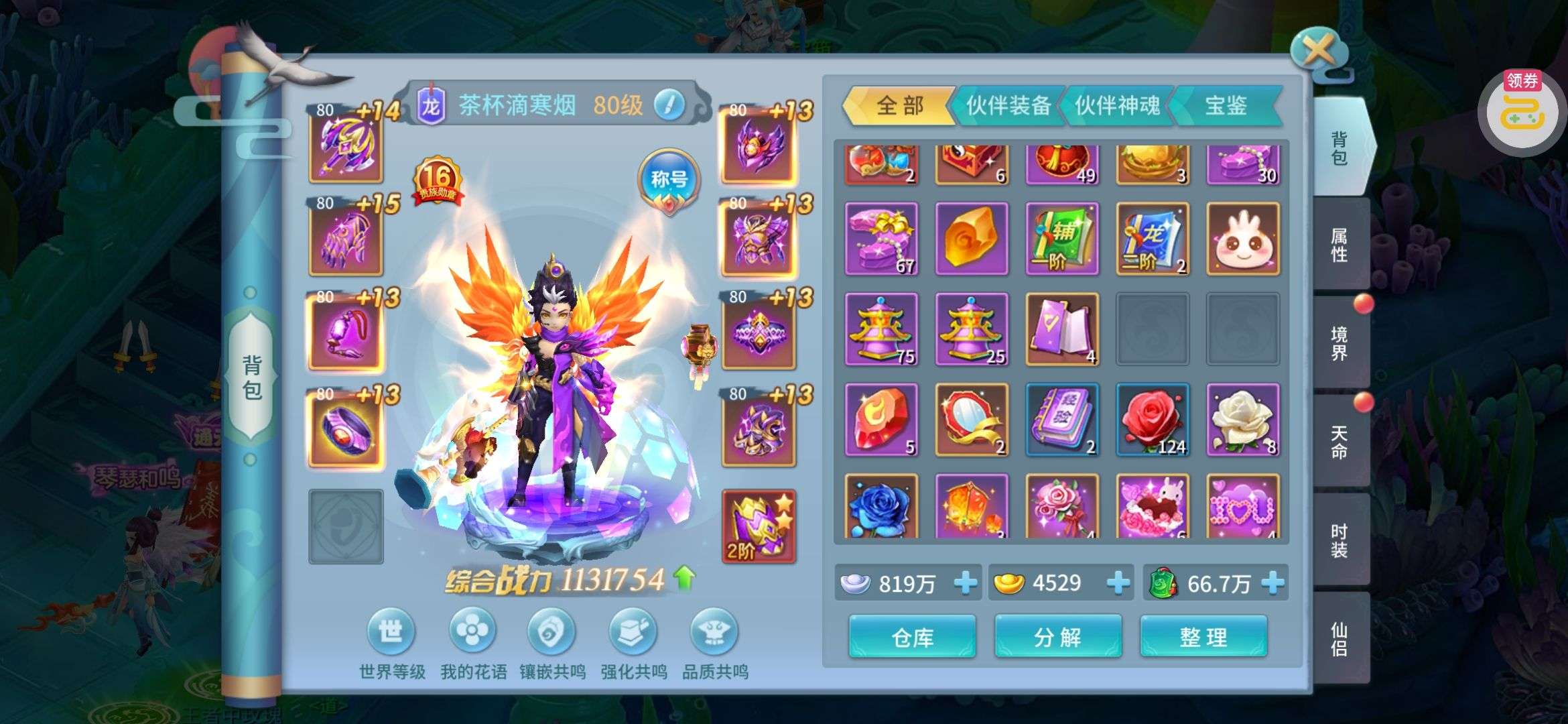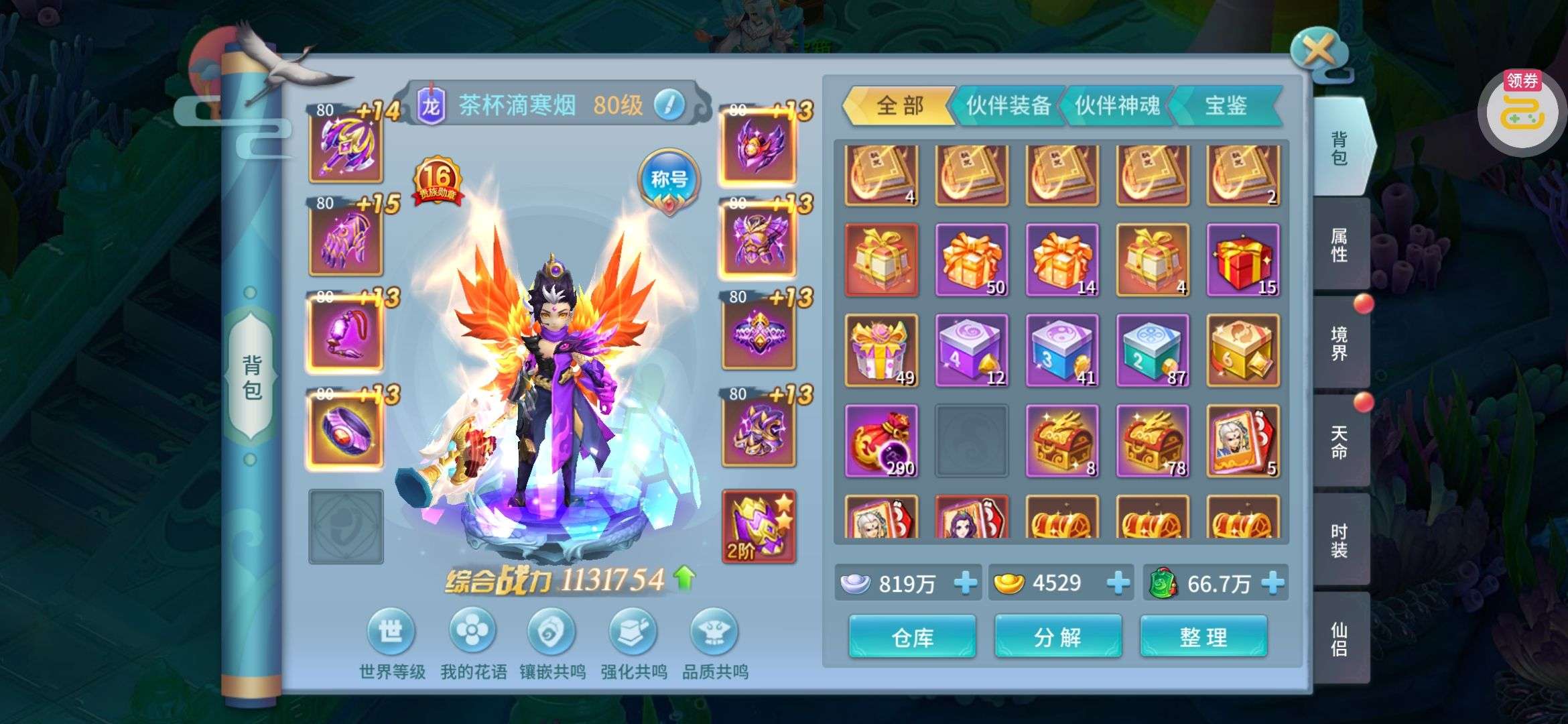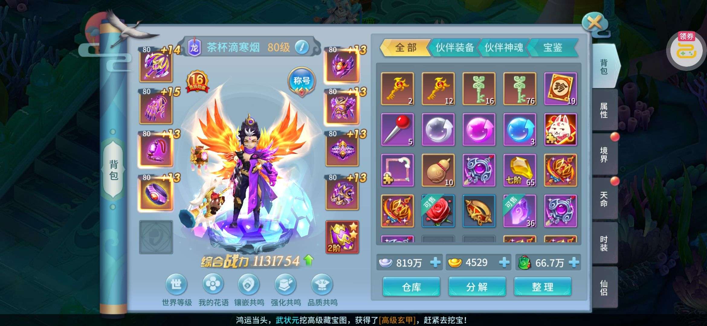 神器几乎齐全,战宠几乎齐全,宠物也还可以