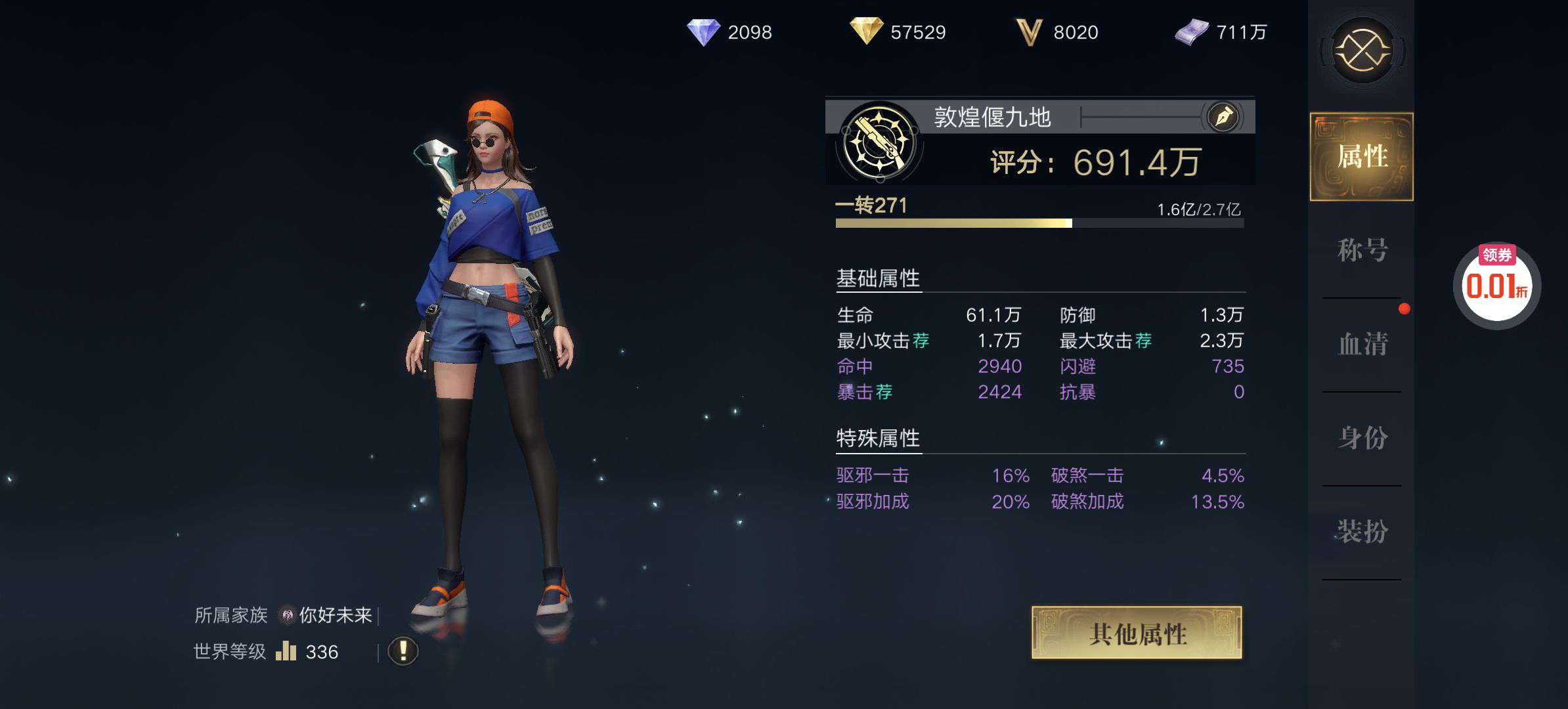 该角色累计充值2710.68元,购买后不能再次交易,不支持转区,可以回收,但回收回收金额仅计算该小号购买后的充值金额,不计算原有充值价值(如有舒其他游戏官方福利号需求请联系客服)