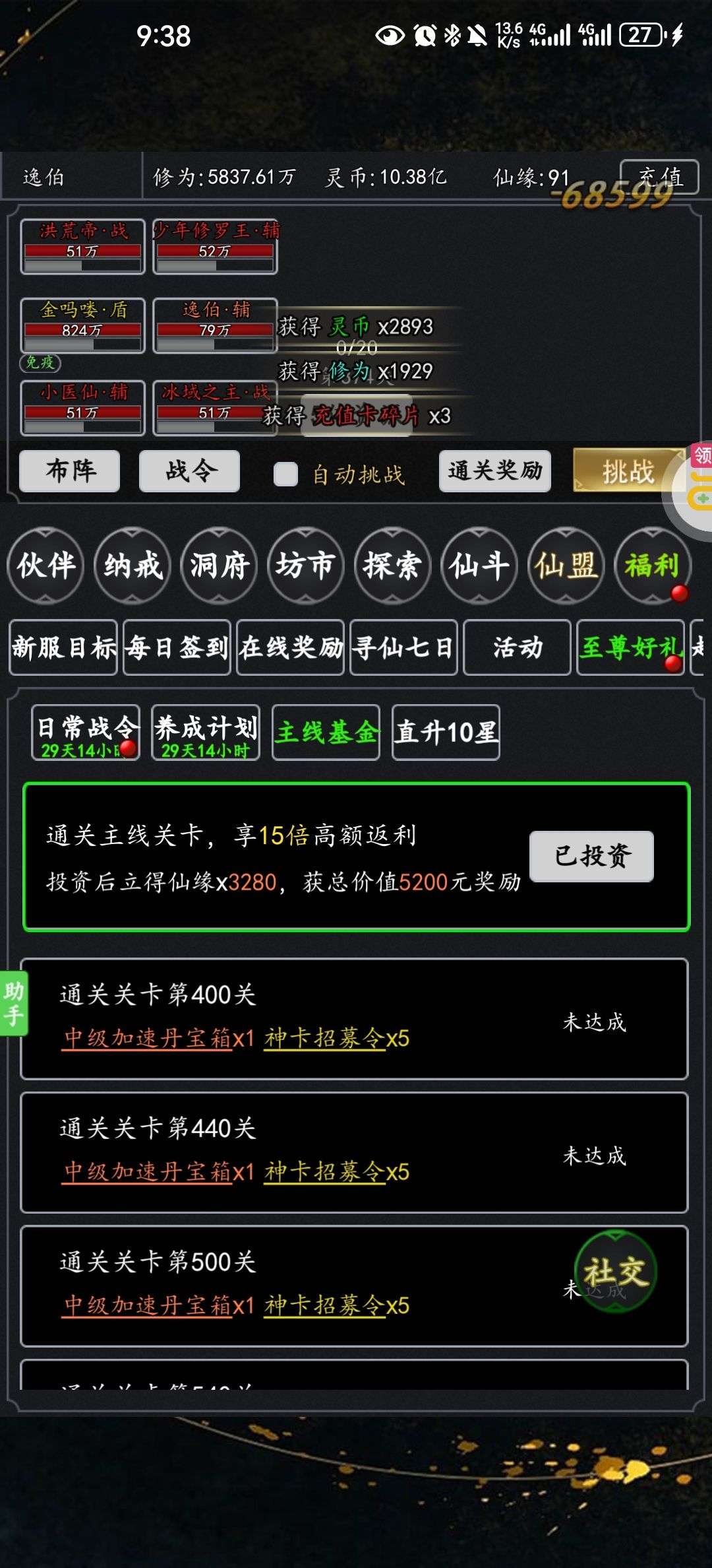 10万仙缘!47张500元充值卡!13张200元充值卡,其他充值卡也有。金色伙伴萧力,姬瑶,二郎真君,梦璇玑,星辰殿主,百草道人,火域公主,红萧力和舞蛇姬,750多天晶