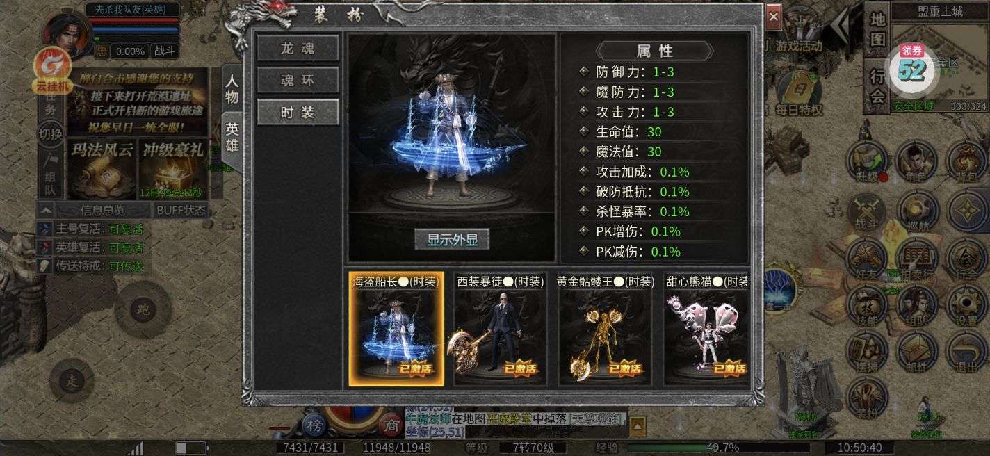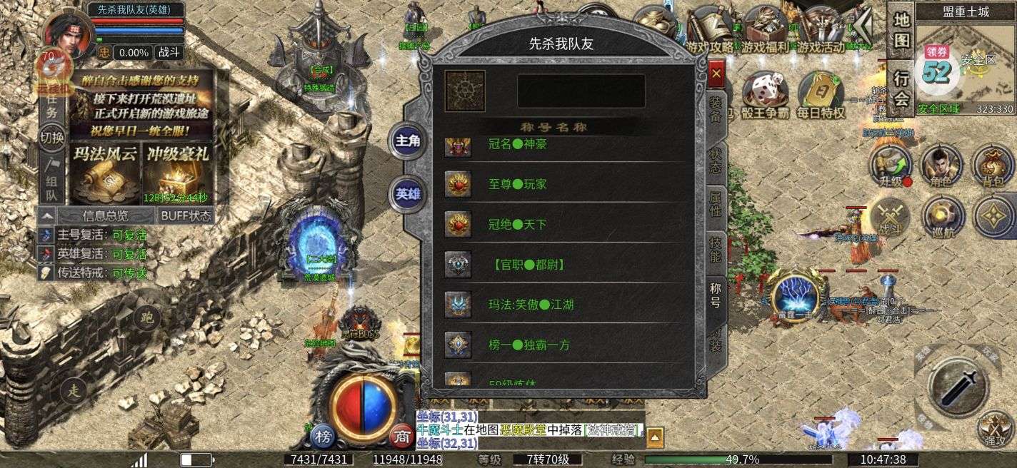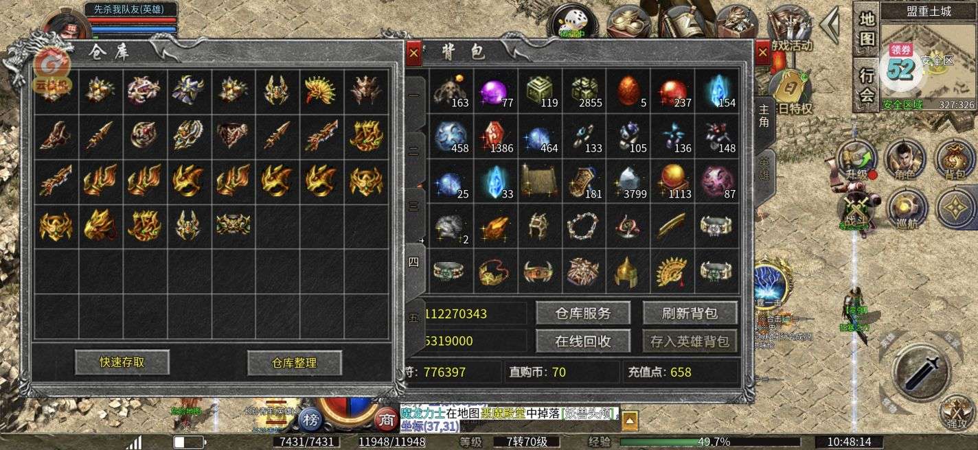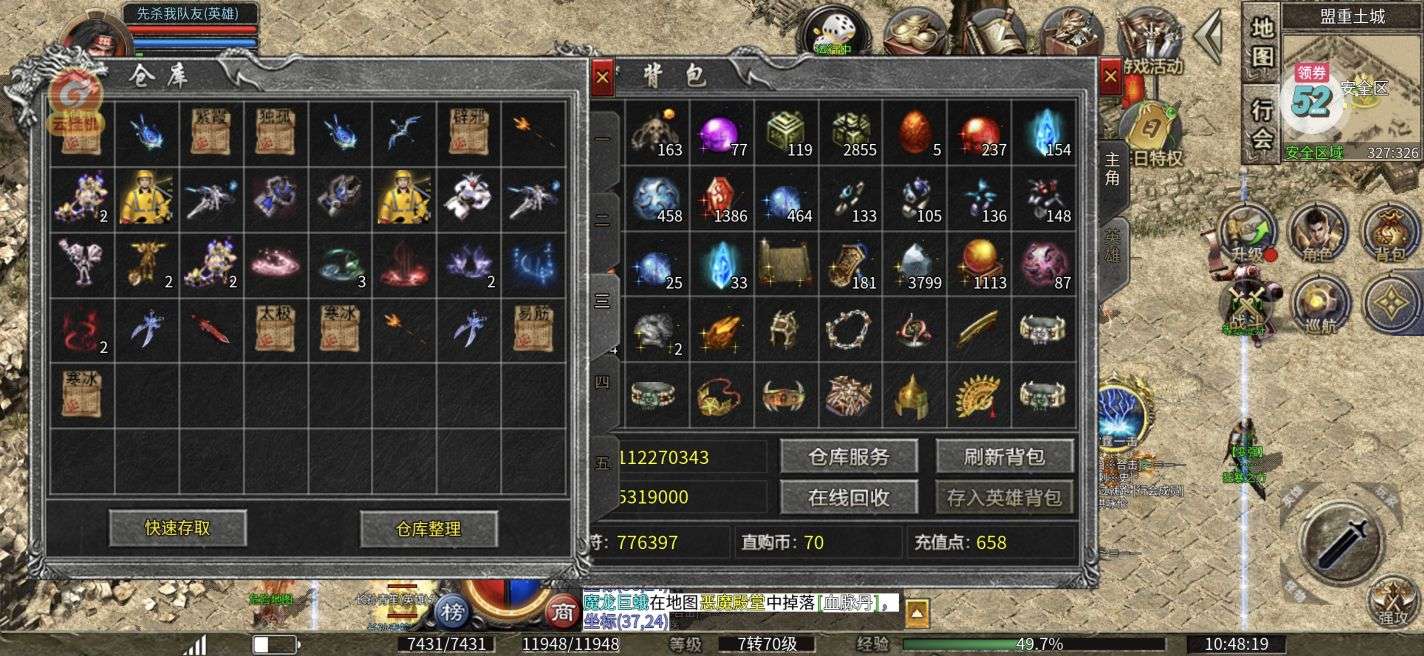 双70 ,打宝特权已开,冠名称号传送戒指都有,灵符元宝材料号上都有