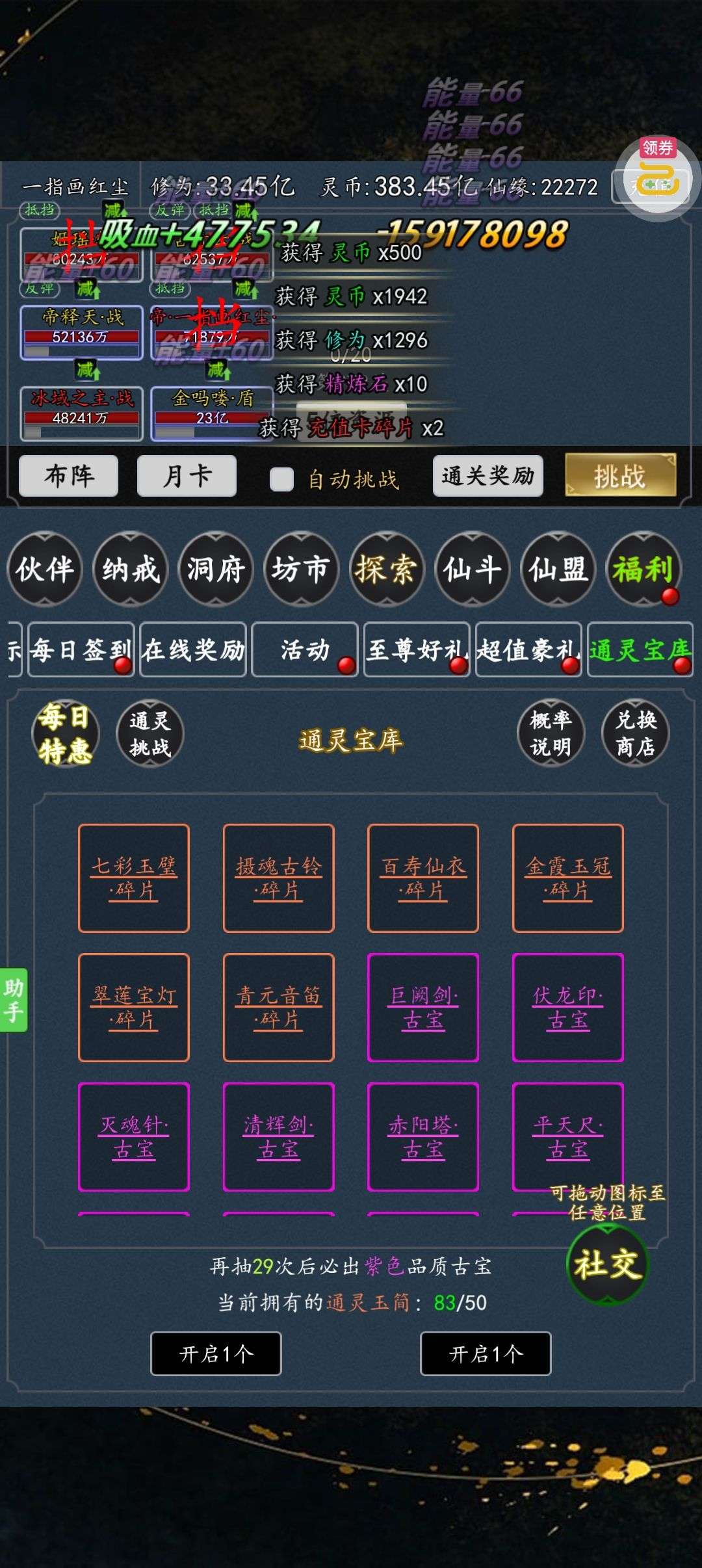 10万仙缘!47张500元充值卡!13张200元充值卡,其他充值卡也有。金色伙伴萧力,姬瑶,二郎真君,梦璇玑,星辰殿主,百草道人,火域公主,红萧力和舞蛇姬,750多天晶
