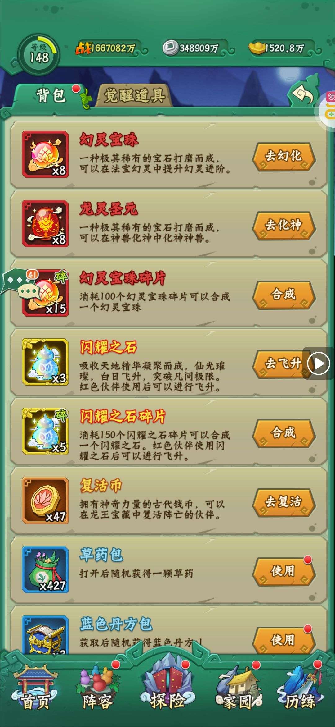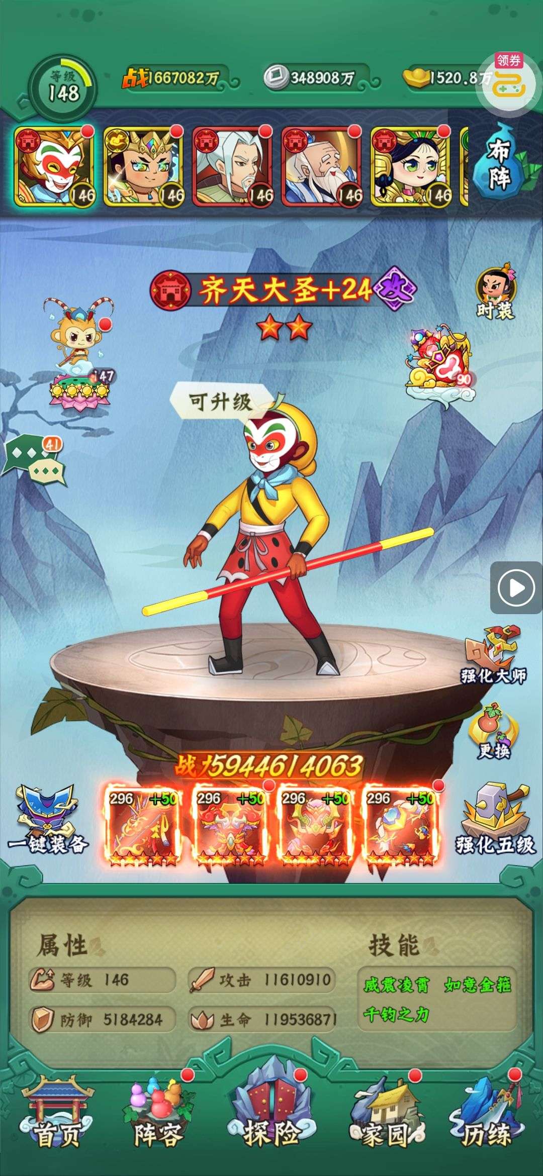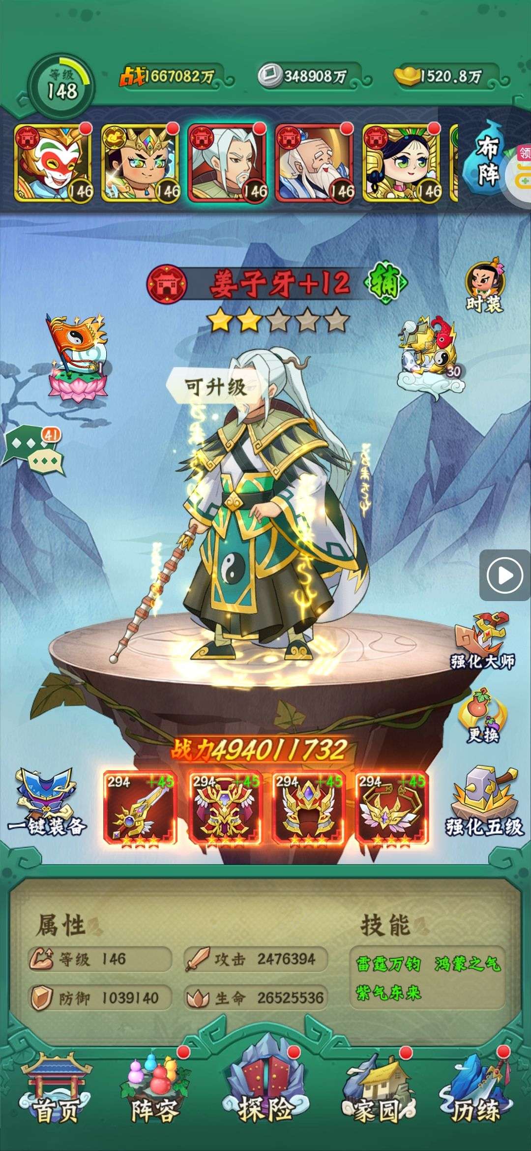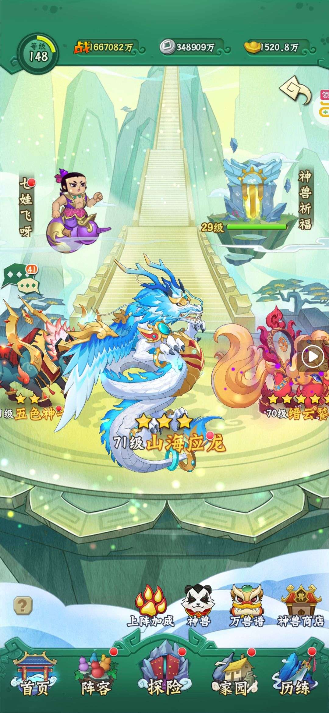 等级:130,战斗力:204201万,伙伴479个,全都有,妖怪除外,全部都10阶起步,上阵的都是15阶,爷爷12阶,姜子牙11阶,神兽,12只全都有,且2星。