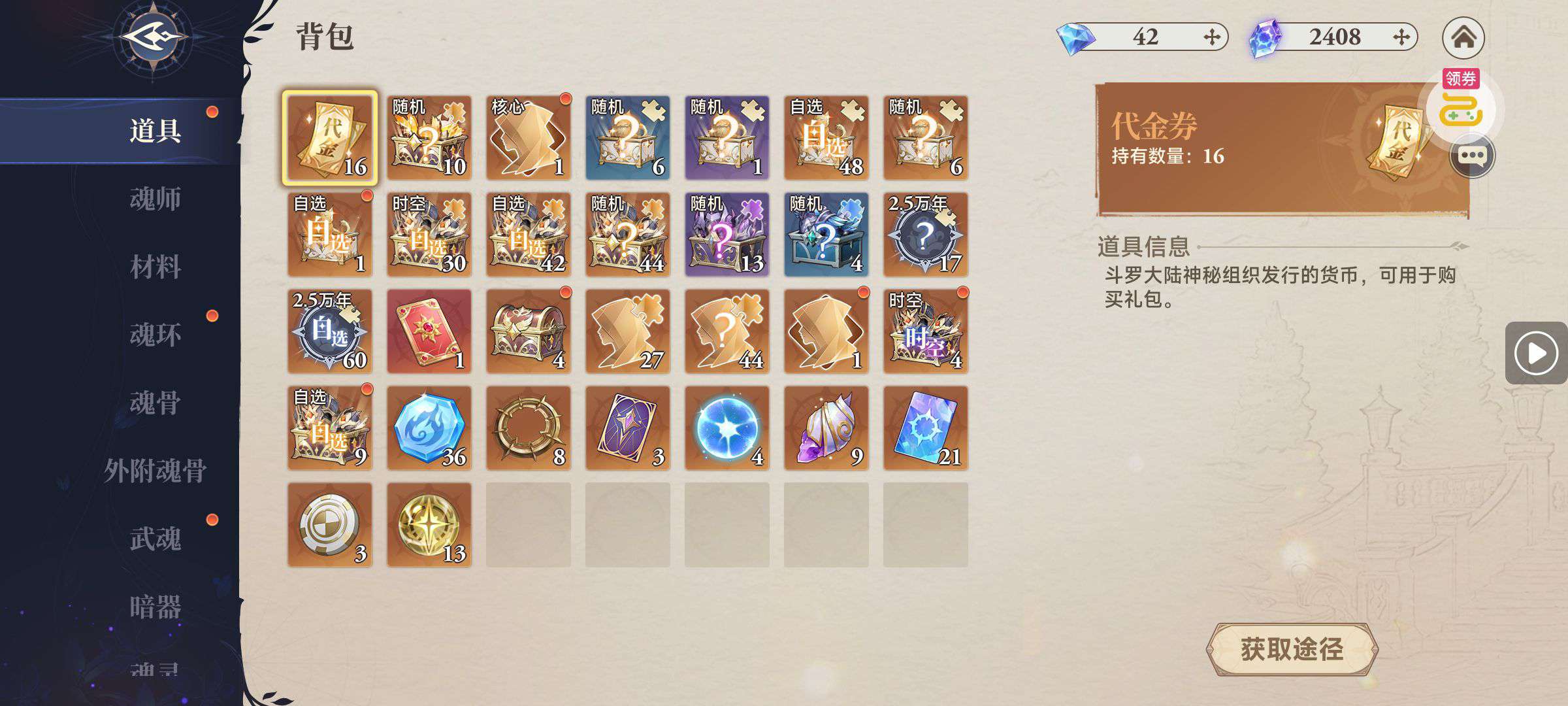 魂晶*888,魂师召唤券*10,武魂水晶*5(每个账号限领一次)