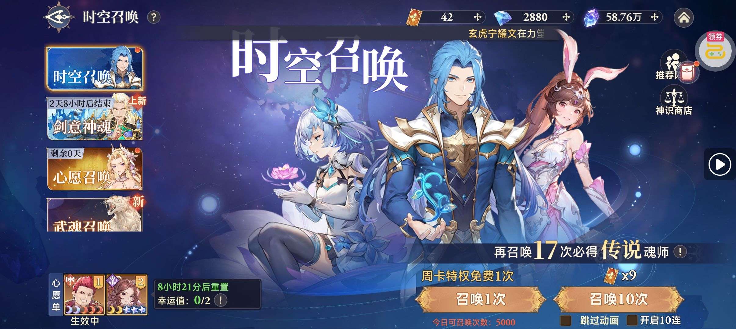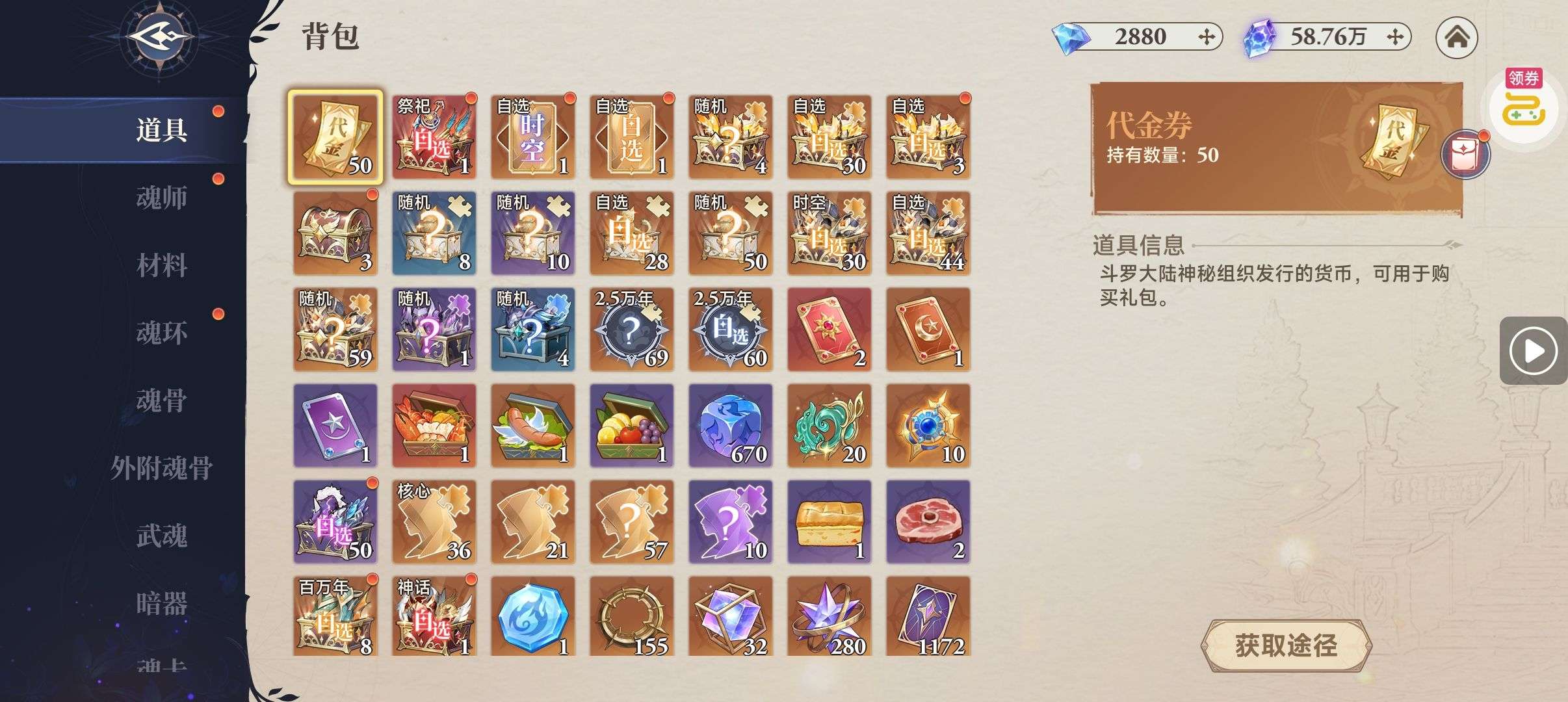 魂晶*888,魂师召唤券*10,武魂水晶*5(每个账号限领一次)