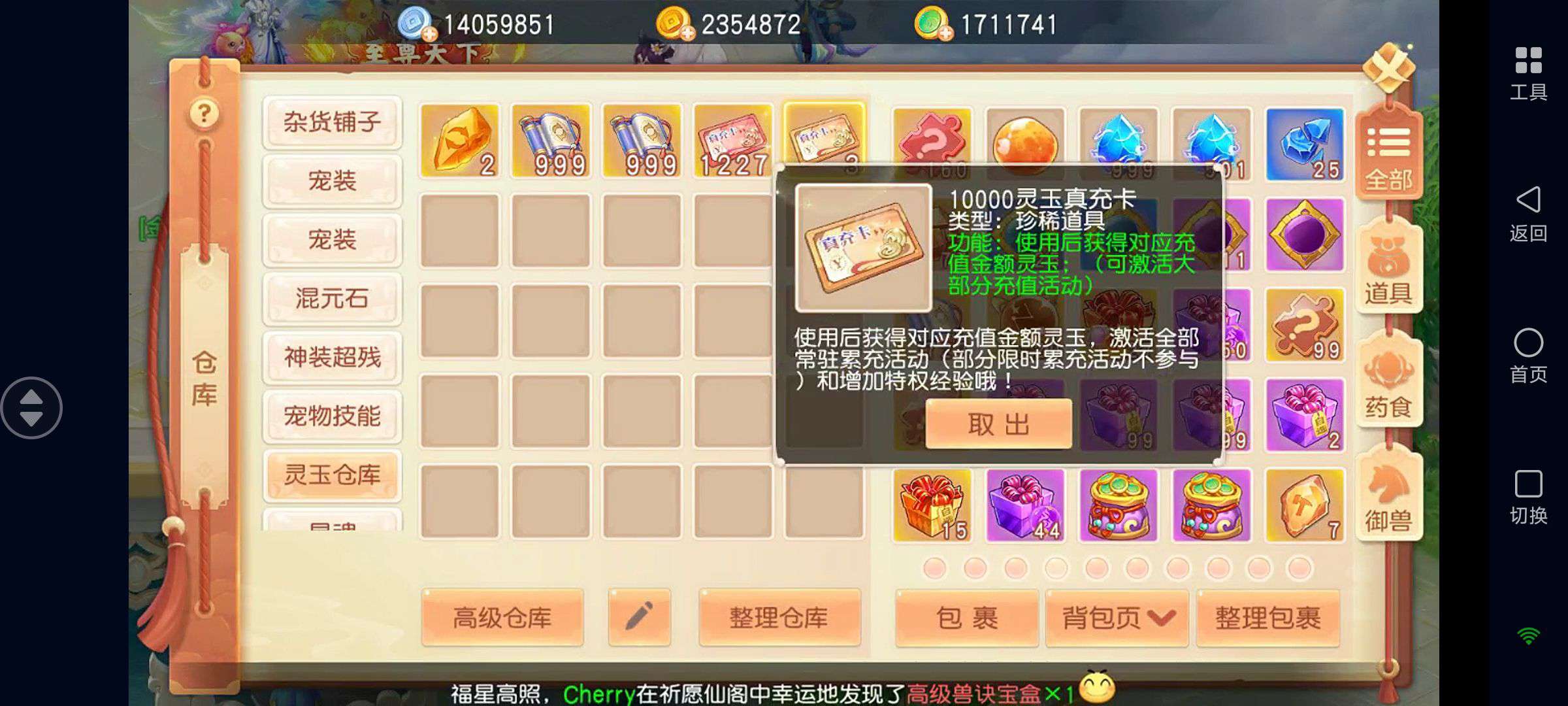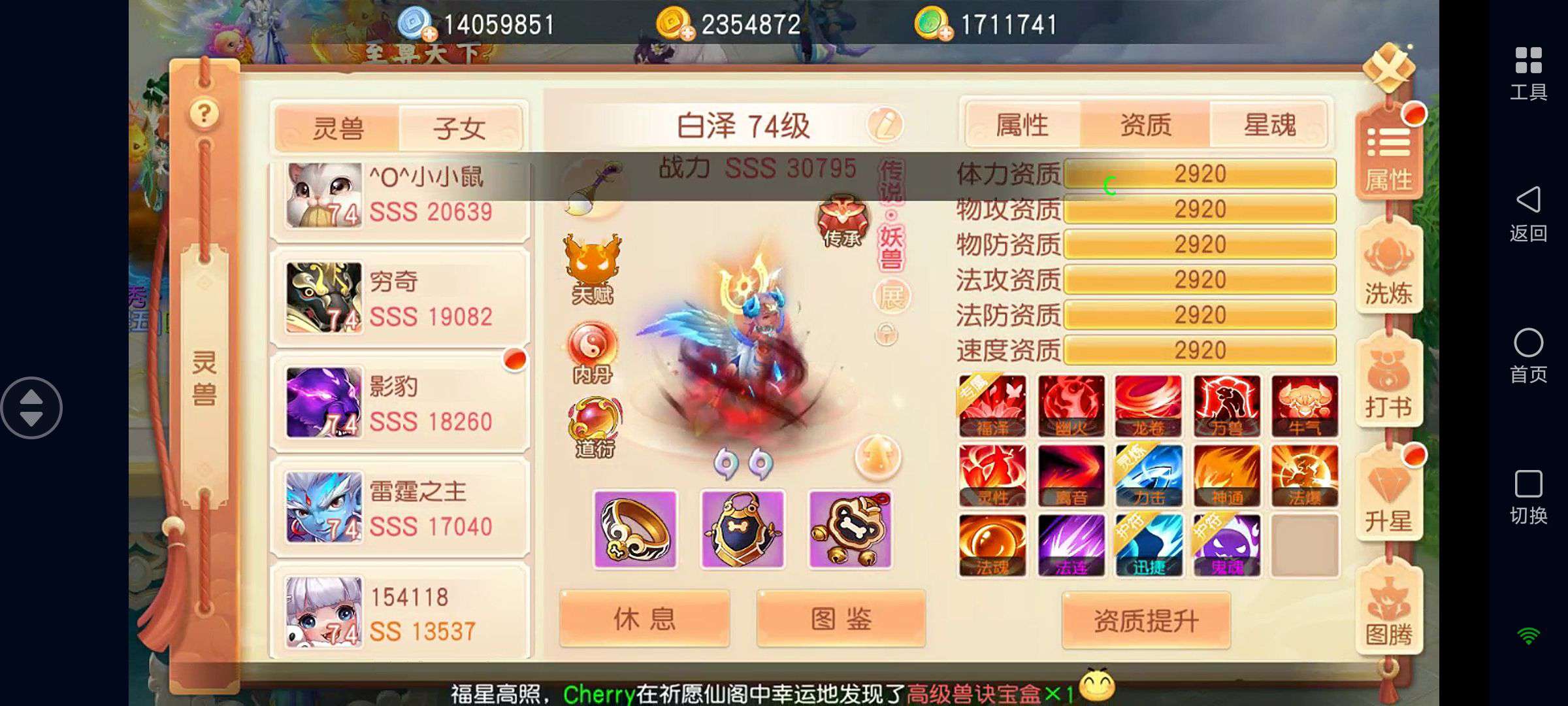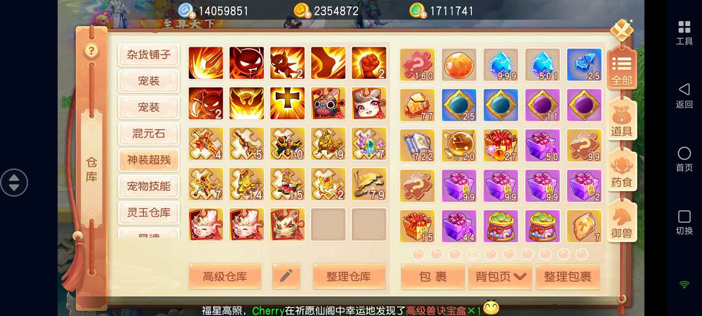 如图!装备全是灵兽增伤特效,其他仓库基本都是满的,各种资源都有……